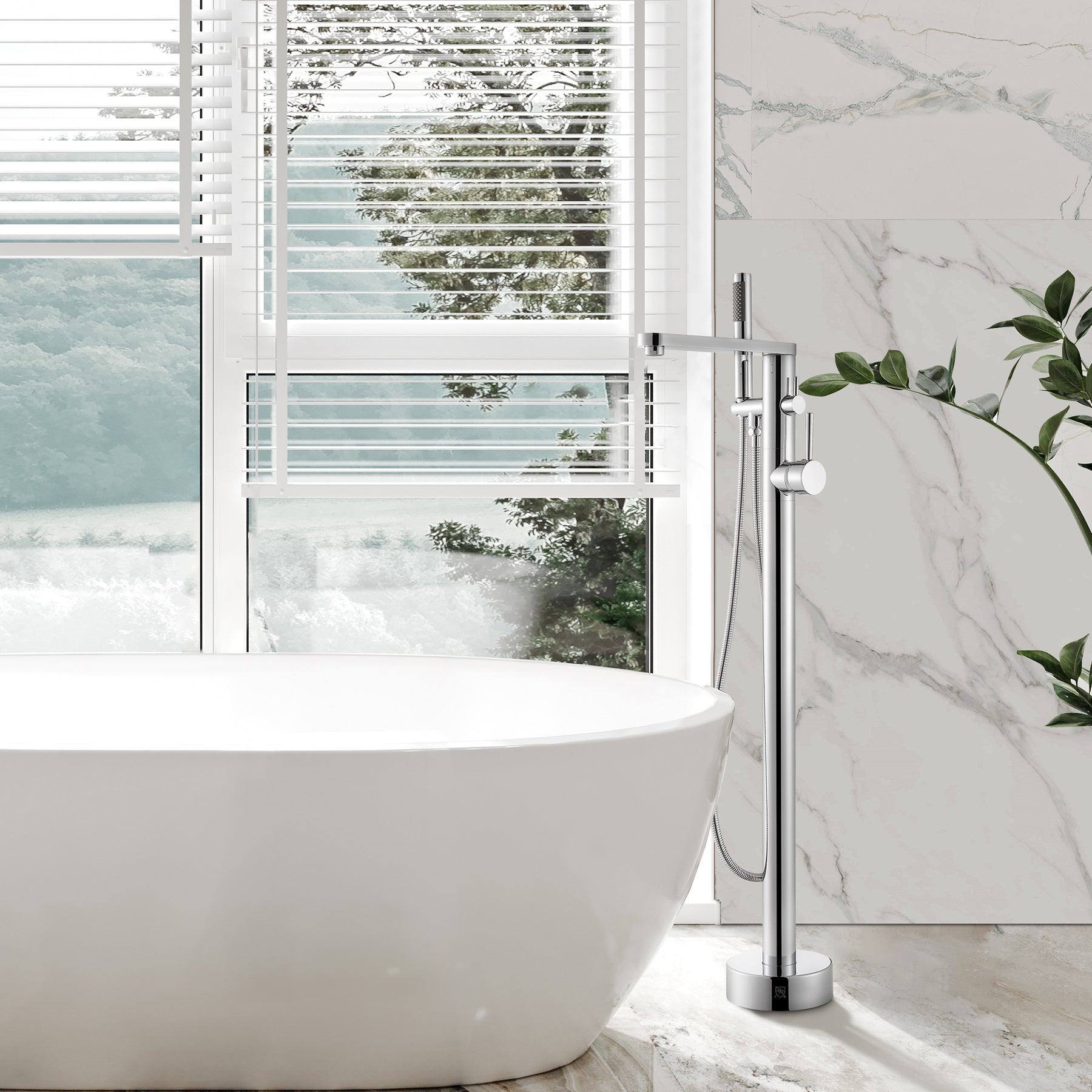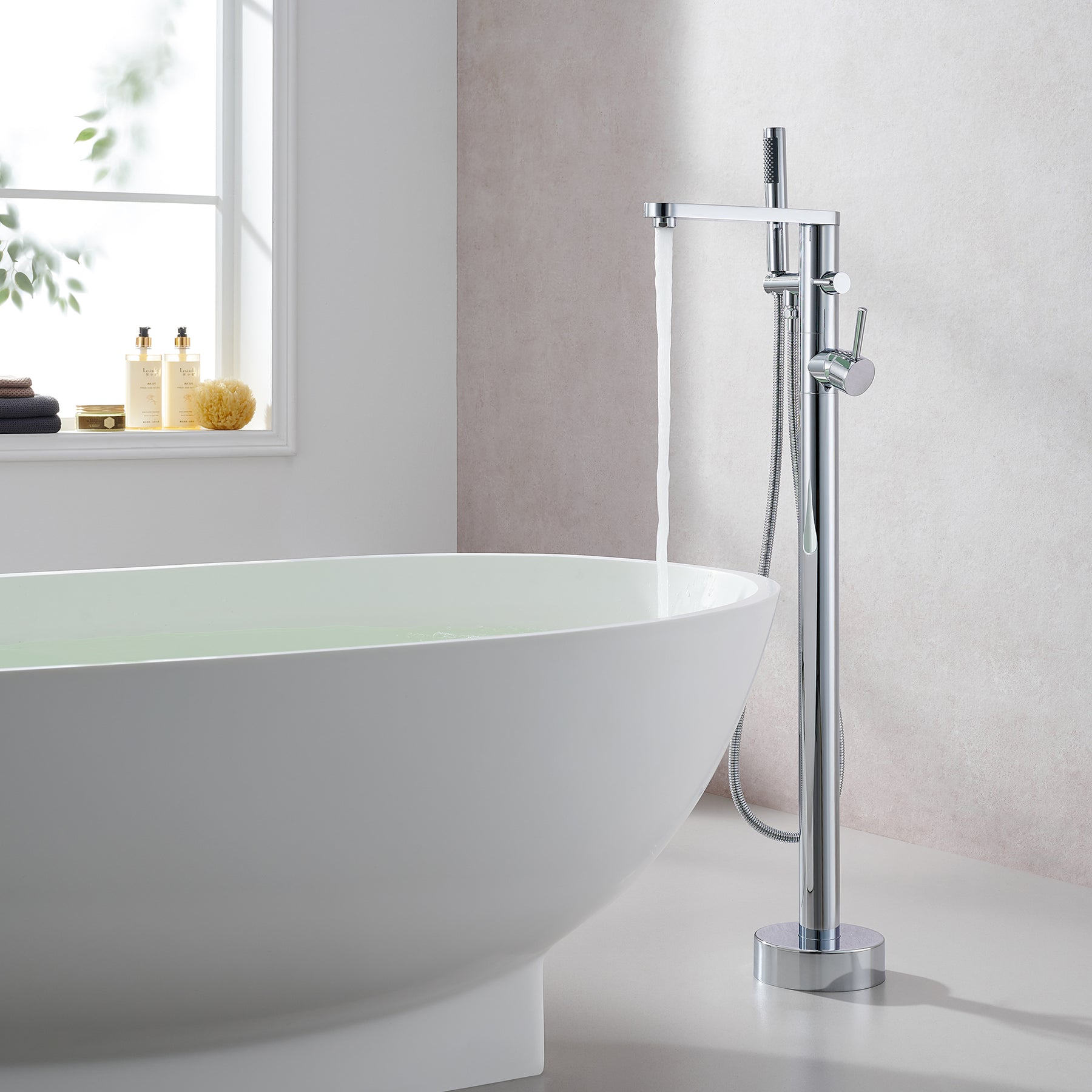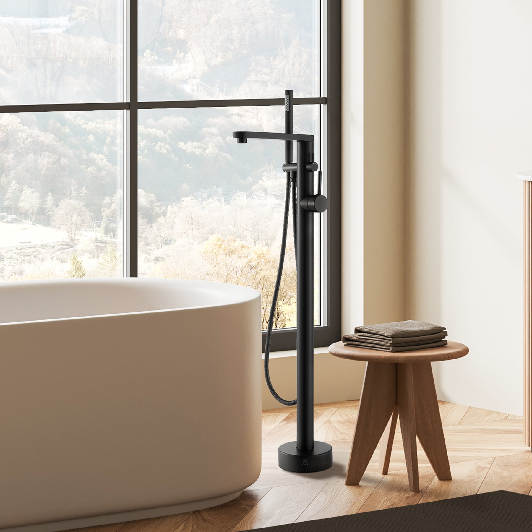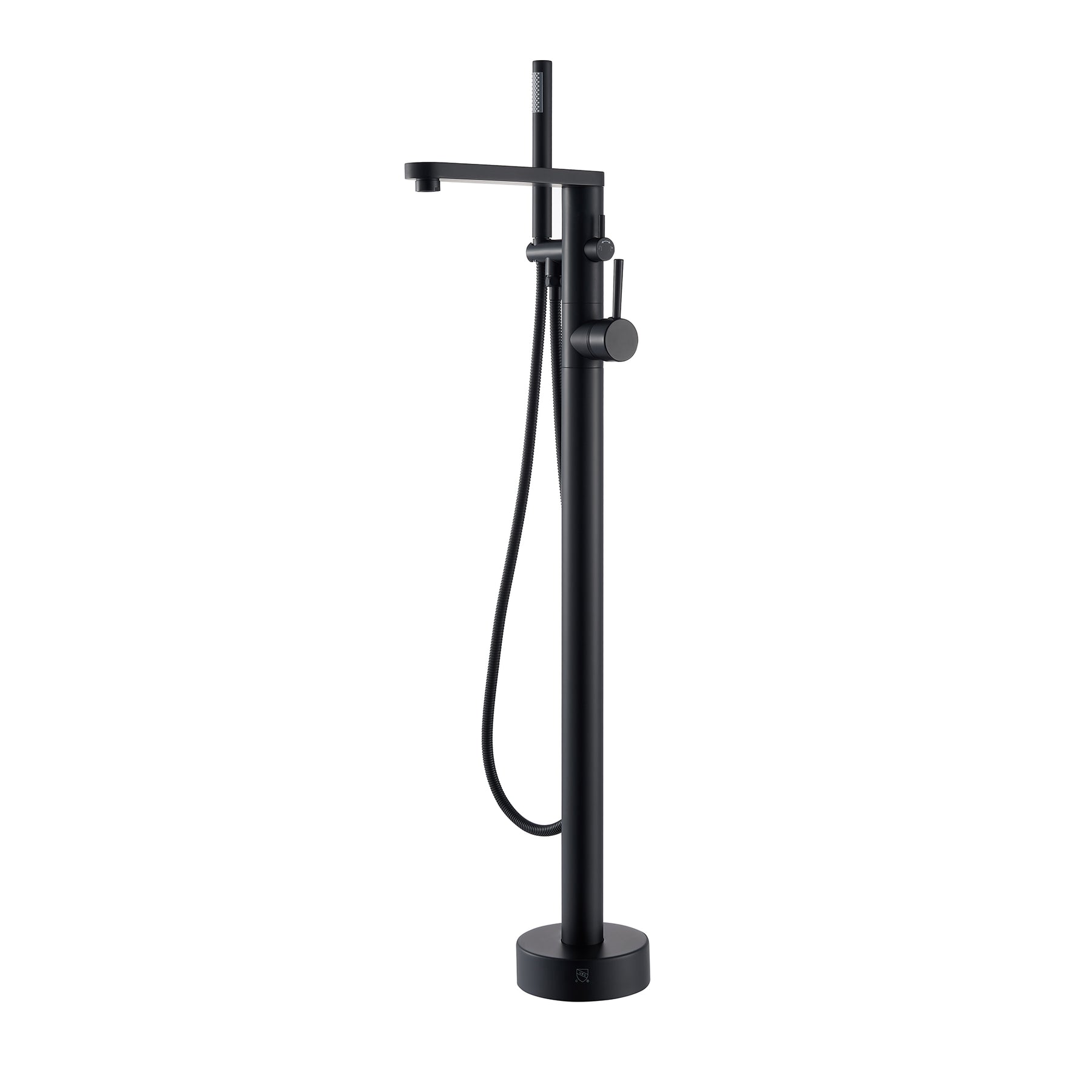 Enhance your bathroom with our Allario freestanding tub faucet that comes in your choice of Matte Black and Polished Chrome for a sleek, modern, and minimalist look. The faucet features a tall, angular spout for effortless bathtub filling, complemented by a cylindrical base and smooth lines. It’s integrated hand shower, offers an added convenience and versatility for your bathing experience.