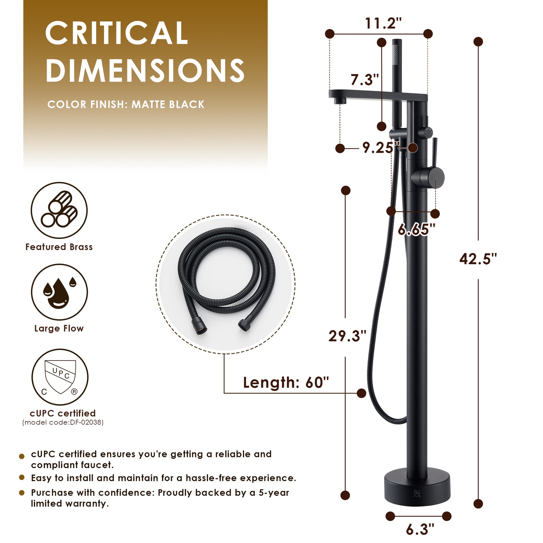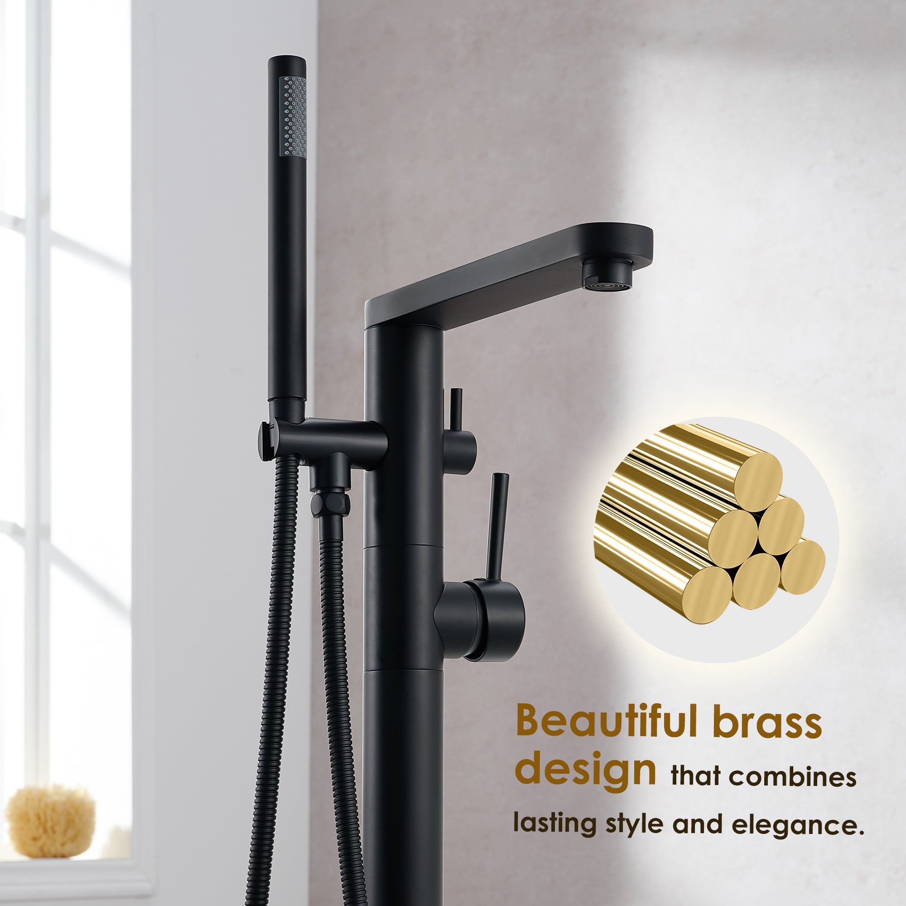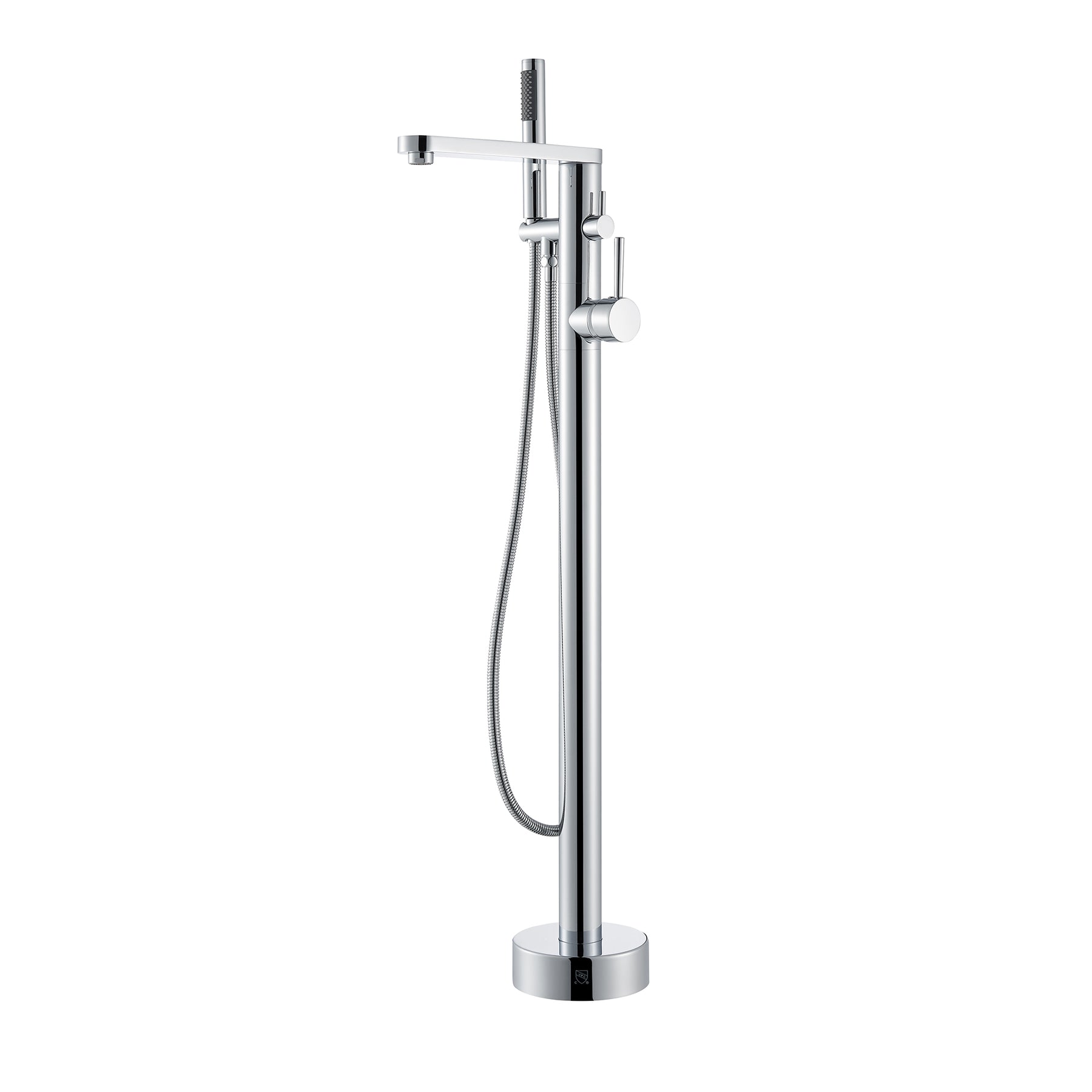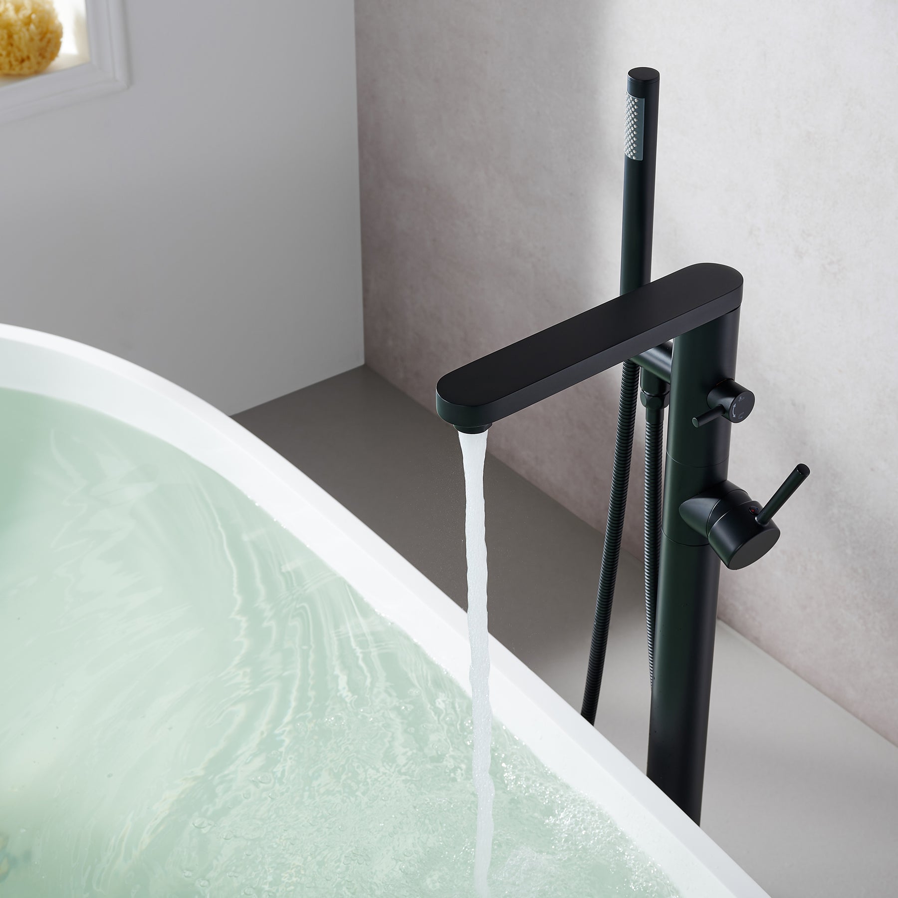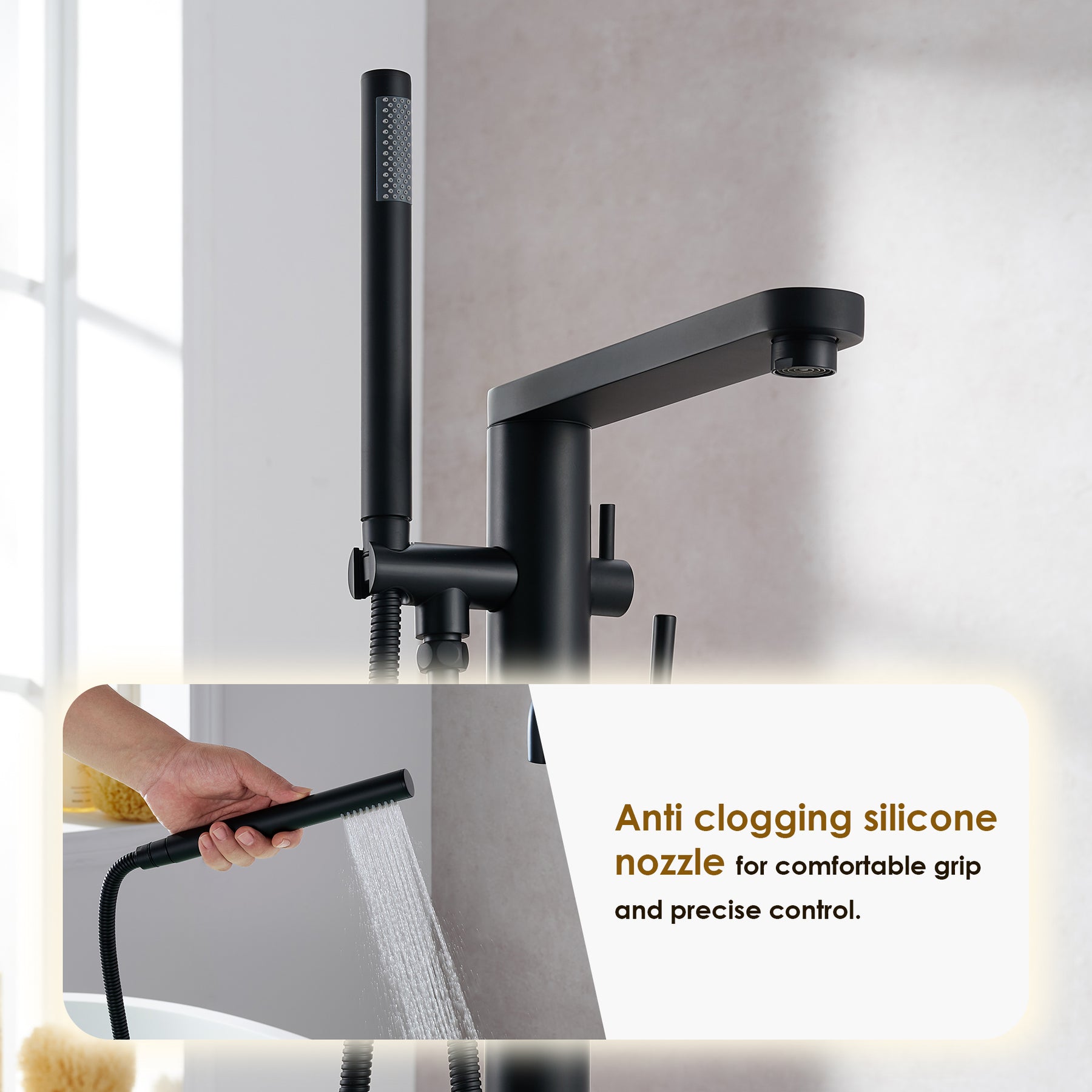 Enhance your bathroom with our Allario freestanding tub faucet that comes in your choice of Matte Black and Polished Chrome for a sleek, modern, and minimalist look. The faucet features a tall, angular spout for effortless bathtub filling, complemented by a cylindrical base and smooth lines. It’s integrated hand shower, offers an added convenience and versatility for your bathing experience.