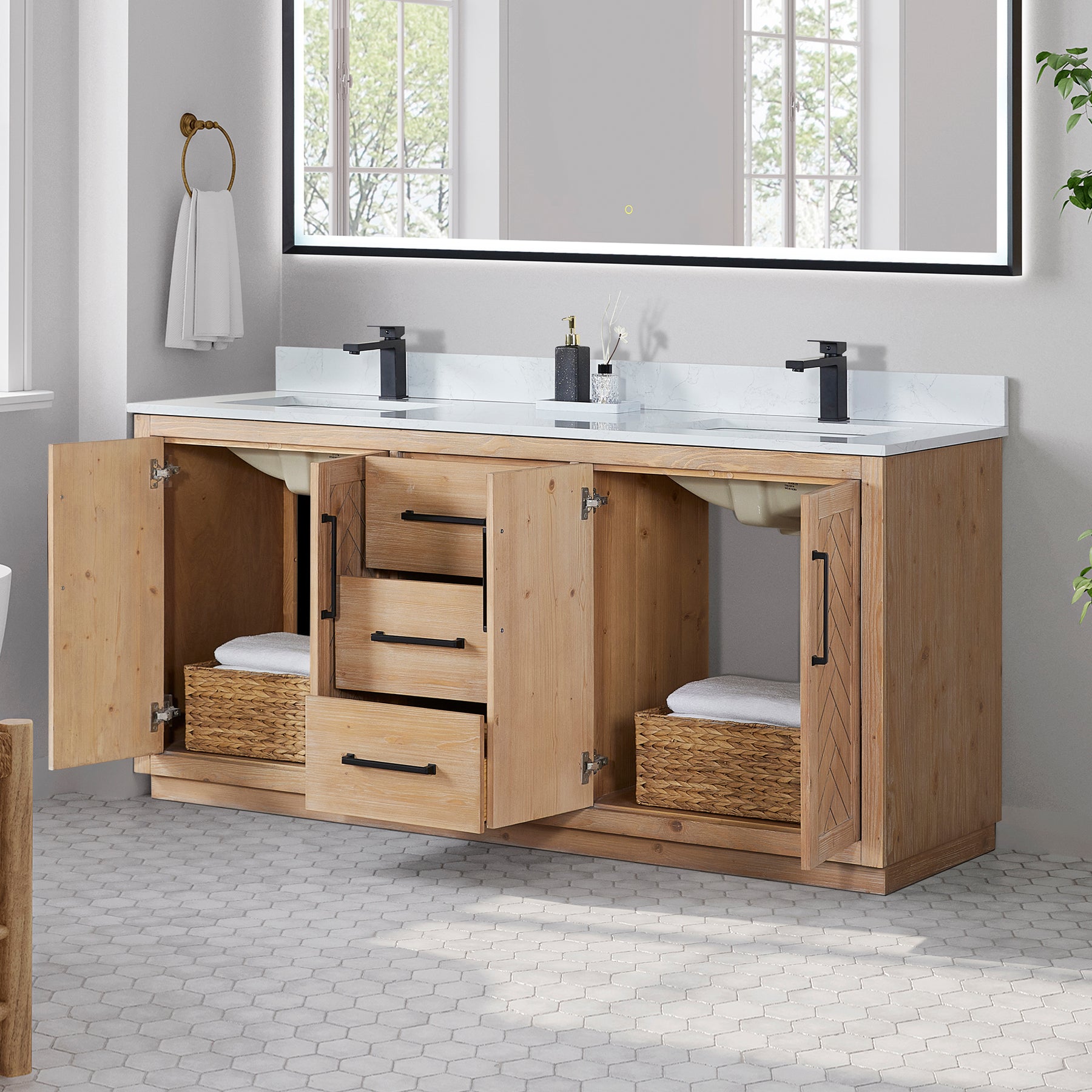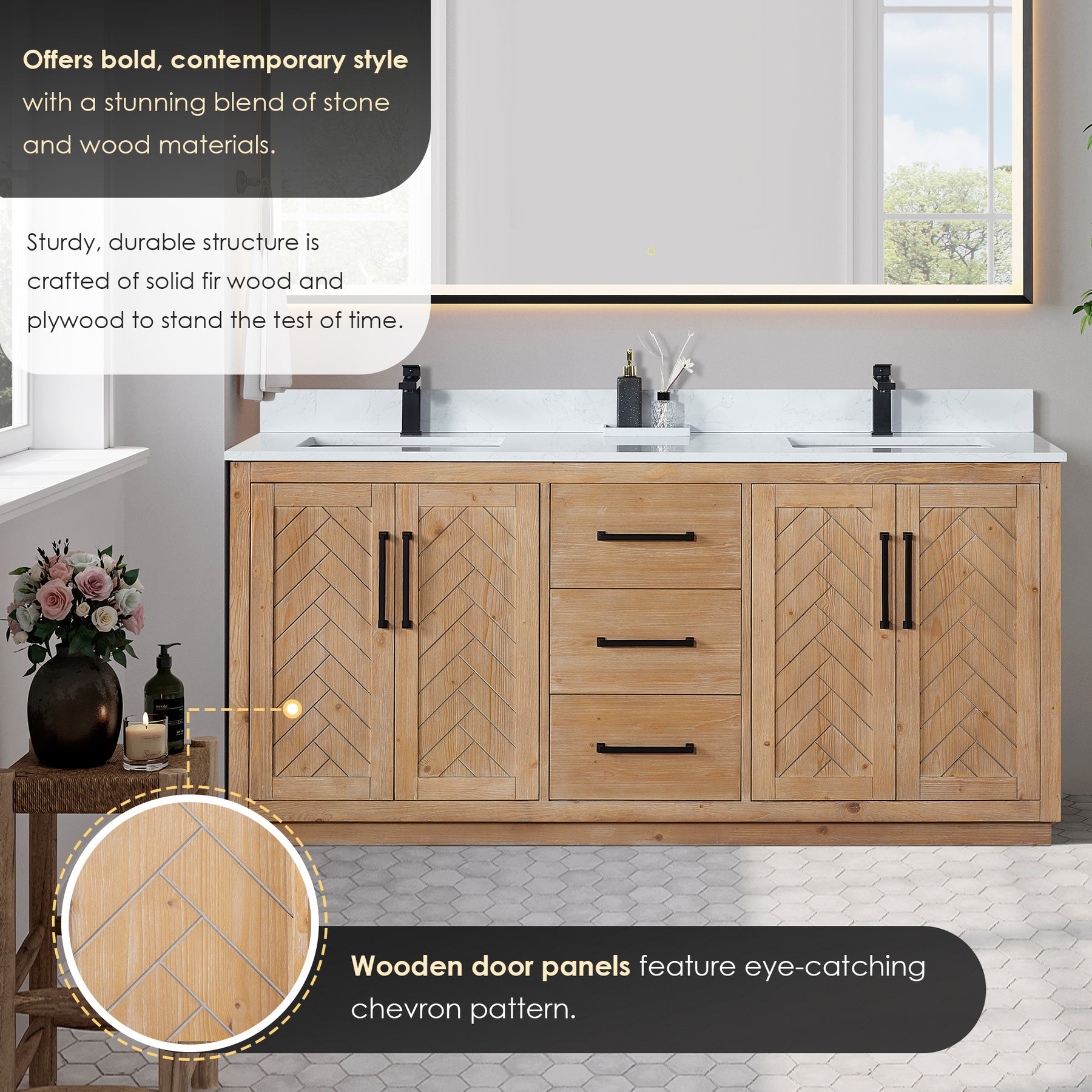 • Hardware: Wooden door panels feature eye-catching chevron pattern.