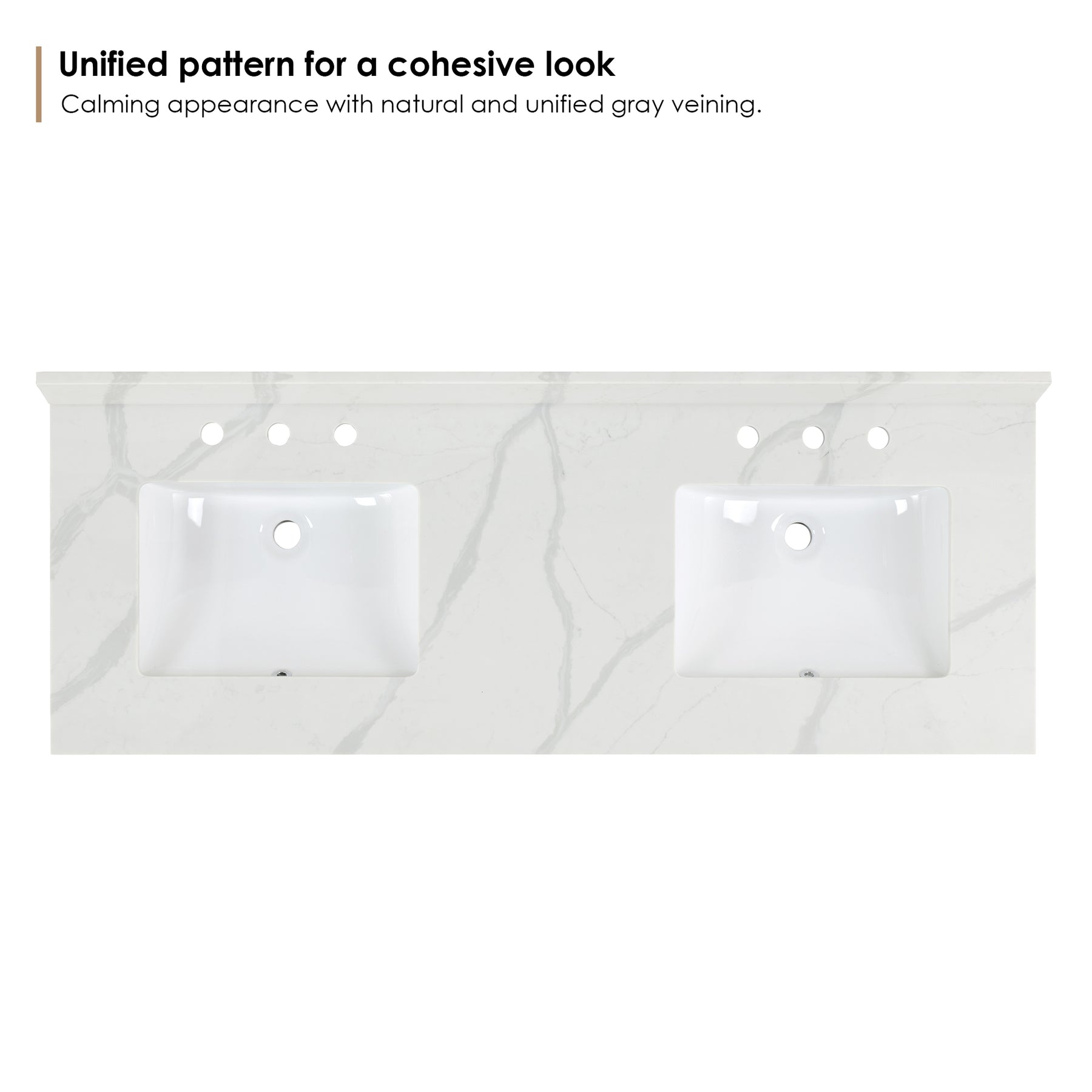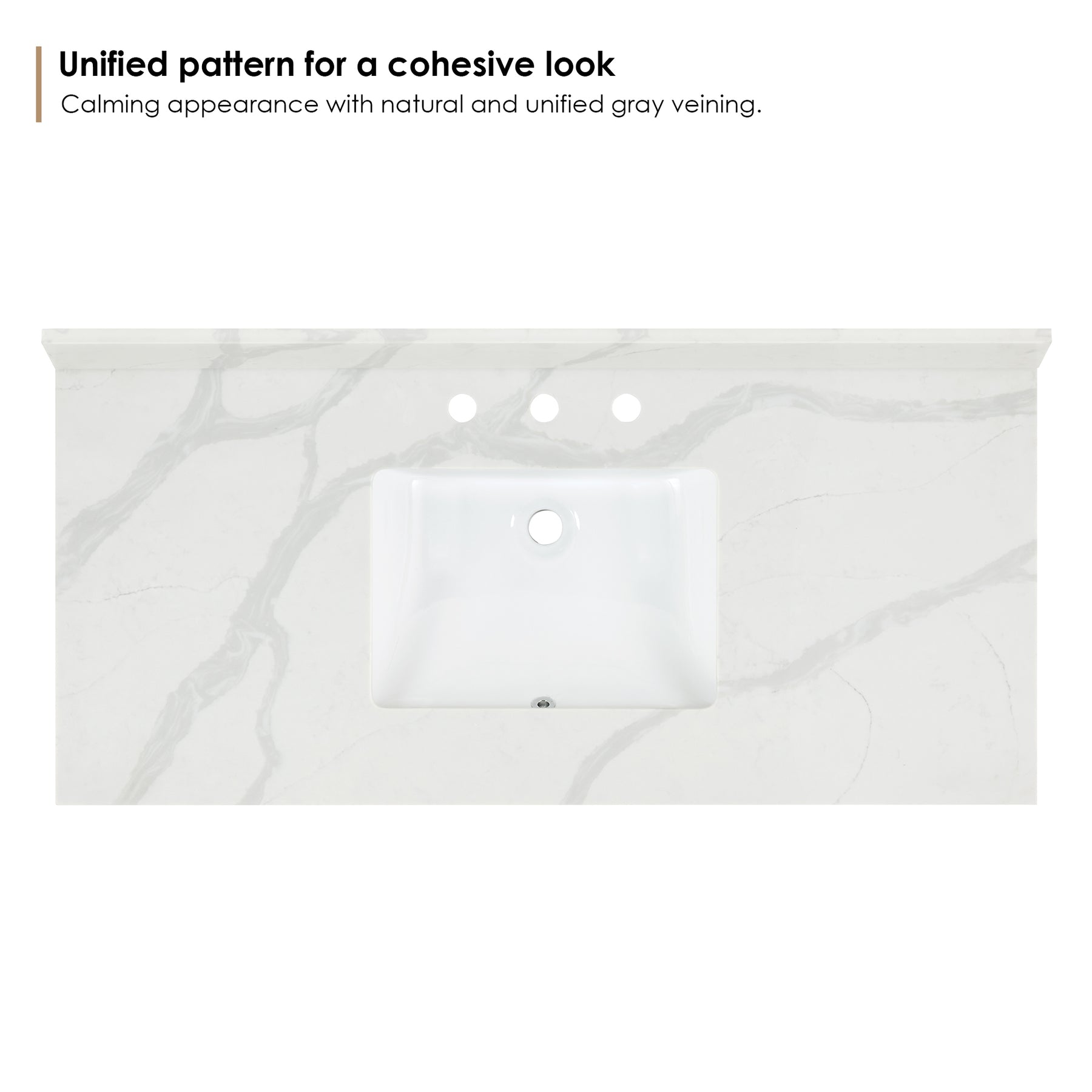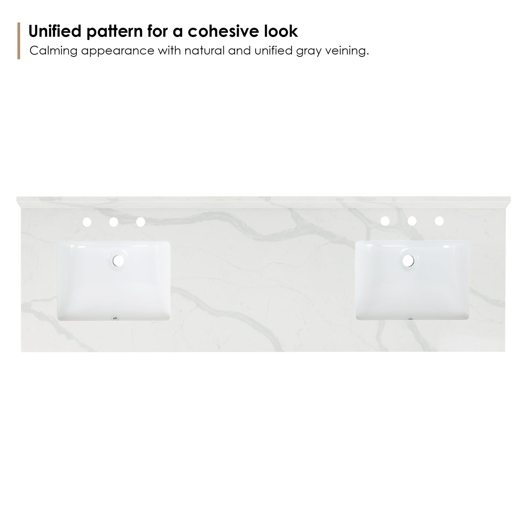 Renovate your bathroom with our elegant bathroom vanity top? Our Arbios quartz countertop marries the timeless allure of Calacatta marble design with all the unbeatable benefits of quartz. Featuring an exclusive unified gray veining that graces both the countertop and backsplash, it adds a contemporary touch and a harmonious visual flow in your space. Enjoy the beauty of marble with the strength of quartz, as the Arbios resists stains and scratches. This surface confidently enhances the enduring beauty and functionality of your space, making it an ideal fit for those who seek both.
