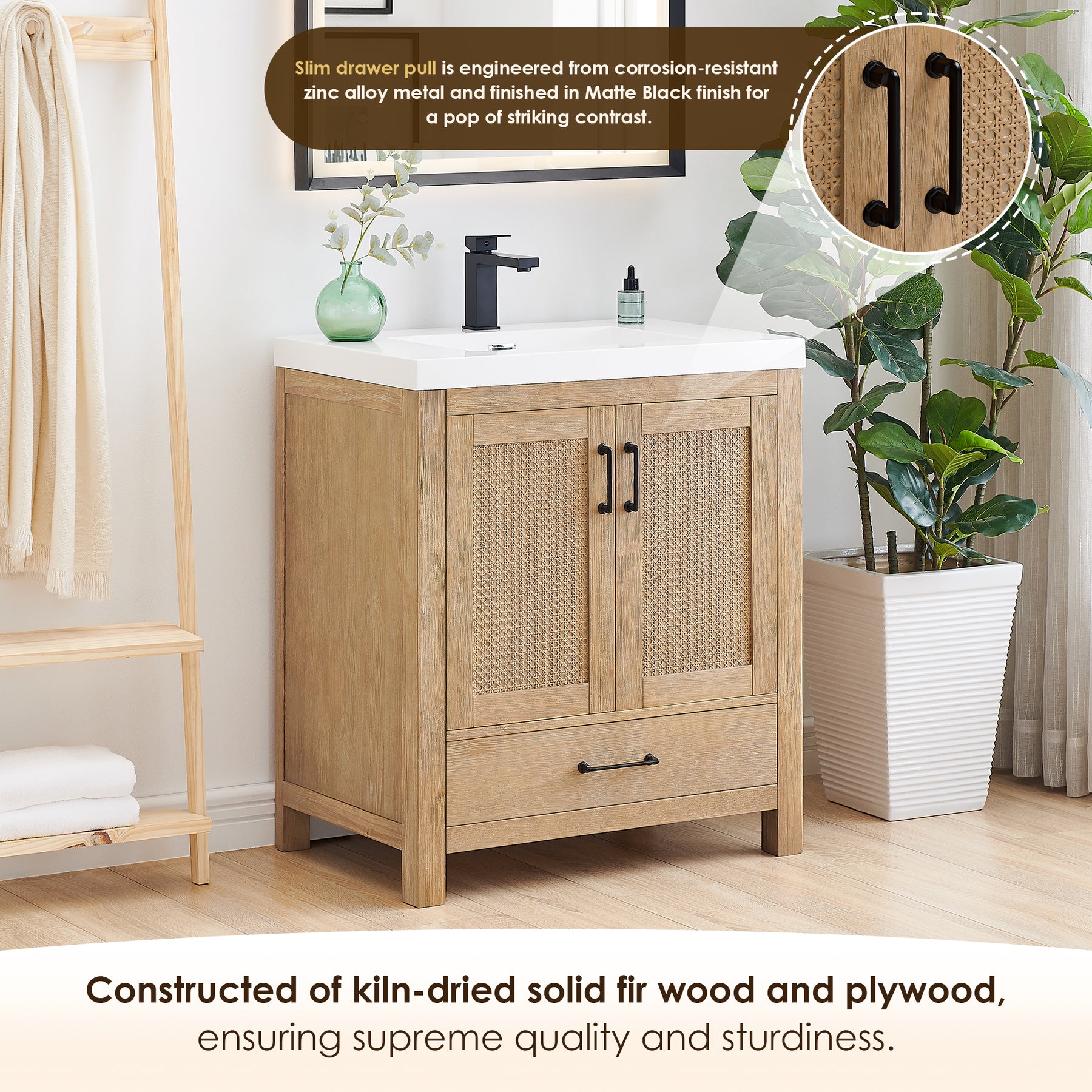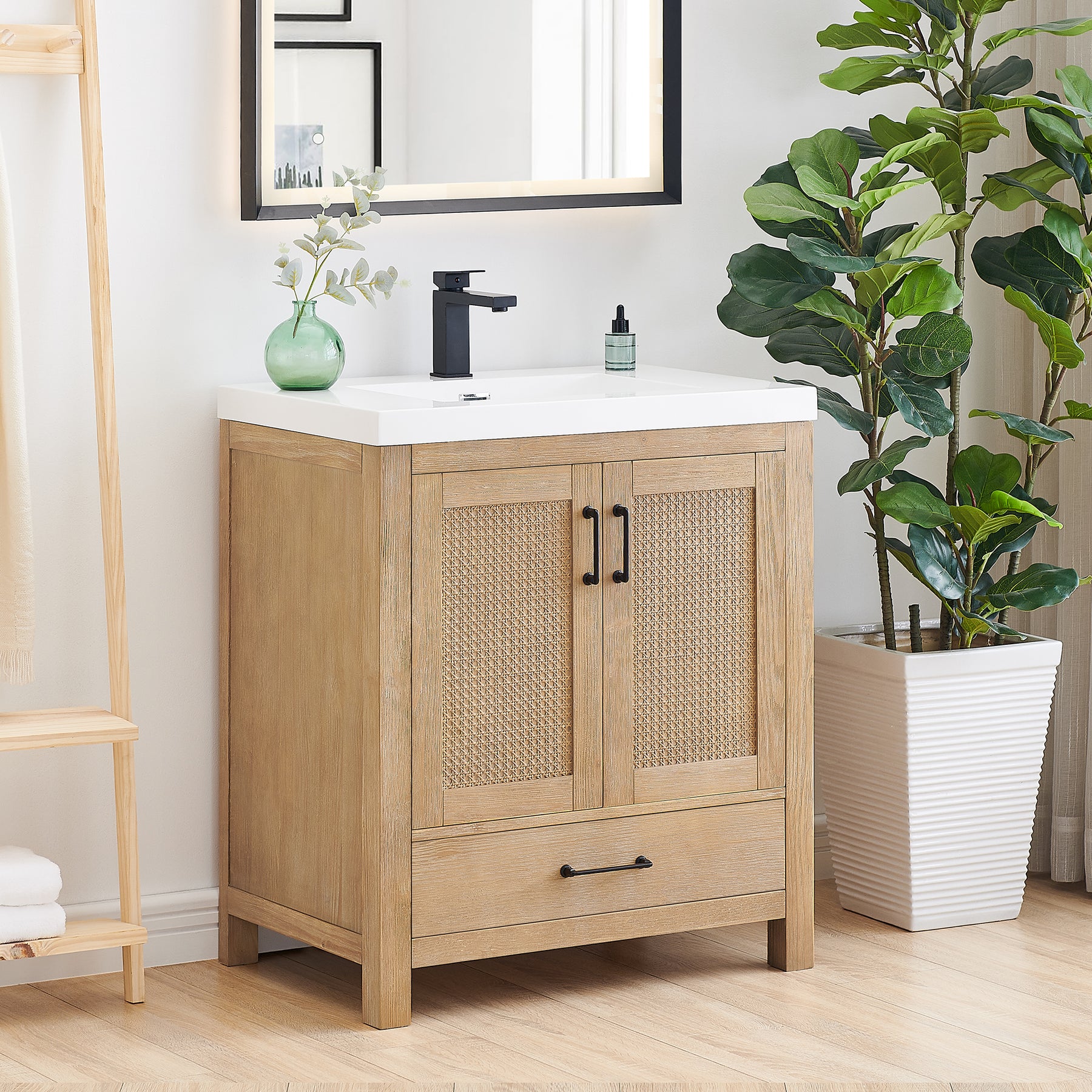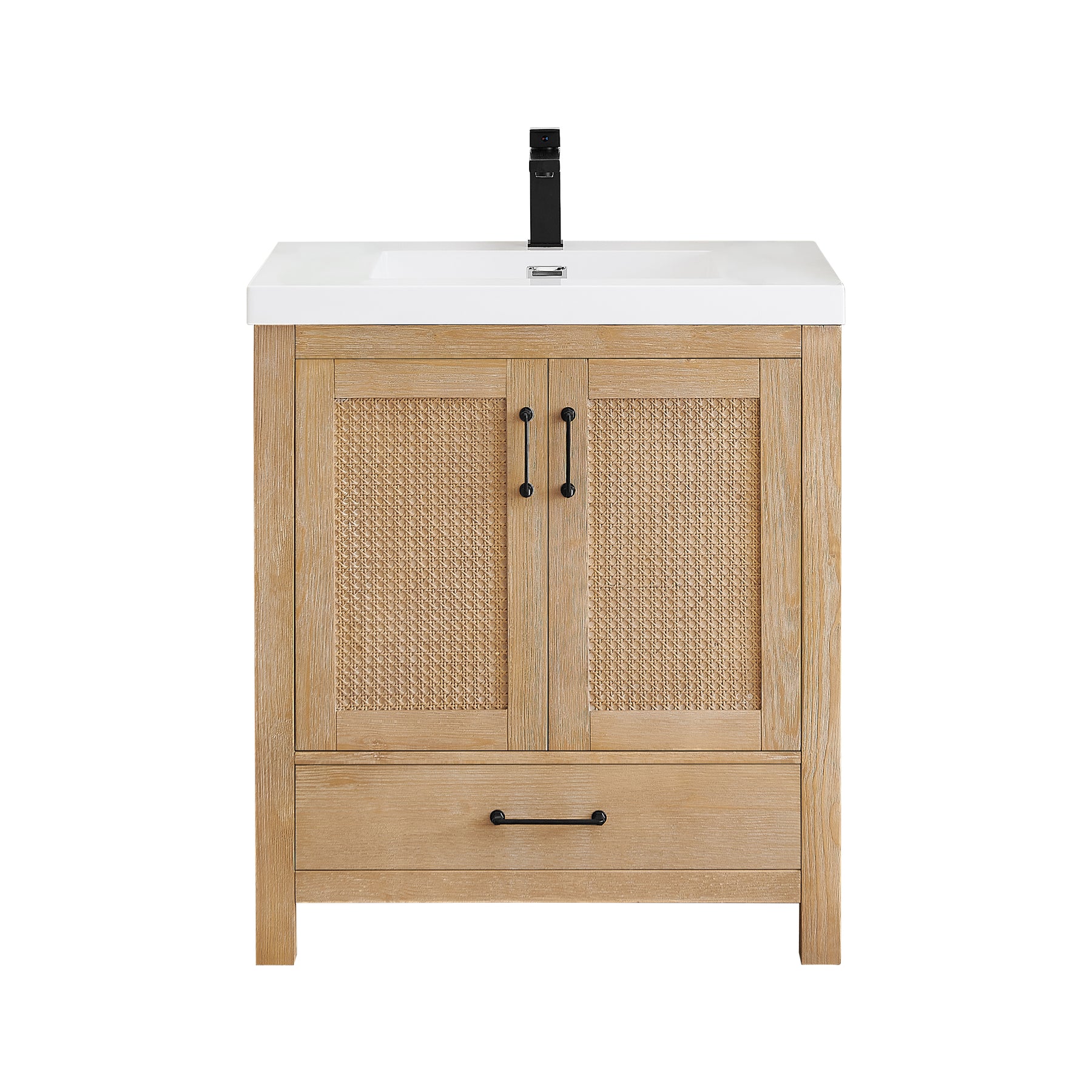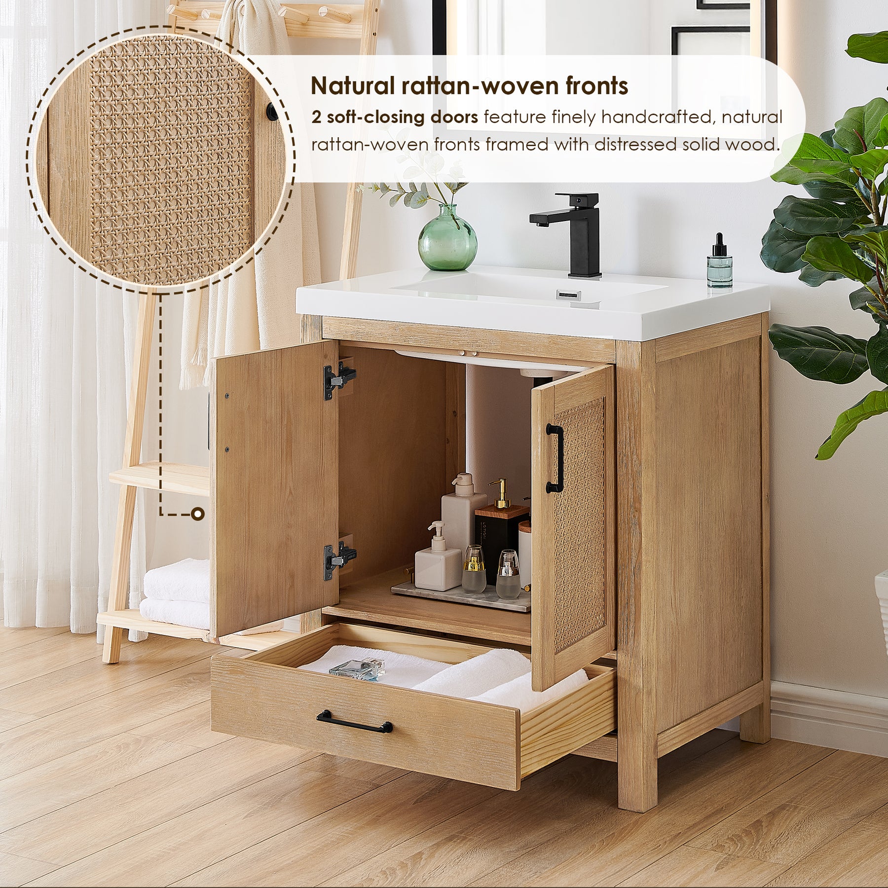 Incorporate the beauty of nature into your bathroom with our Bondi Vanity. Woven from natural rattan, this beautiful bathroom cabinet is intricately handcrafted to showcase the fine details. For your convenience, the sink is designed to keep the bathroom dry and tidy from water spills with its show stopping curved edge barrier. Its countertop is designed with a classic white basin- adding a versatile and timeless touch for any creative bathroom remodel.