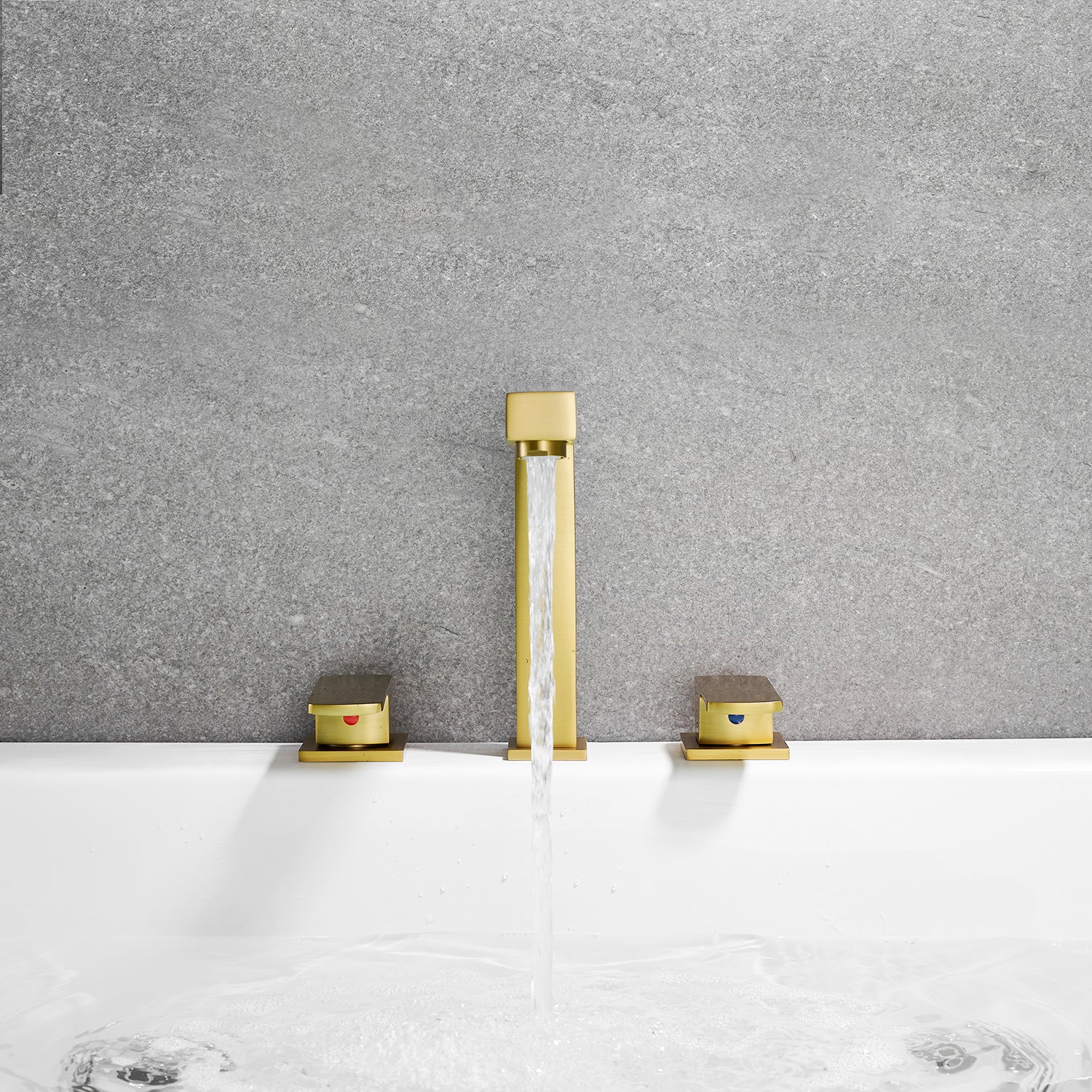 Add class and contemporary style to your bathroom space with our Calden Bathtub Faucet. Featuring a gorgeous golden finish, the Calden stuns with its straight lines and sleek design. It’s the epitome of simple sophistication, with two lever handles for precise control of water temperature and flow. This faucet is crafted of solid brass with a ceramic disc cartridge that ensures long-lasting beauty and drip-free performance.