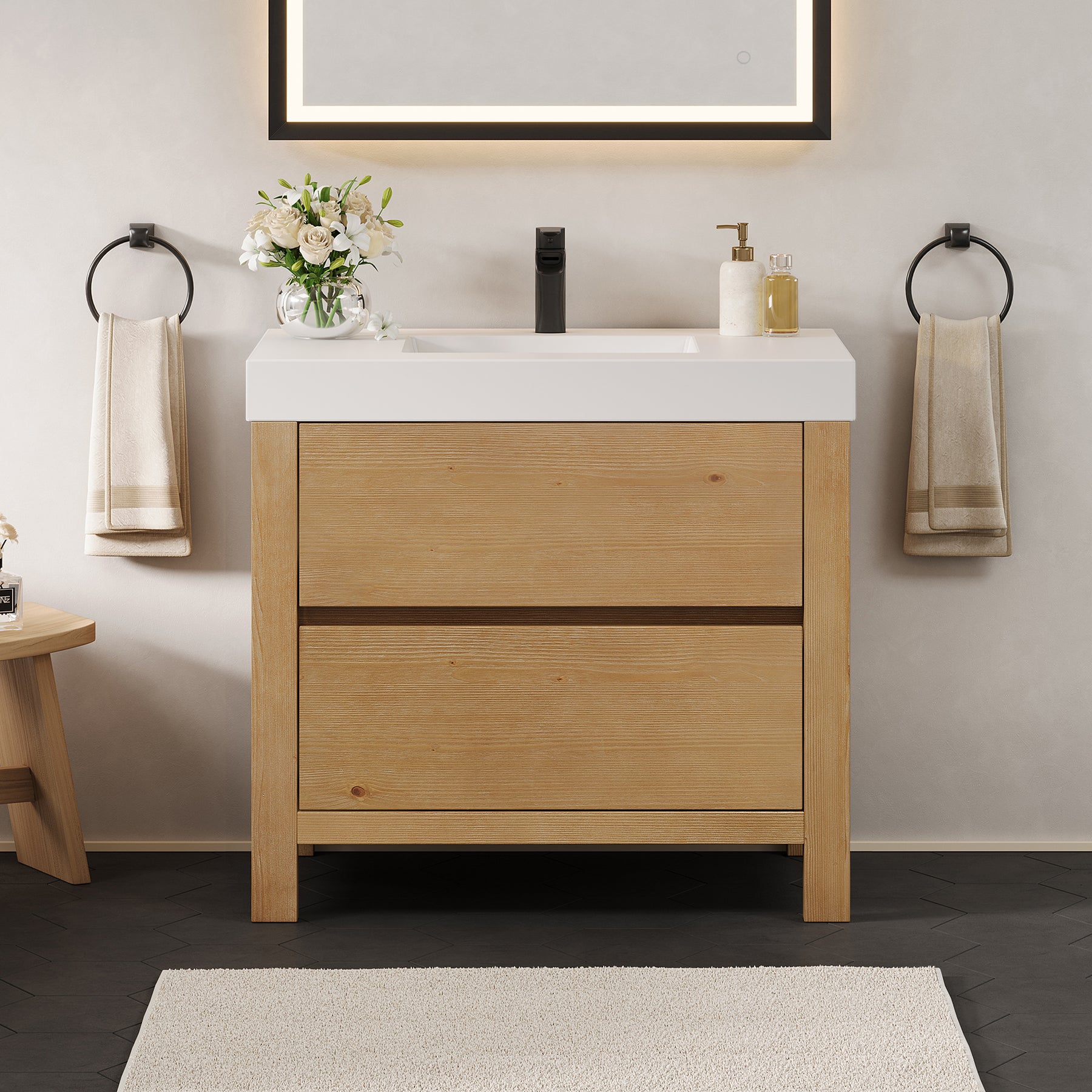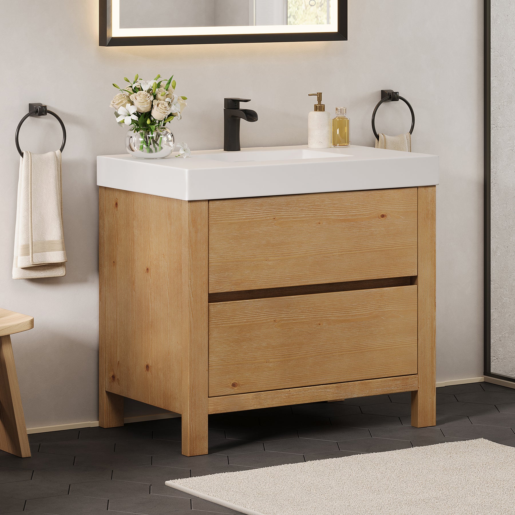 Upgrade your private sanctuary with our Cascadia Series Bathroom Vanity, intelligently designed to merge versatile contemporary design with everyday practicality. This piece features a gleaming-white artificial-stone countertop with an integrated sink as well as sleek, handle-less drawer panels made of weathered fir veneer. Built for durability and longevity, the Cascadia also has ample storage to keep your essentials neatly tucked away. It offers striking good looks and high-impact style that instantly enhances any type of décor.