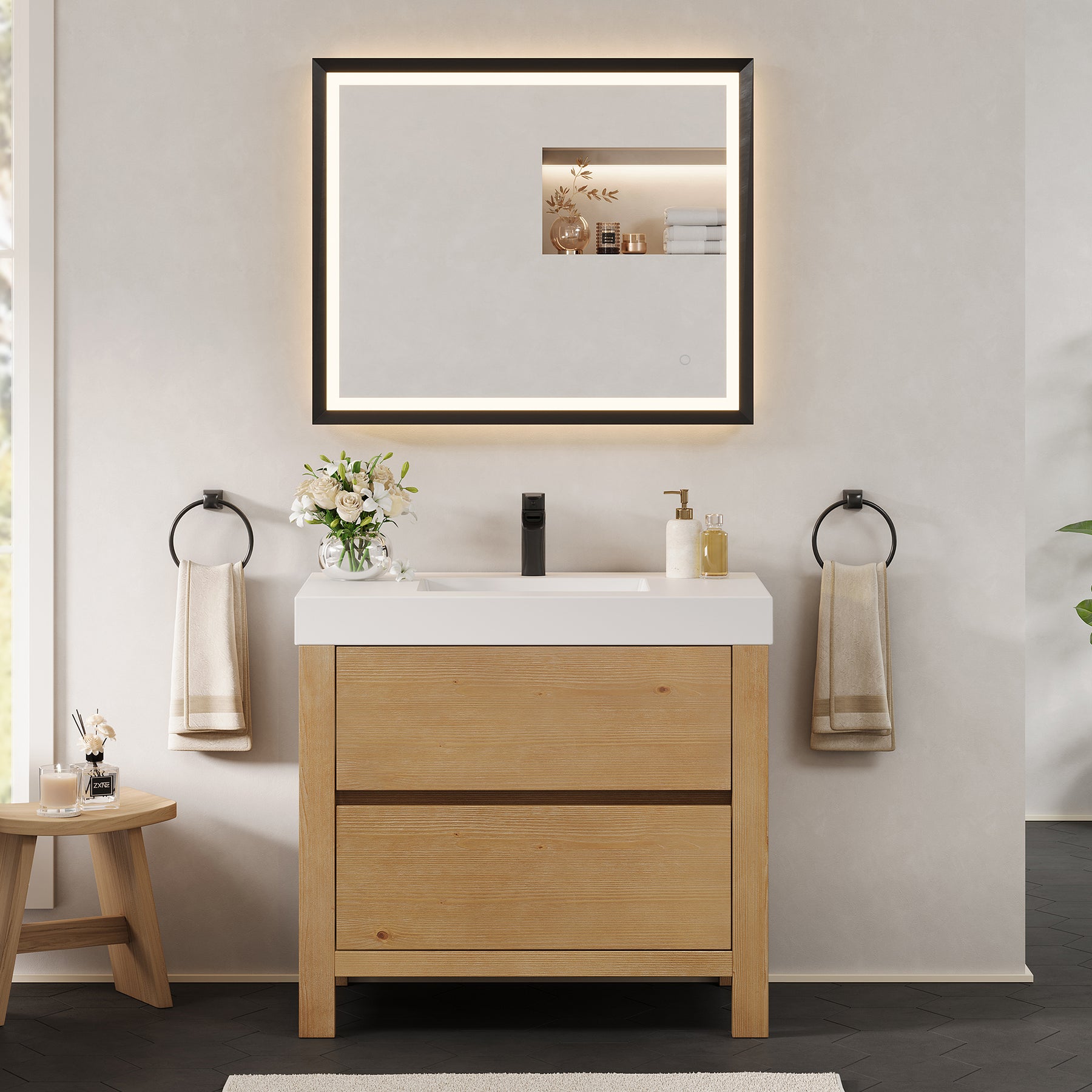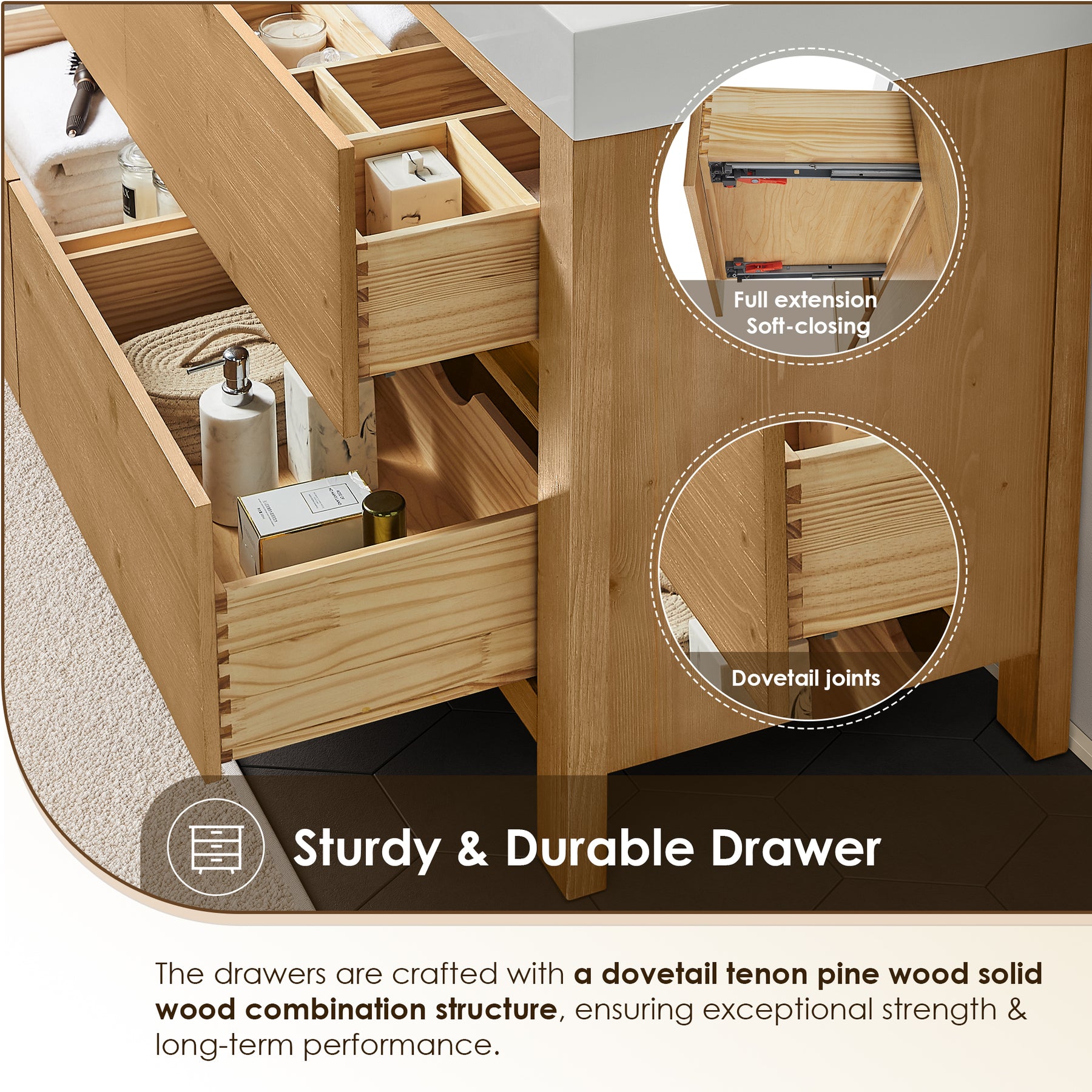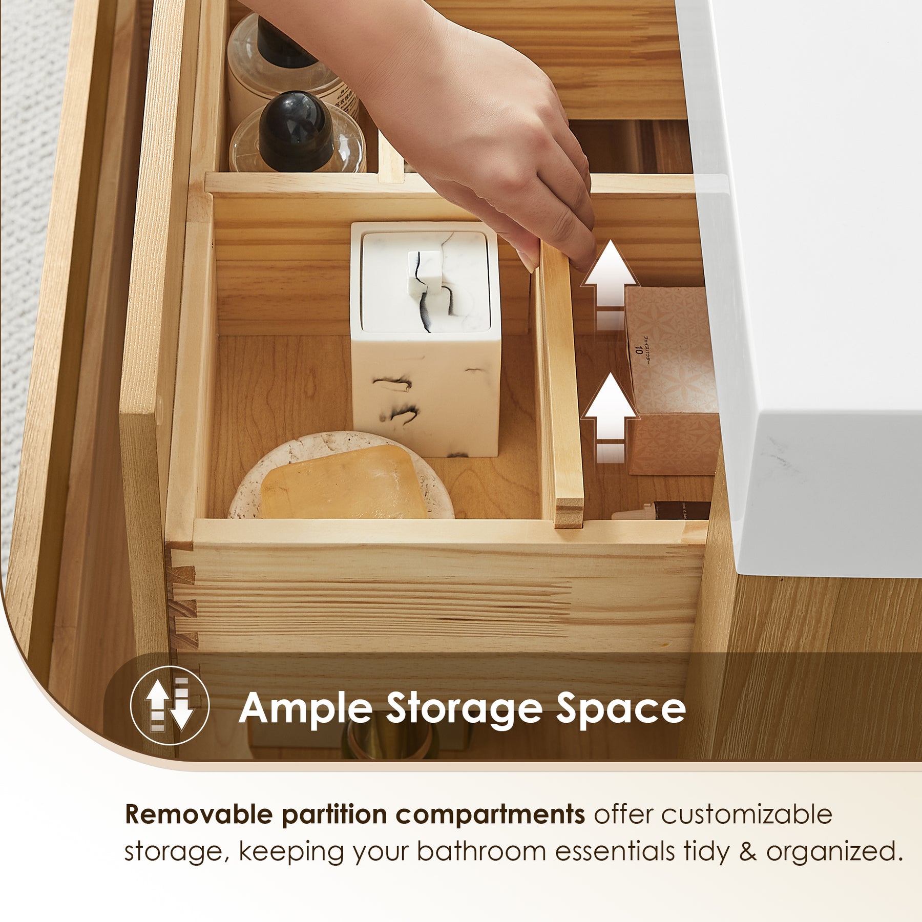 • Hardware: Functional storage layout: The cabinet integrates a wooden U-shaped groove that optimizes space for versatile storage options. Functionally separated drawers provide a thoughtful, well-organized solution for storing toiletries, towels, and other essentials.