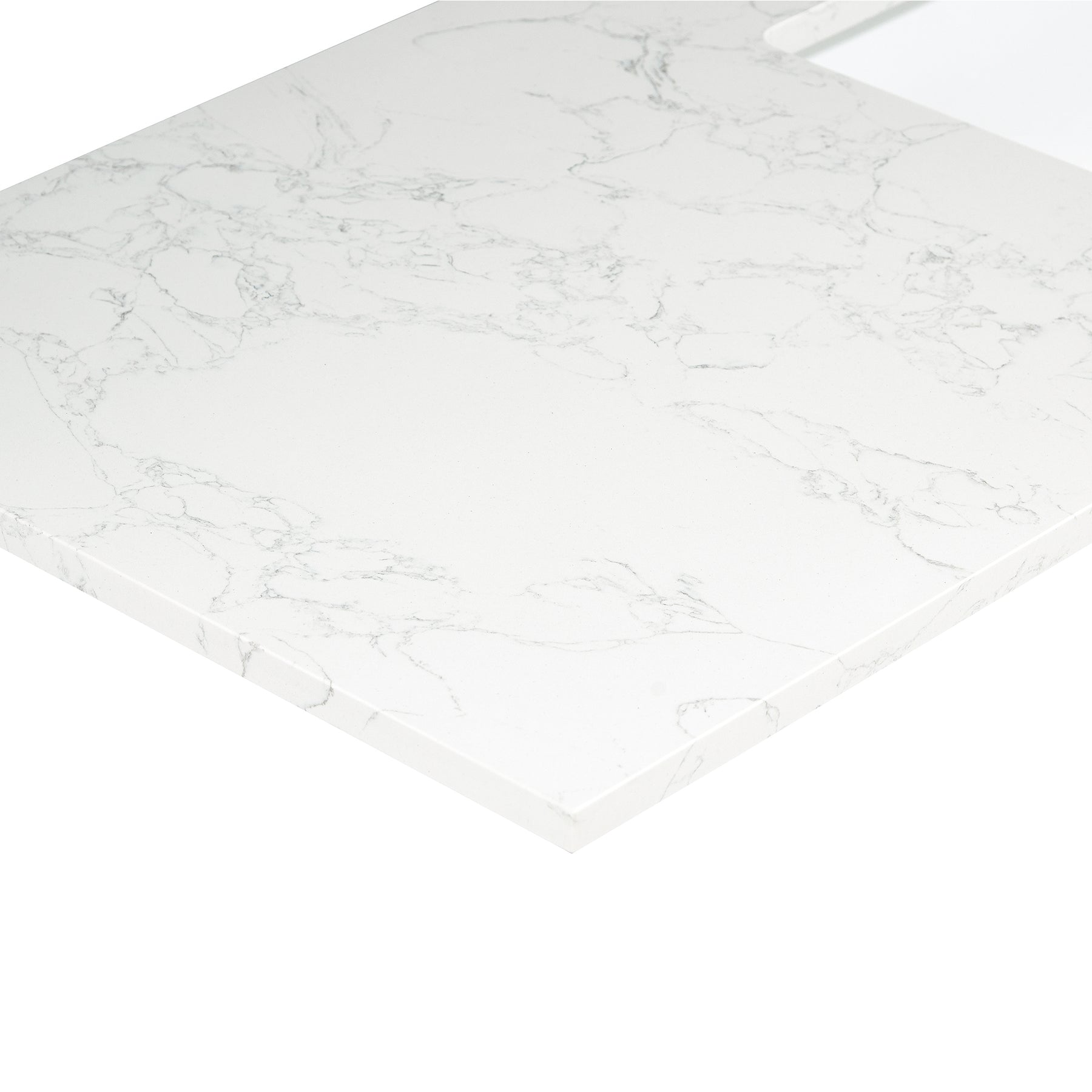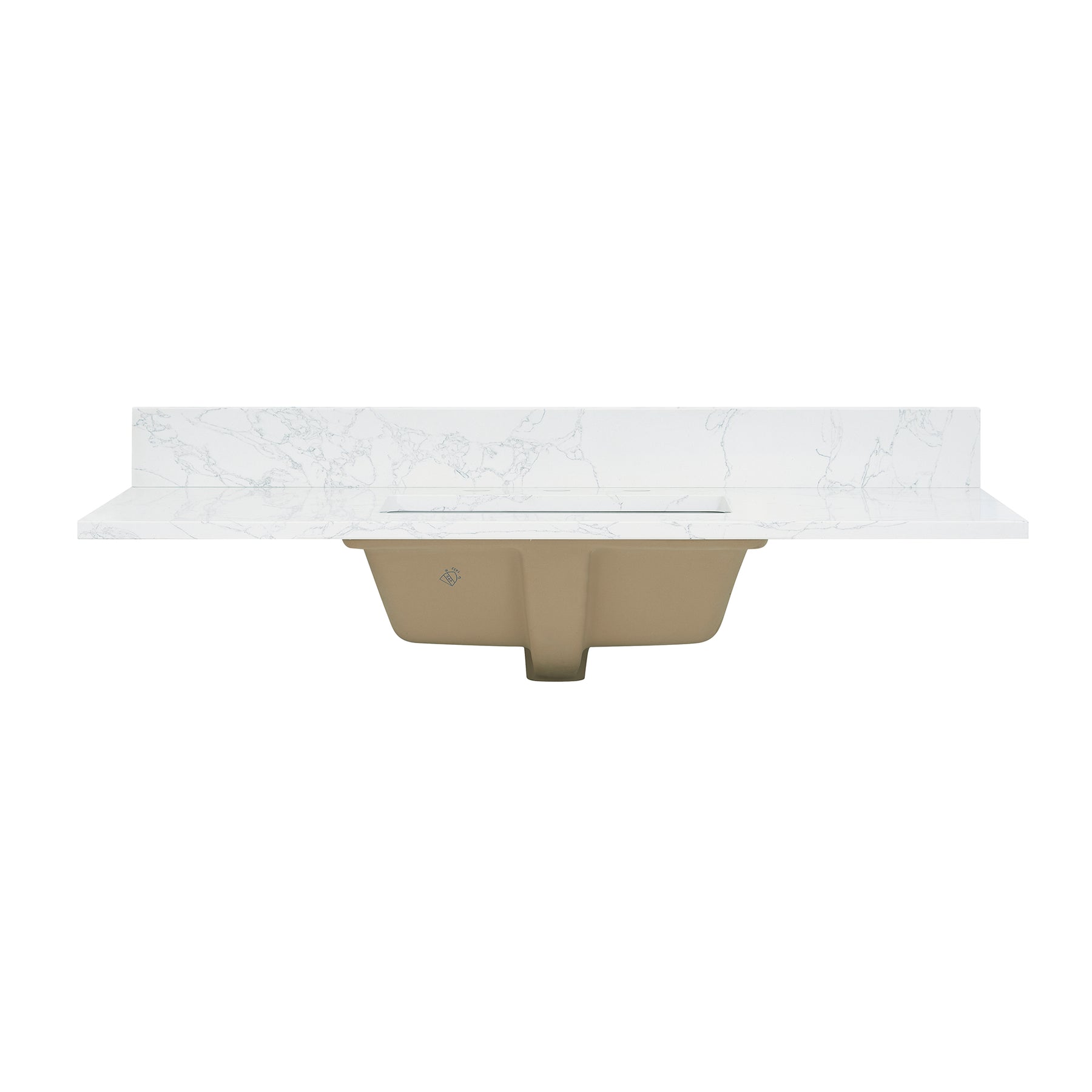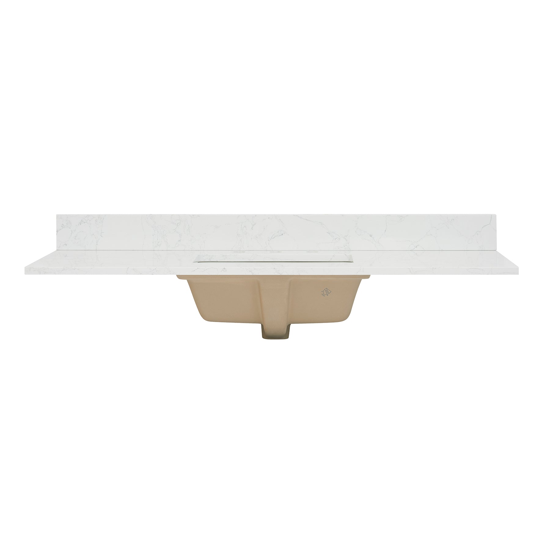 Searching for the perfect console vanity top? Our Ceres Countertop features a natural-looking stone finish that immerses you in its timeless elegance. Engineered with cutting-edge technology, it is highly resistant to scratches, stains, and heat, ensuring long-lasting beauty and easy maintenance. The Ceres Countertop will effortlessly complement your bathroom décor.