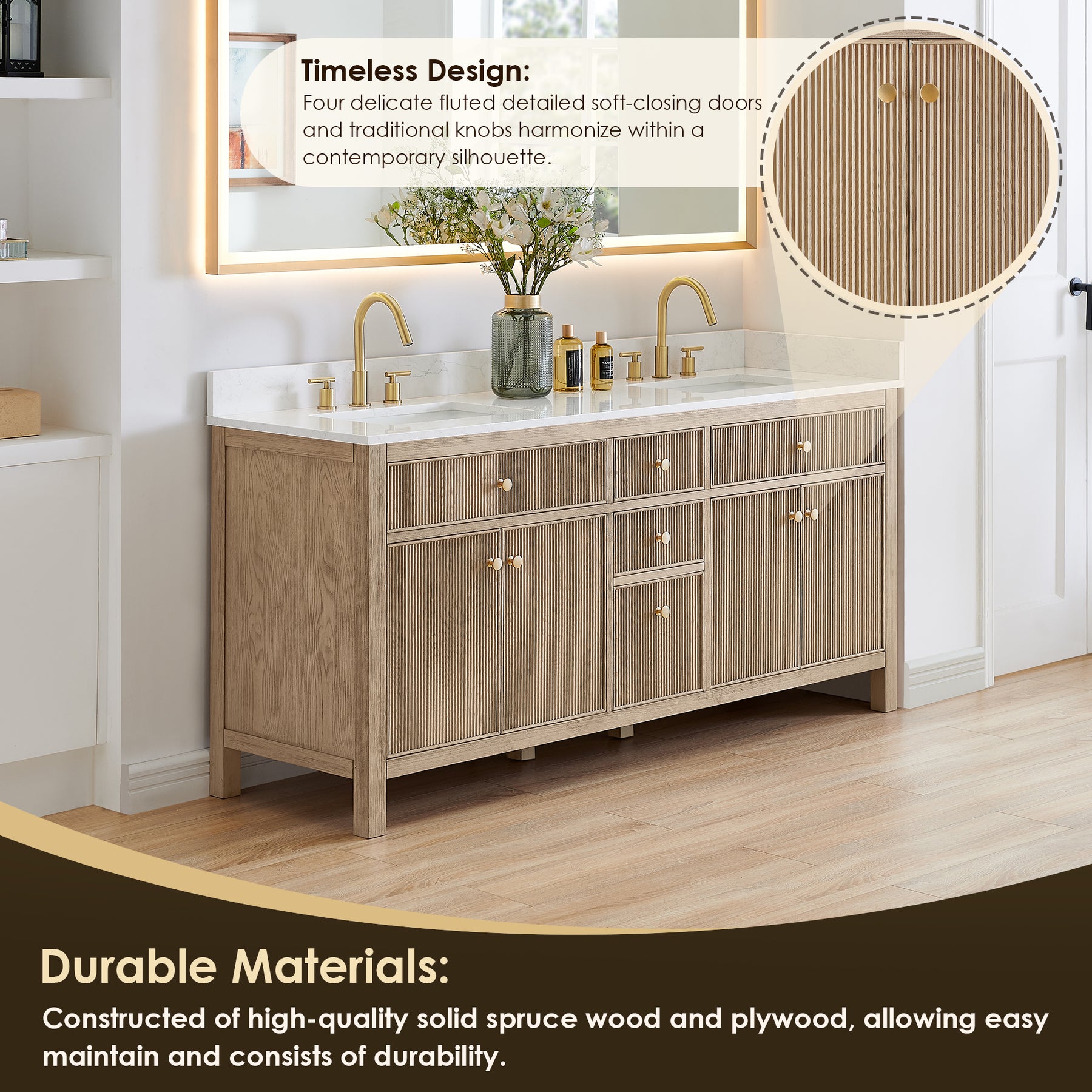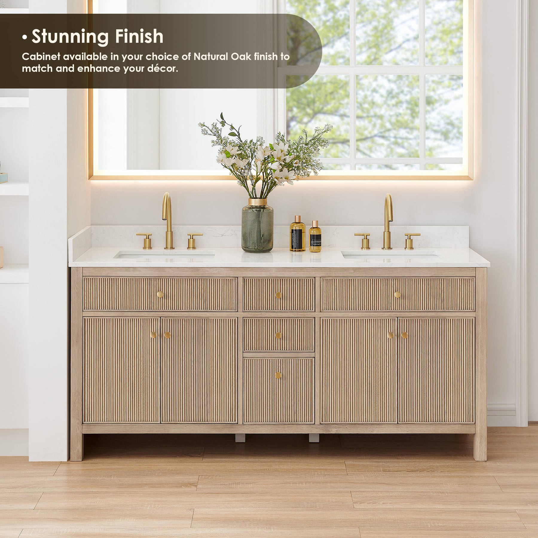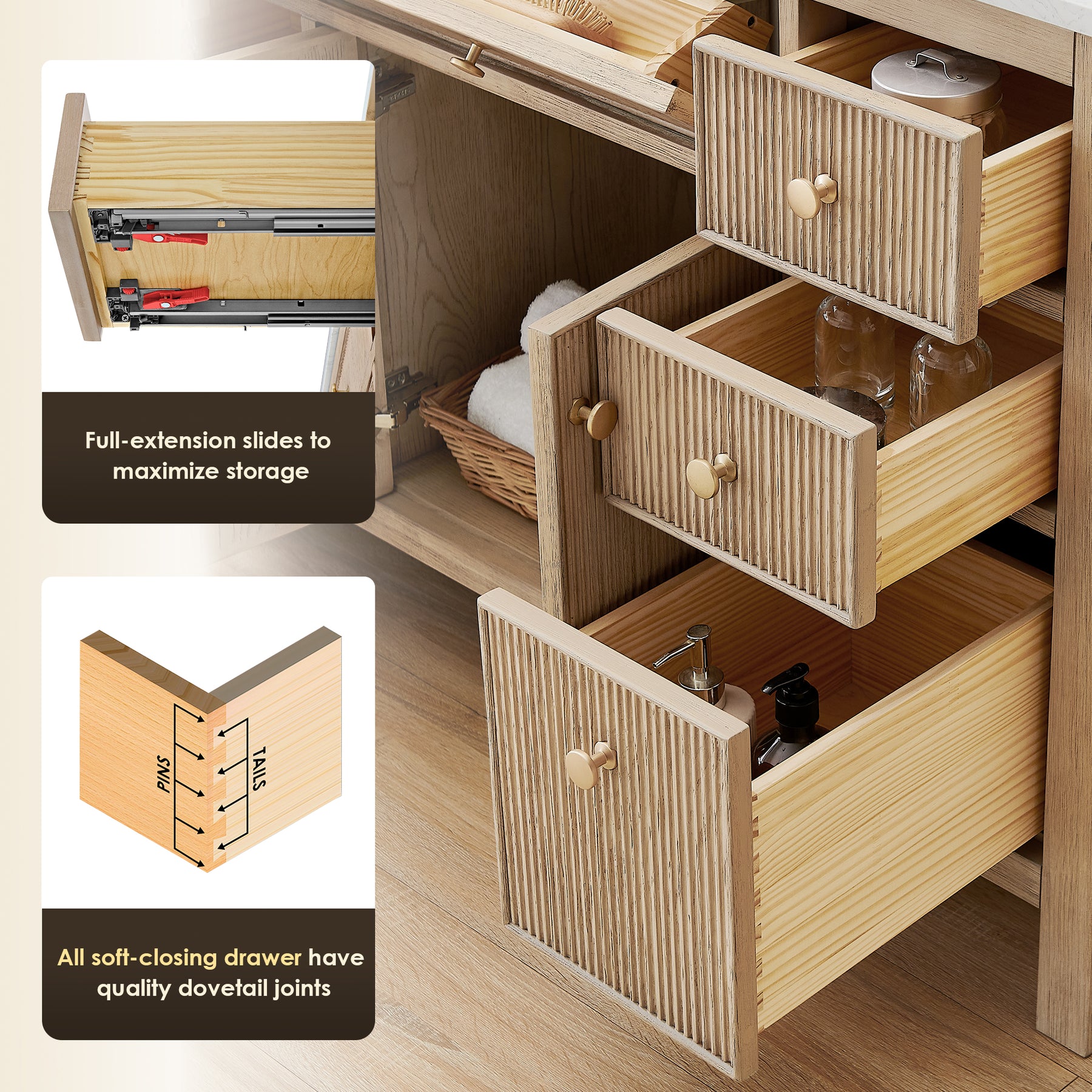 Instantly enhance the aesthetic of your bathroom space with our Cerrito Bathroom Vanity, a fusion of contemporary elegance and natural charm. Crafted from premium spruce wood, this vanity features beautifully fluted doors that showcase the natural wood grain and sleek grain white countertop. Protect your walls in style with the optional 4-inch backsplash and sidesplash. The Cerrito is the perfect blend of on-trend design and everyday practicality, with soft-closing doors and drawers that keep all your essentials neatly organized and tucked away.