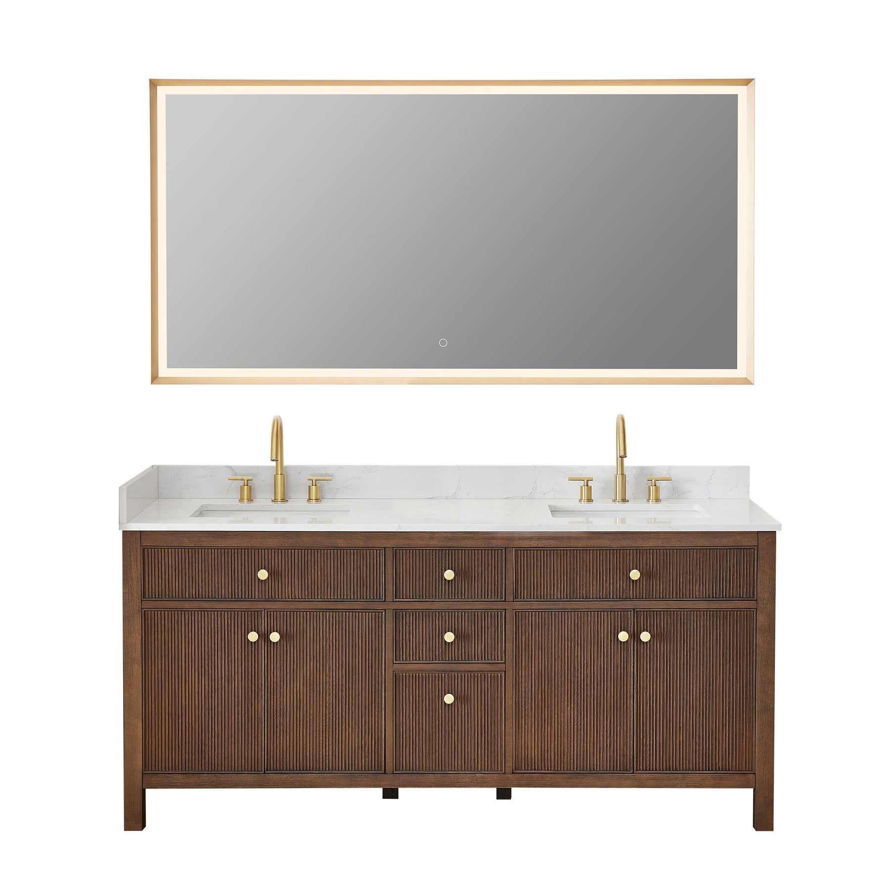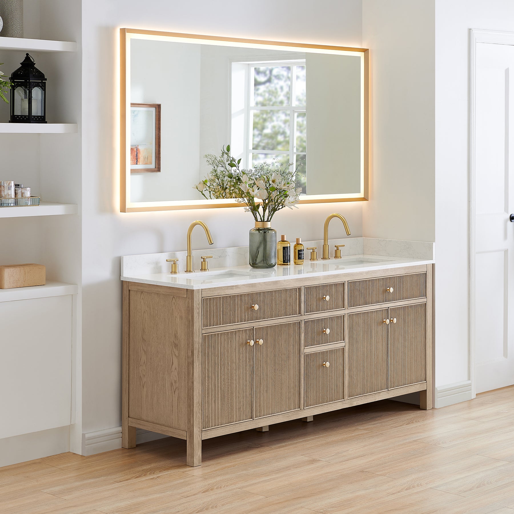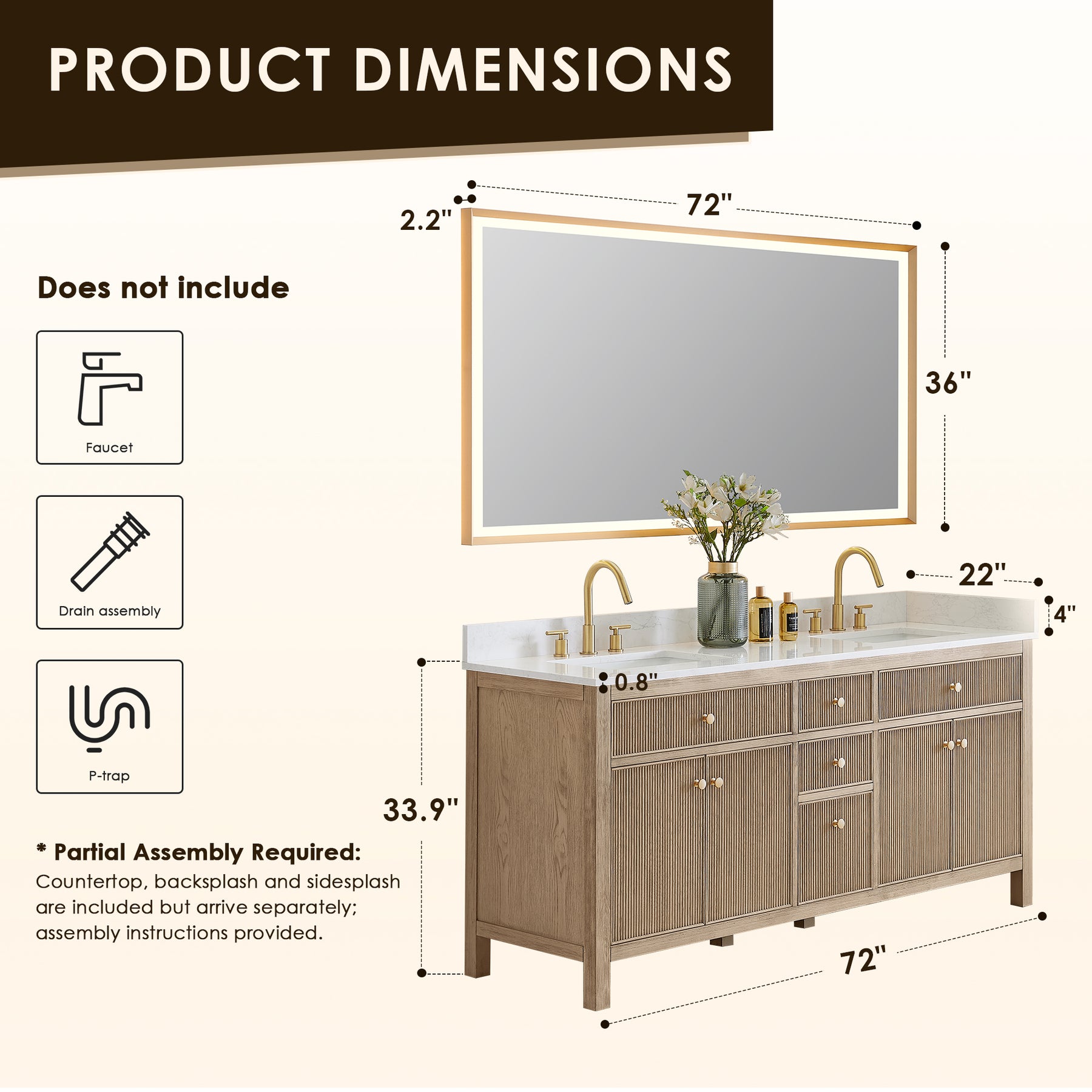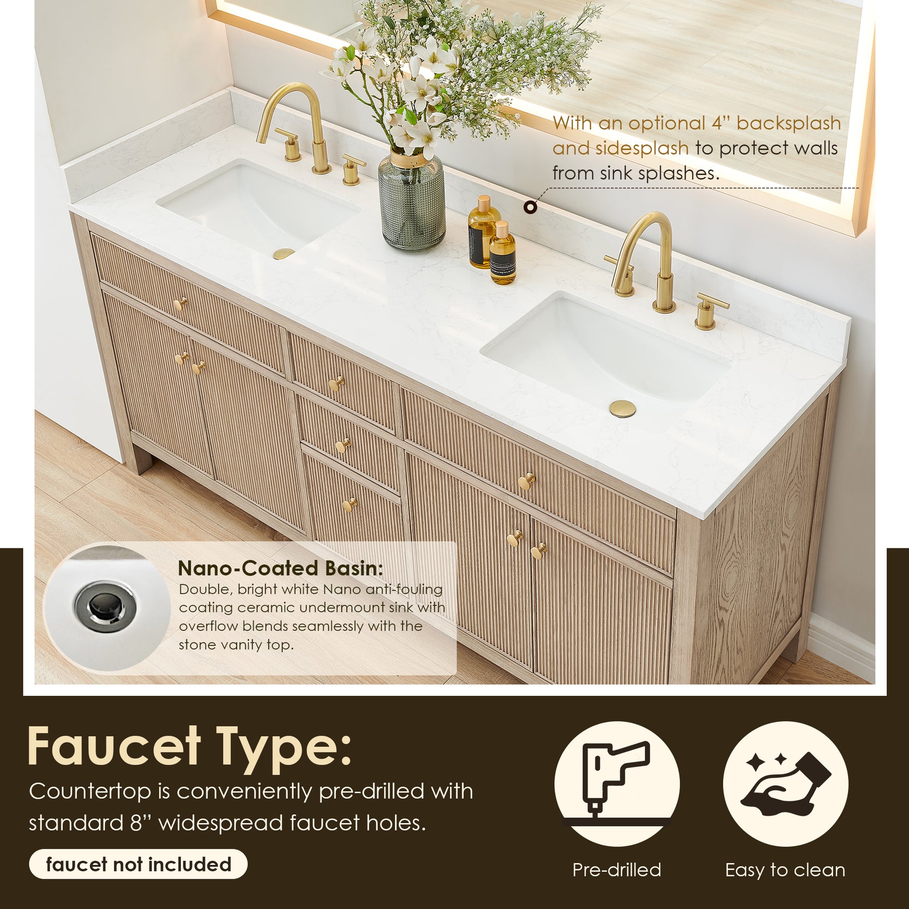 Instantly enhance the aesthetic of your bathroom space with our Cerrito Bathroom Vanity, a fusion of contemporary elegance and natural charm. Crafted from premium spruce wood, this vanity features beautifully fluted doors that showcase the natural wood grain and sleek grain white countertop. Protect your walls in style with the optional 4-inch backsplash and sidesplash. The Cerrito is the perfect blend of on-trend design and everyday practicality, with soft-closing doors and drawers that keep all your essentials neatly organized and tucked away.