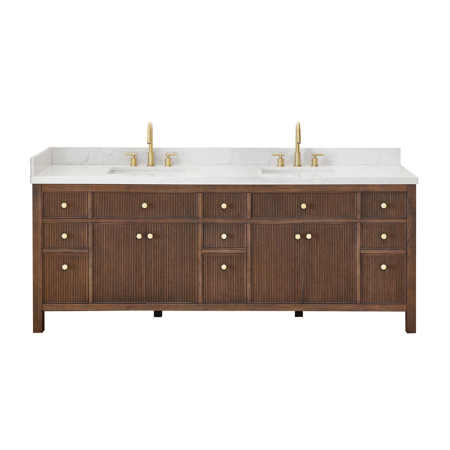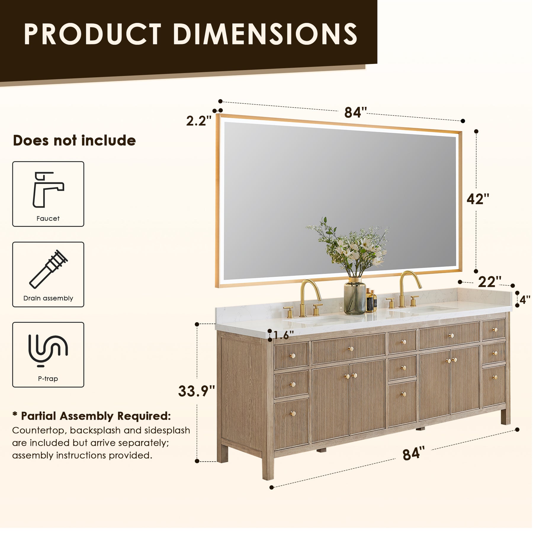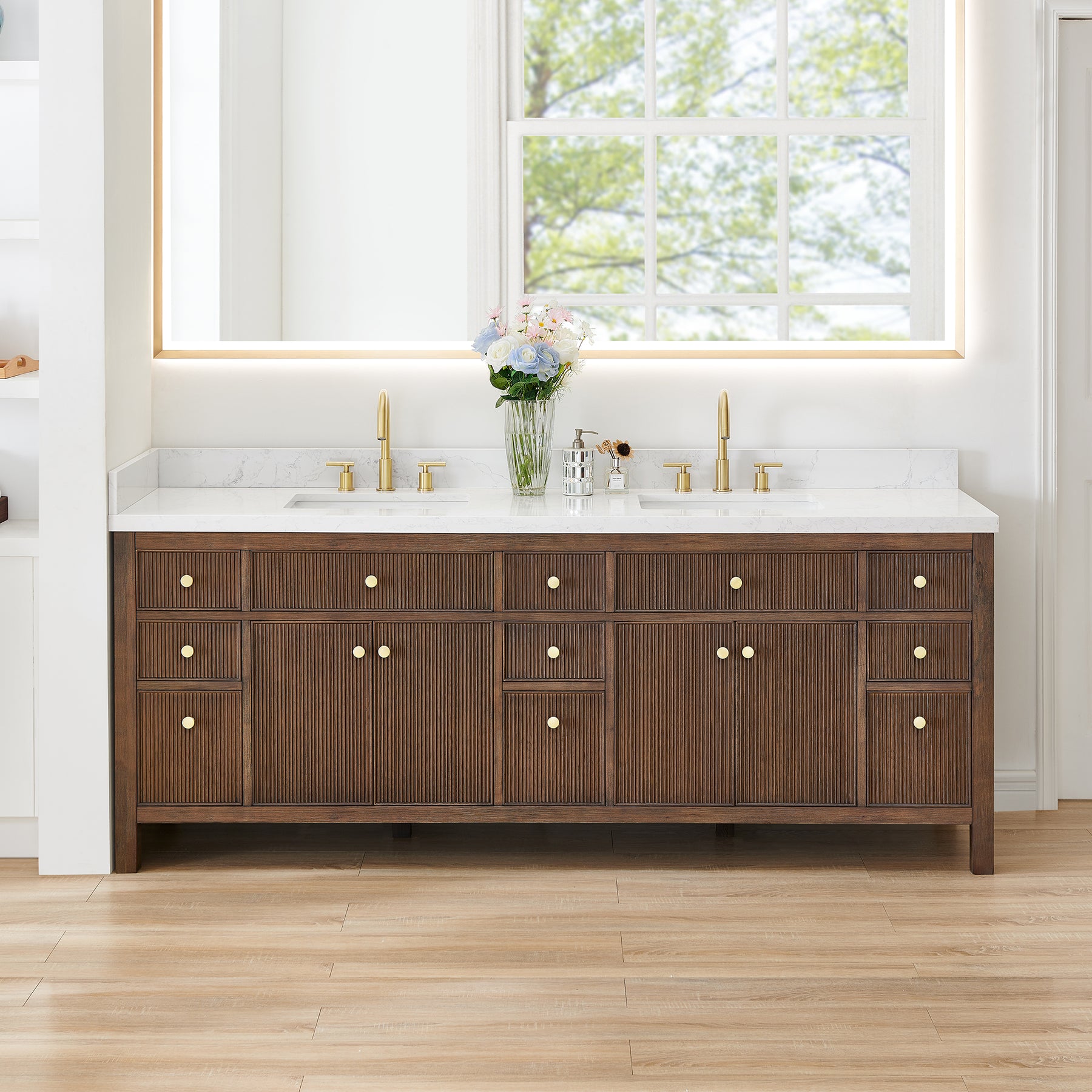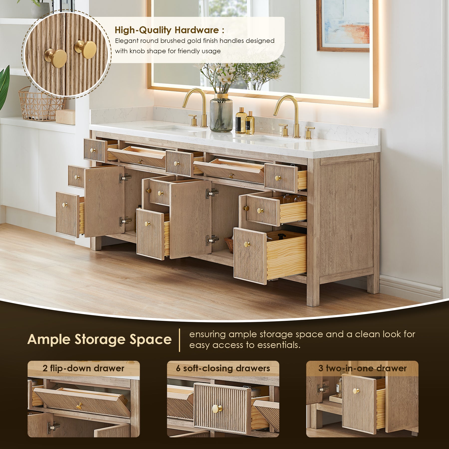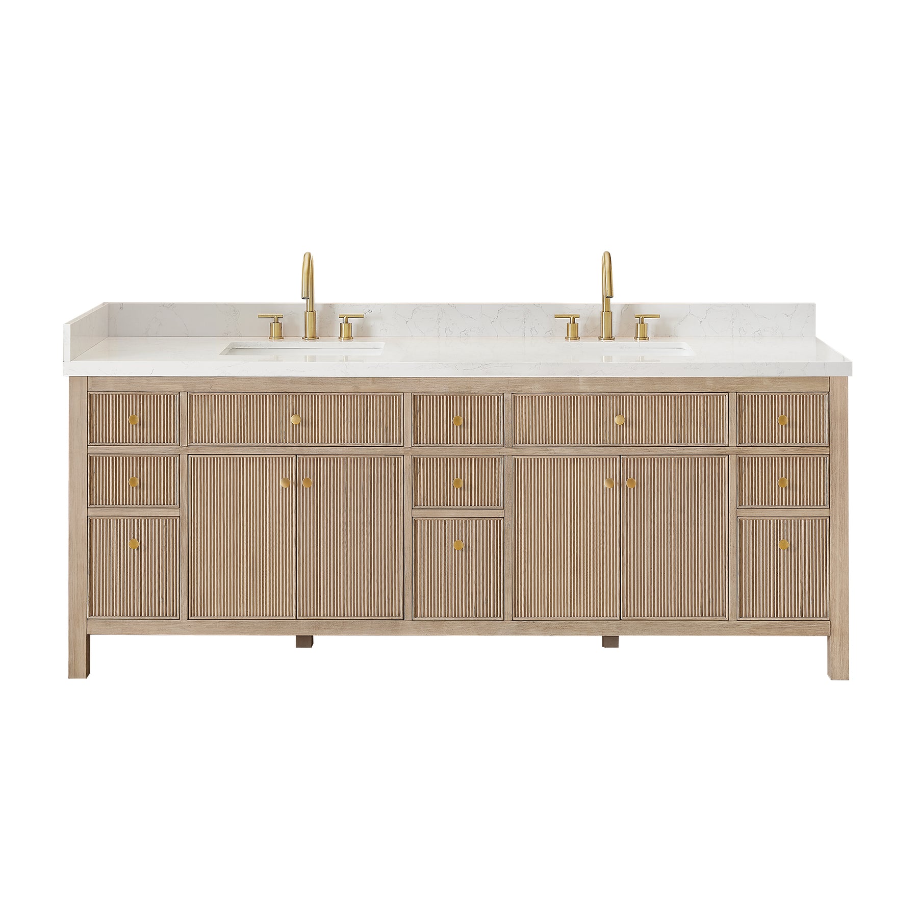 Instantly enhance the aesthetic of your bathroom space with our Cerrito Bathroom Vanity, a fusion of contemporary elegance and natural charm. Crafted from premium spruce wood, this vanity features beautifully fluted doors that showcase the natural wood grain and sleek grain white countertop. Protect your walls in style with the optional 4-inch backsplash and sidesplash. The Cerrito is the perfect blend of on-trend design and everyday practicality, with soft-closing doors and drawers that keep all your essentials neatly organized and tucked away.