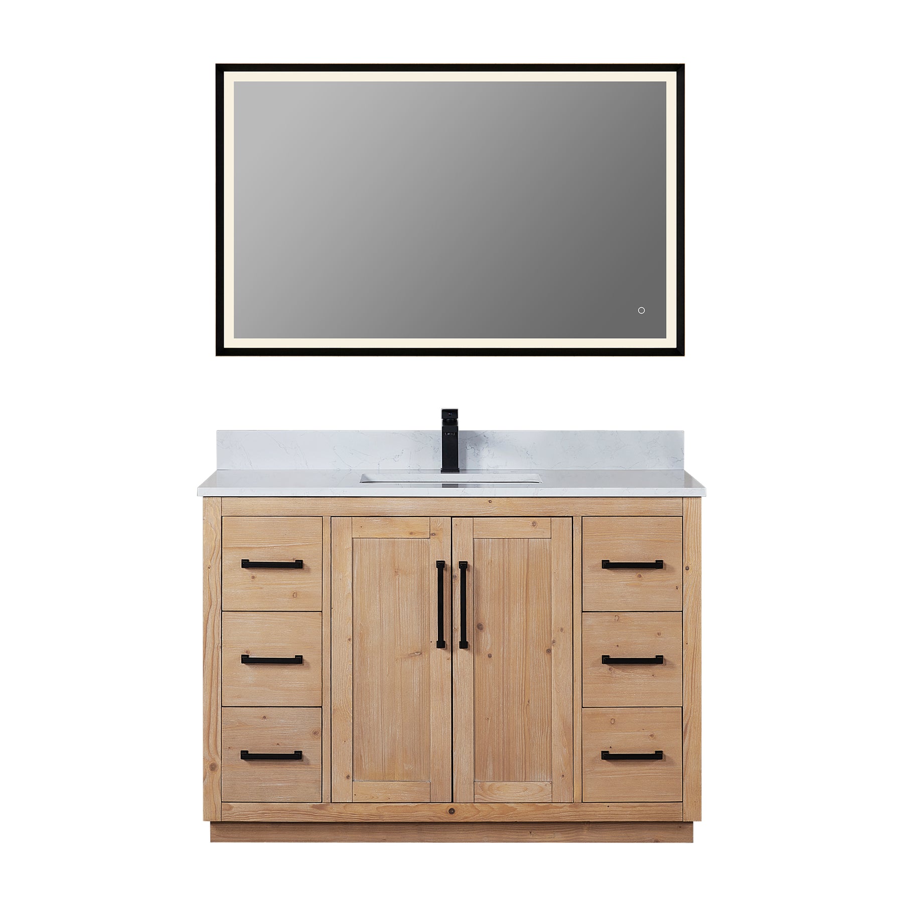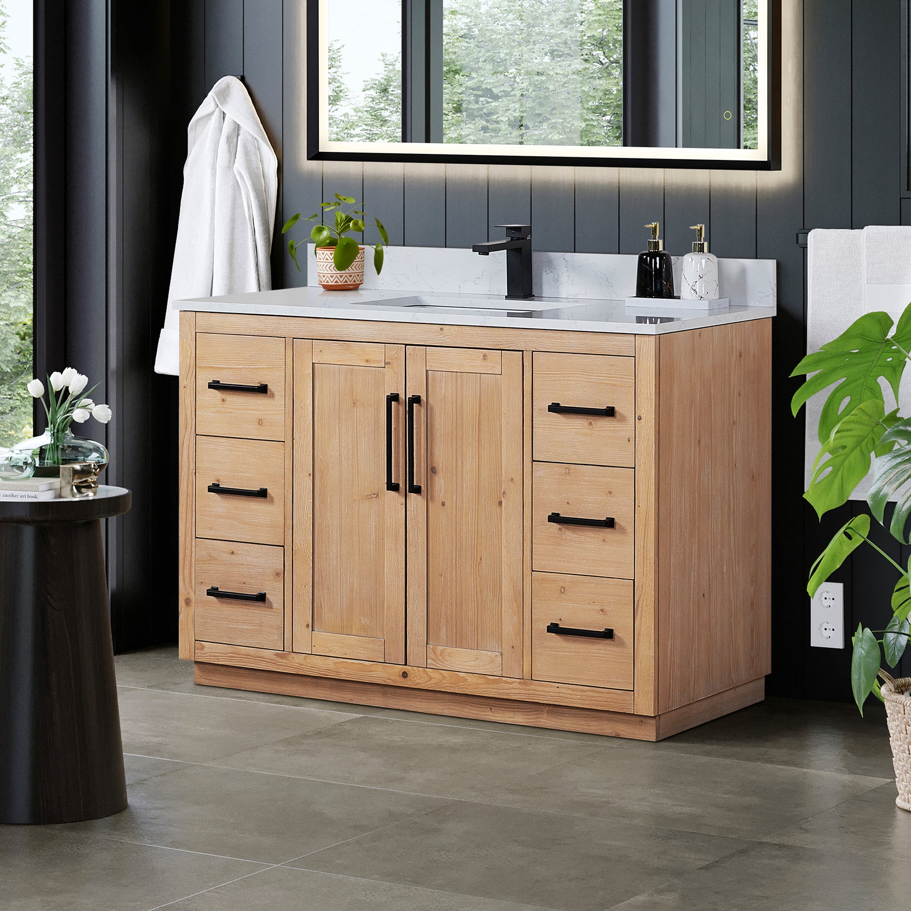 Transform your guest or prime bath with our modern yet timeless Cicero Vanity Collection. Constructed with premium materials and a focus on traditional craftsmanship, its minimalist style—complete with a recessed plinth base—fuses effortlessly with any bathroom decor. The cabinet’s natural fir wood lends inviting warmth and texture, while the marbled composite stone countertop brings a clean aesthetic. This vanity boldly steers clear of fleeting trends, ensuring it stays stylish and captivating for years to come.