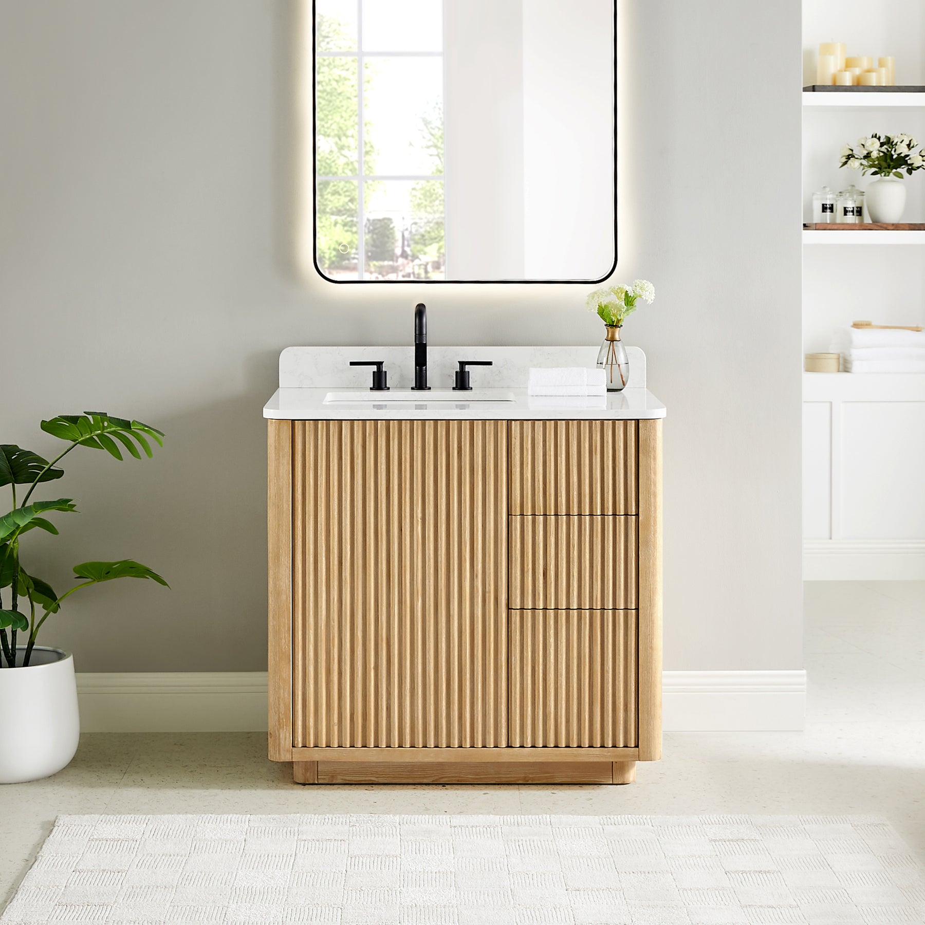 Our timeless Clayton vanity combines modern design with exceptional functionality, featuring a washed finish that adds a touch of warmth and softness to your bathroom. The drawer and door panels are adorned with solid reeding, showcasing elegant detailing that creates subtle shadows, enhancing the piece with added depth and visual contrast. The smooth countertop, with its rounded edges, displays a refined, contemporary charm, perfectly highlighting the sophisticated designed grain lines. Thoughtfully crafted for your convenience, this innovative design features a push-to-open and close mechanism, a sleek handle-free aesthetic, a dedicated hair dryer organizer, and built-in UL-listed power and USB outlets, ensuring effortless access and organized storage.