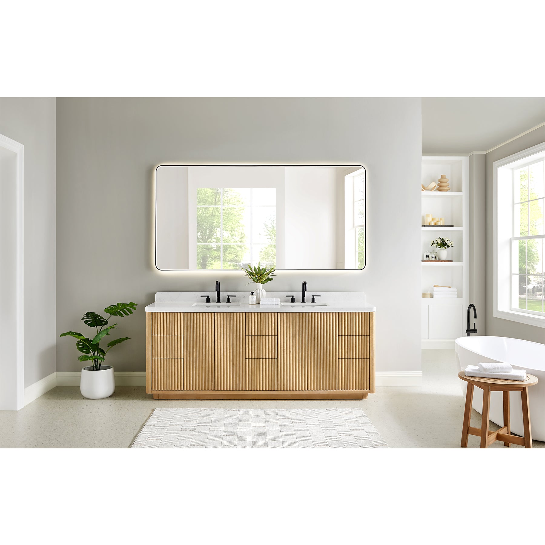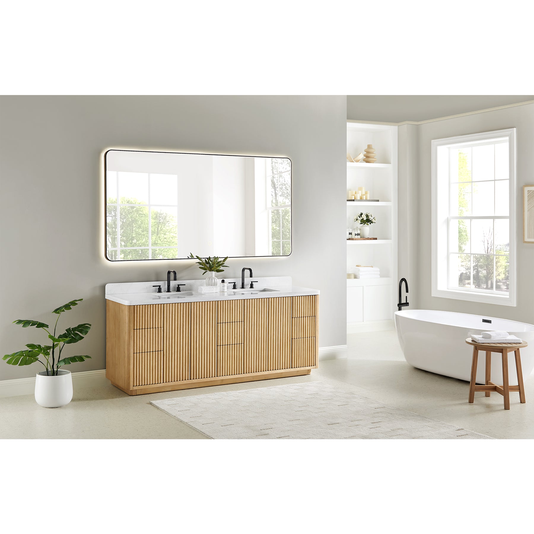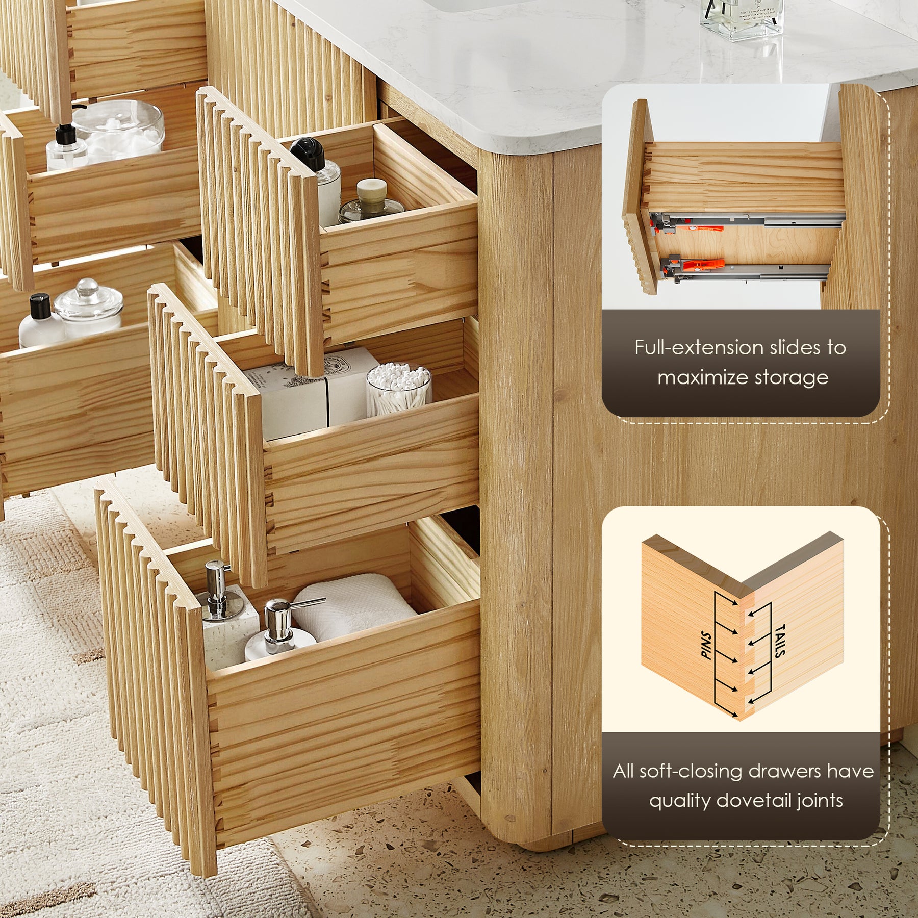 Our timeless Clayton vanity combines modern design with exceptional functionality, featuring a washed finish that adds a touch of warmth and softness to your bathroom. The drawer and door panels are adorned with solid reeding, showcasing elegant detailing that creates subtle shadows, enhancing the piece with added depth and visual contrast. The smooth countertop, with its rounded edges, displays a refined, contemporary charm, perfectly highlighting the sophisticated designed grain lines. Thoughtfully crafted for your convenience, this innovative design features a push-to-open and close mechanism, a sleek handle-free aesthetic, a dedicated hair dryer organizer, and built-in UL-listed power and USB outlets, ensuring effortless access and organized storage.