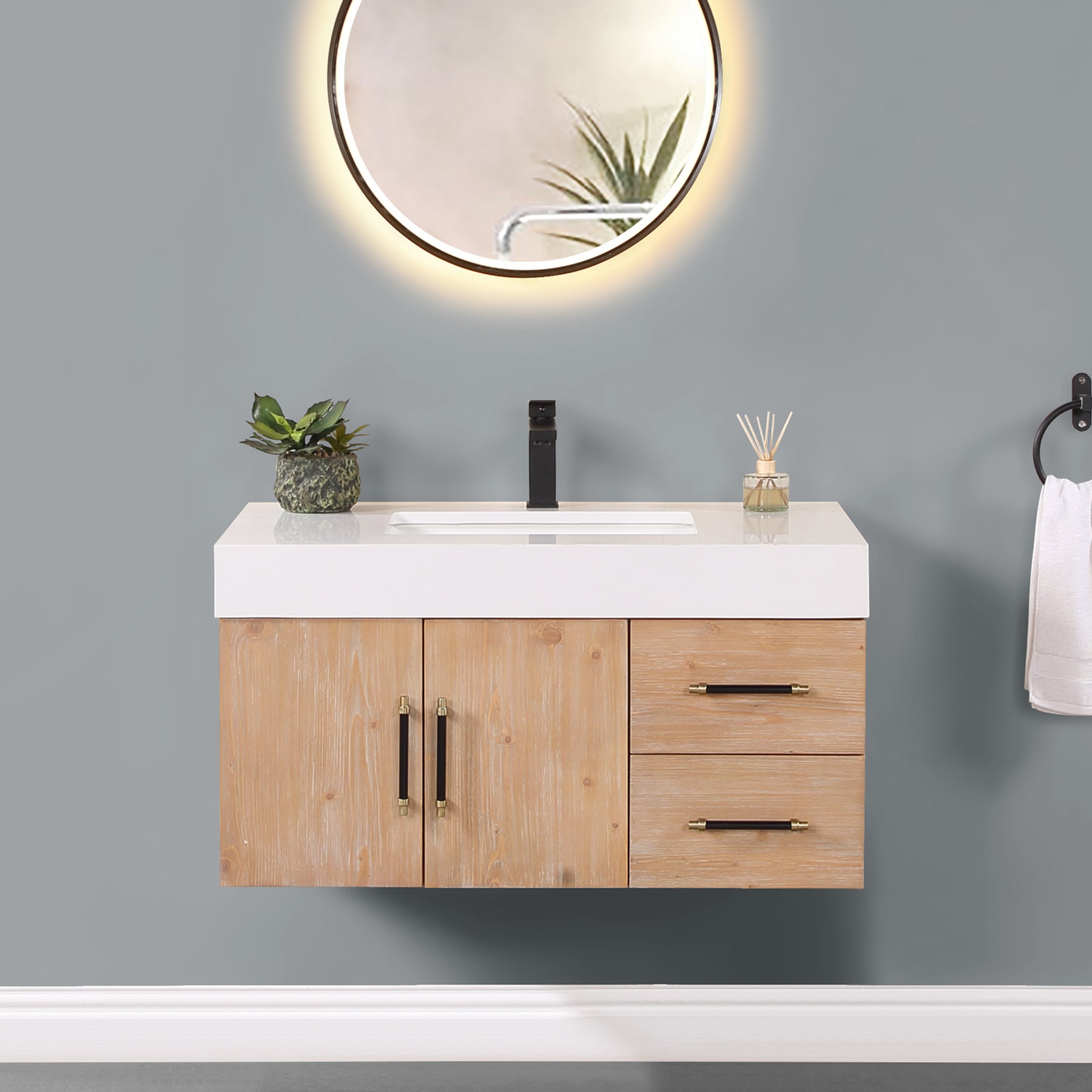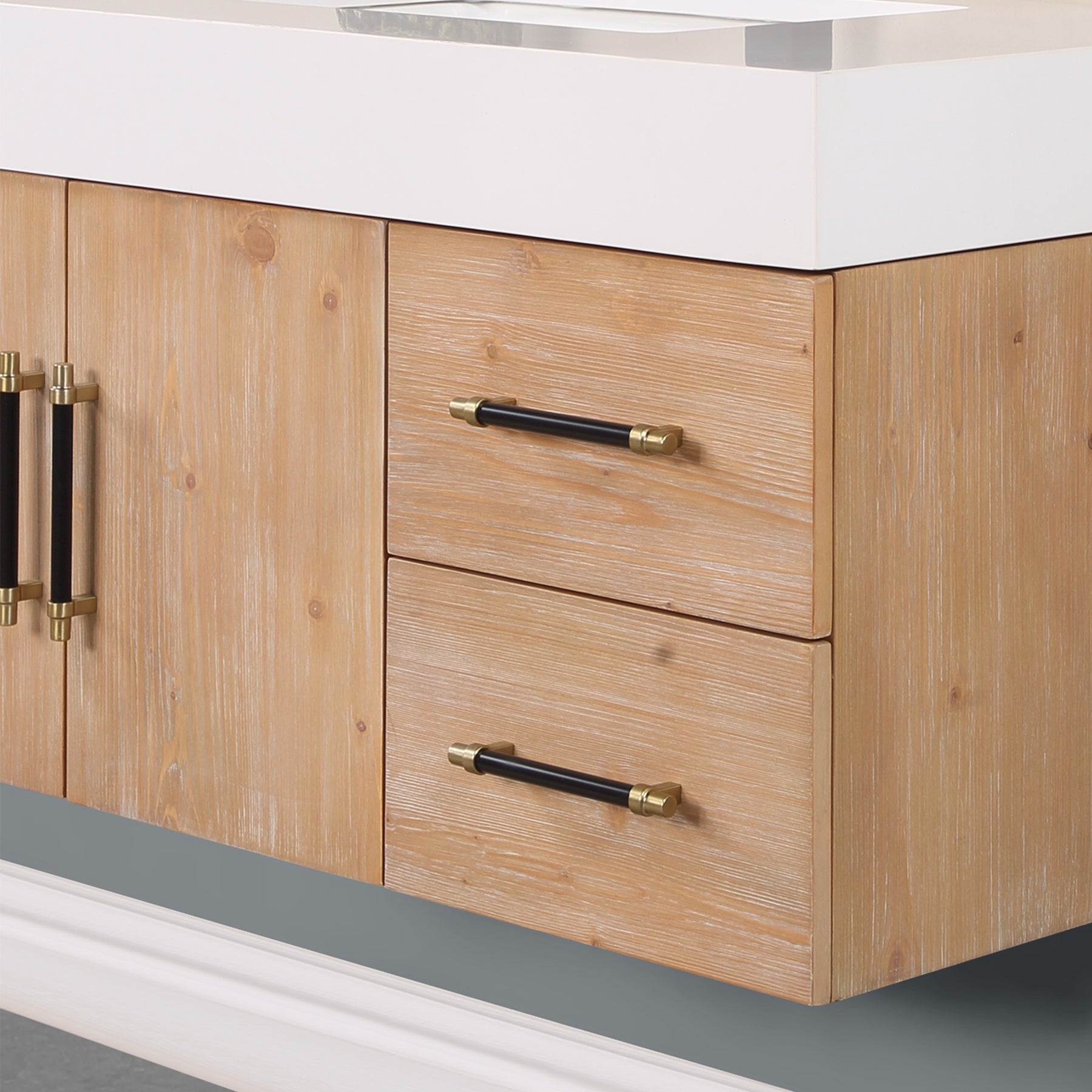Whether you're washing your hands or getting ready for a glamorous night out,our Corchia bathroom vanity makes every task a pleasure. Stately and stylish with smooth-gliding doors and drawers,this piece is bursting with space for his and her bathroom accoutrements. The Corchia features a textured wood-grain cabinet contrasted with a clean white countertop,while sleek black hardware adds a striking accent.