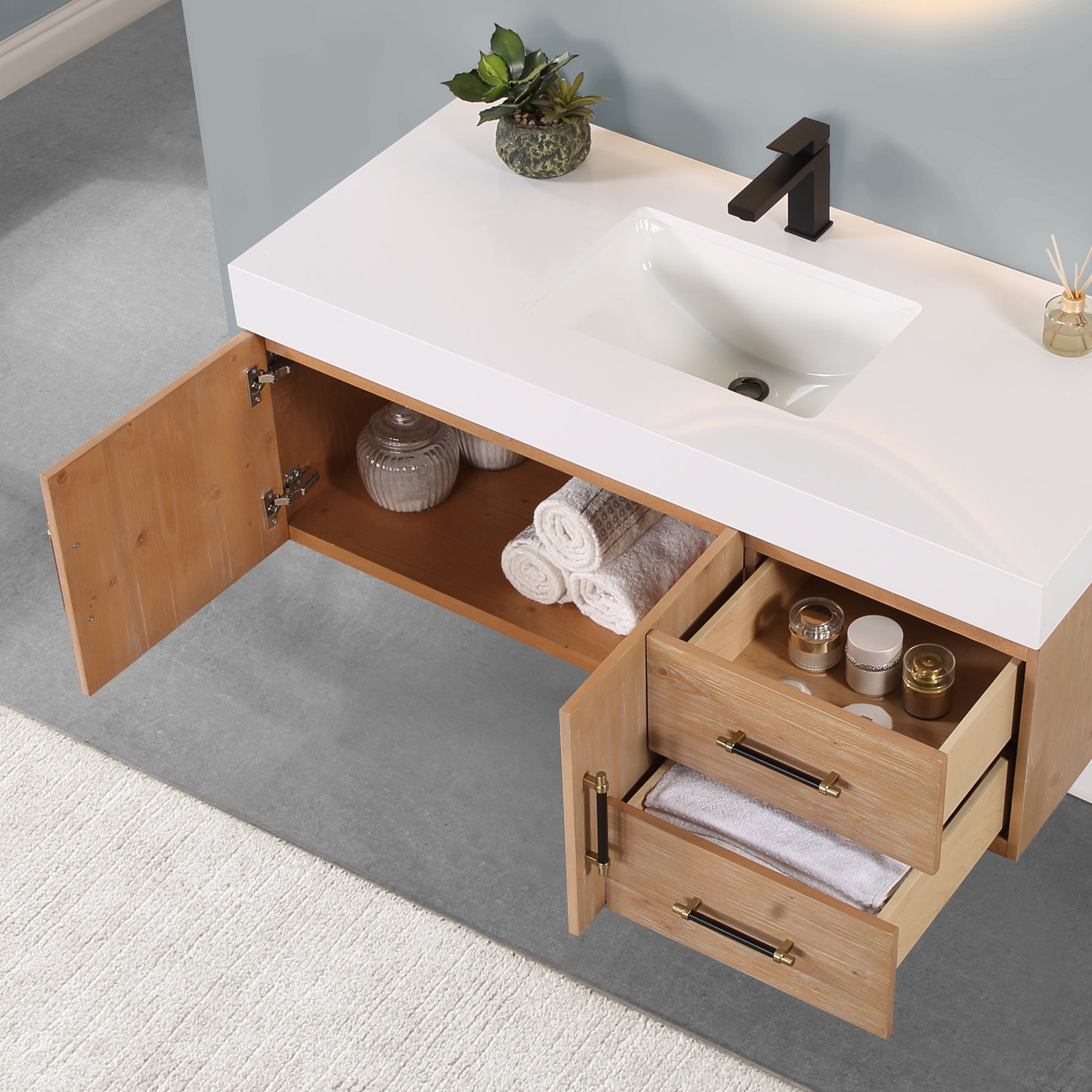 Whether you're washing your hands or getting ready for a glamorous night out,our Corchia bathroom vanity makes every task a pleasure. Stately and stylish with smooth-gliding doors and drawers,this piece is bursting with space for his and her bathroom accoutrements. The Corchia features a textured wood-grain cabinet contrasted with a clean white countertop,while sleek black hardware adds a striking accent.