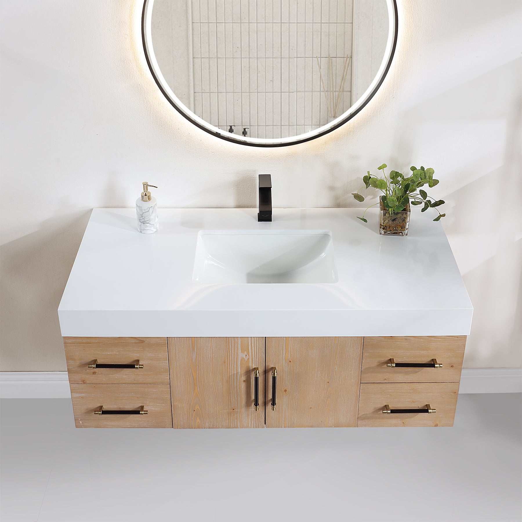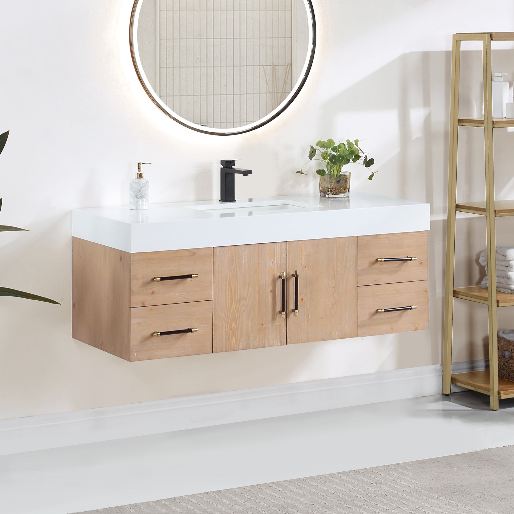 Whether you're washing your hands or getting ready for a glamorous night out,our Corchia bathroom vanity makes every task a pleasure. Stately and stylish with smooth-gliding doors and drawers,this piece is bursting with space for his and her bathroom accoutrements. The Corchia features a textured wood-grain cabinet contrasted with a clean white countertop,while sleek black hardware adds a striking accent.