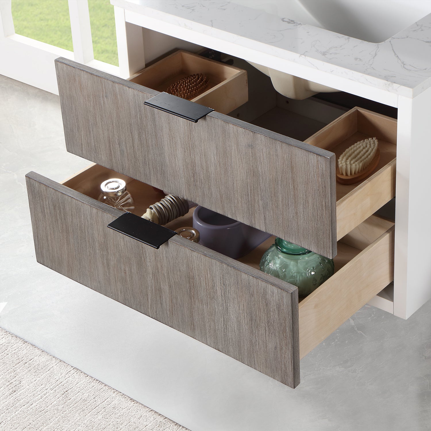 Hardware: Aluminum contracted invisible drawer pull handles in Matte Black finish provide a streamlined look.