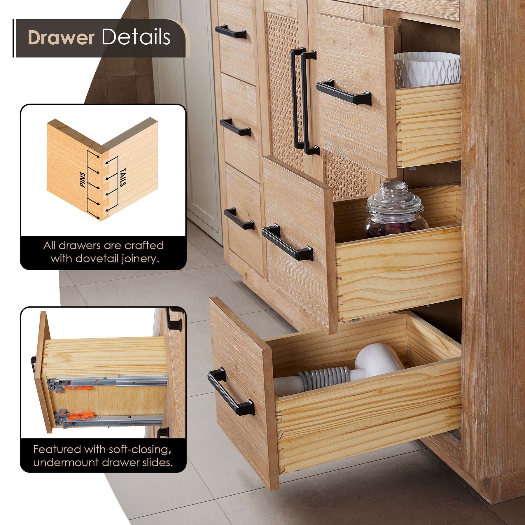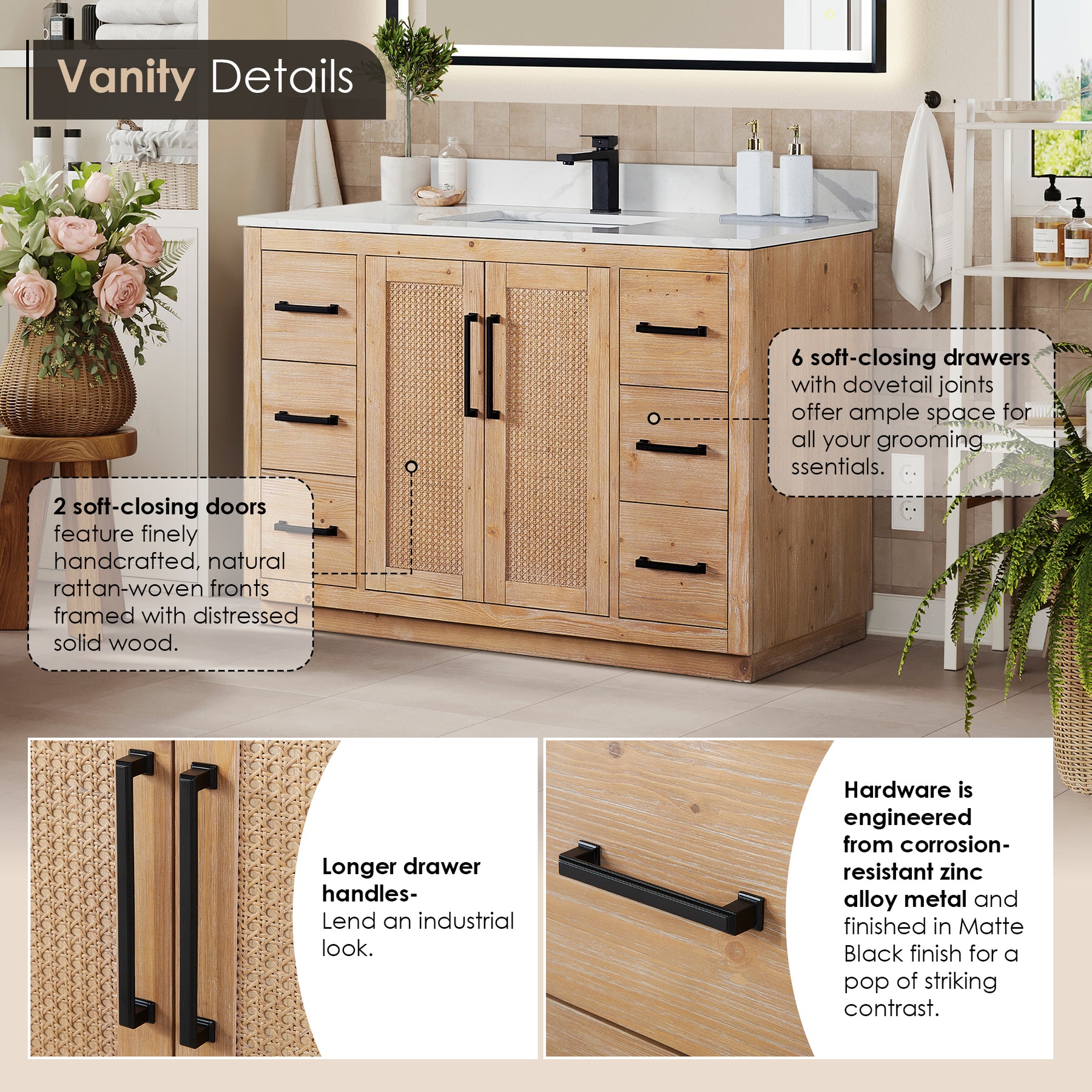 • Drawer & Door: Hardware is engineered from corrosion-resistant zinc alloy metal and finished in Matte Black finish for a pop of striking contrast.
