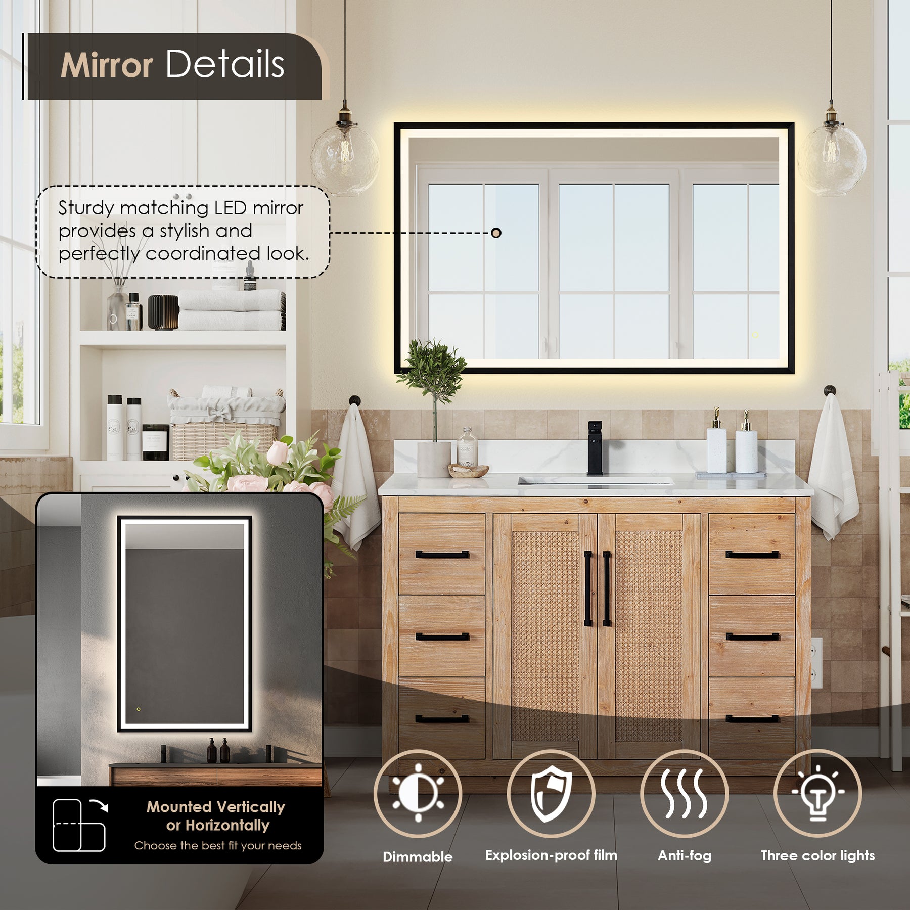 • Mirror: Rectangular, under-mount ceramic basin with overflow integrates with countertop for a seamless appearance.