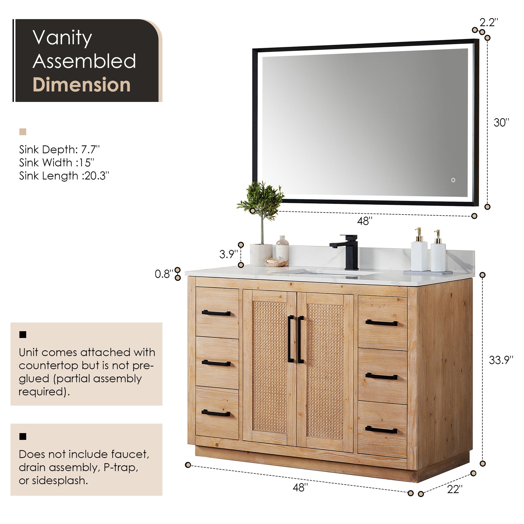 • Accessories: Does not include faucet, drain assembly, P-trap, or sidesplash.