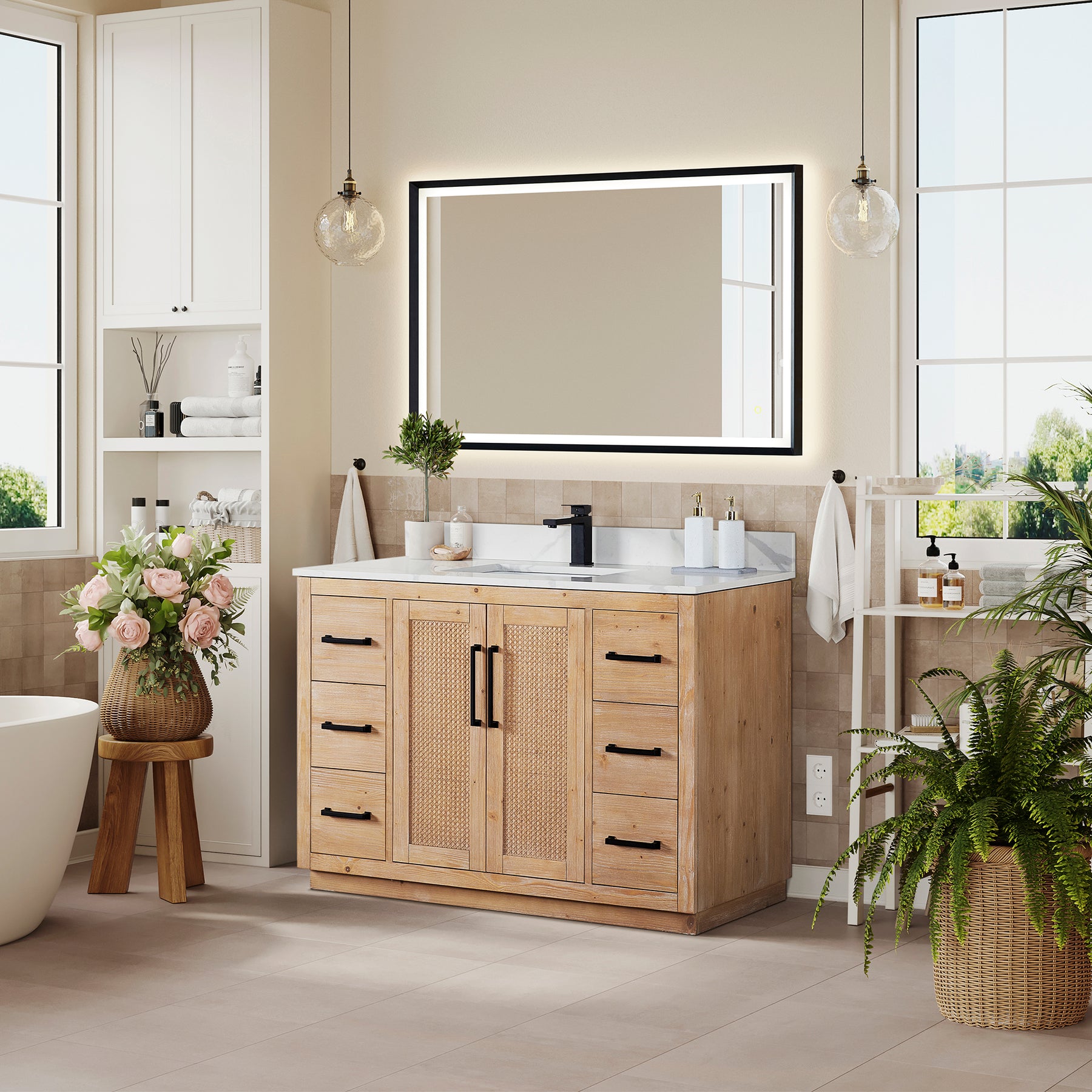 Featuring natural rattan-woven door fronts, our Floral Vanity Collection boasts a relaxed and refined aesthetic. The natural textures of the wood frame and cane detailing lend captivating depth and warmth to the cabinet, which is crowned with an exquisite, richly veined white quartz countertop. With a blend of clean lines and traditional details, this vanity offers a classic and enduring style. Thoughtfully designed for modern living, it includes integrated UL-listed power outlets, USB outlets, and a convenient hair dryer holder.