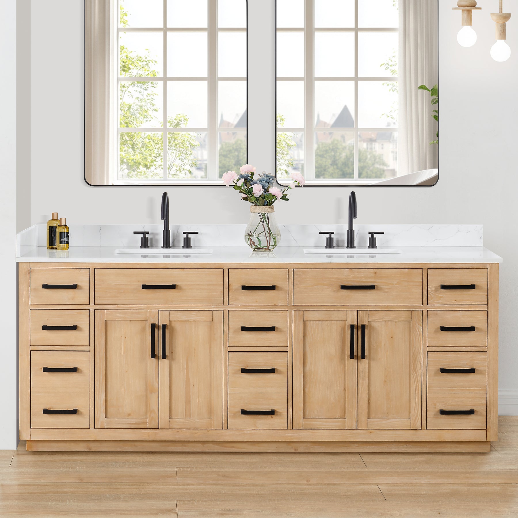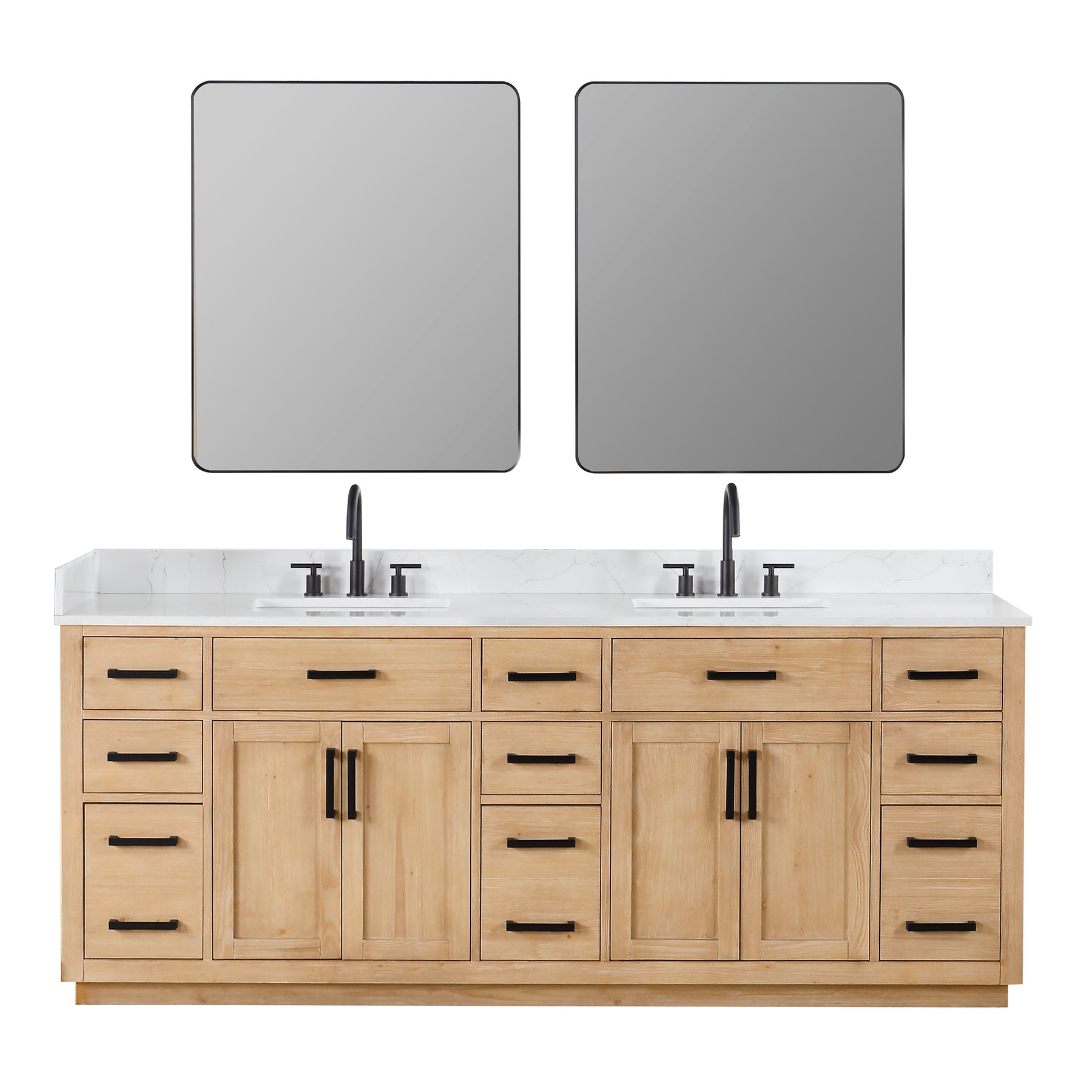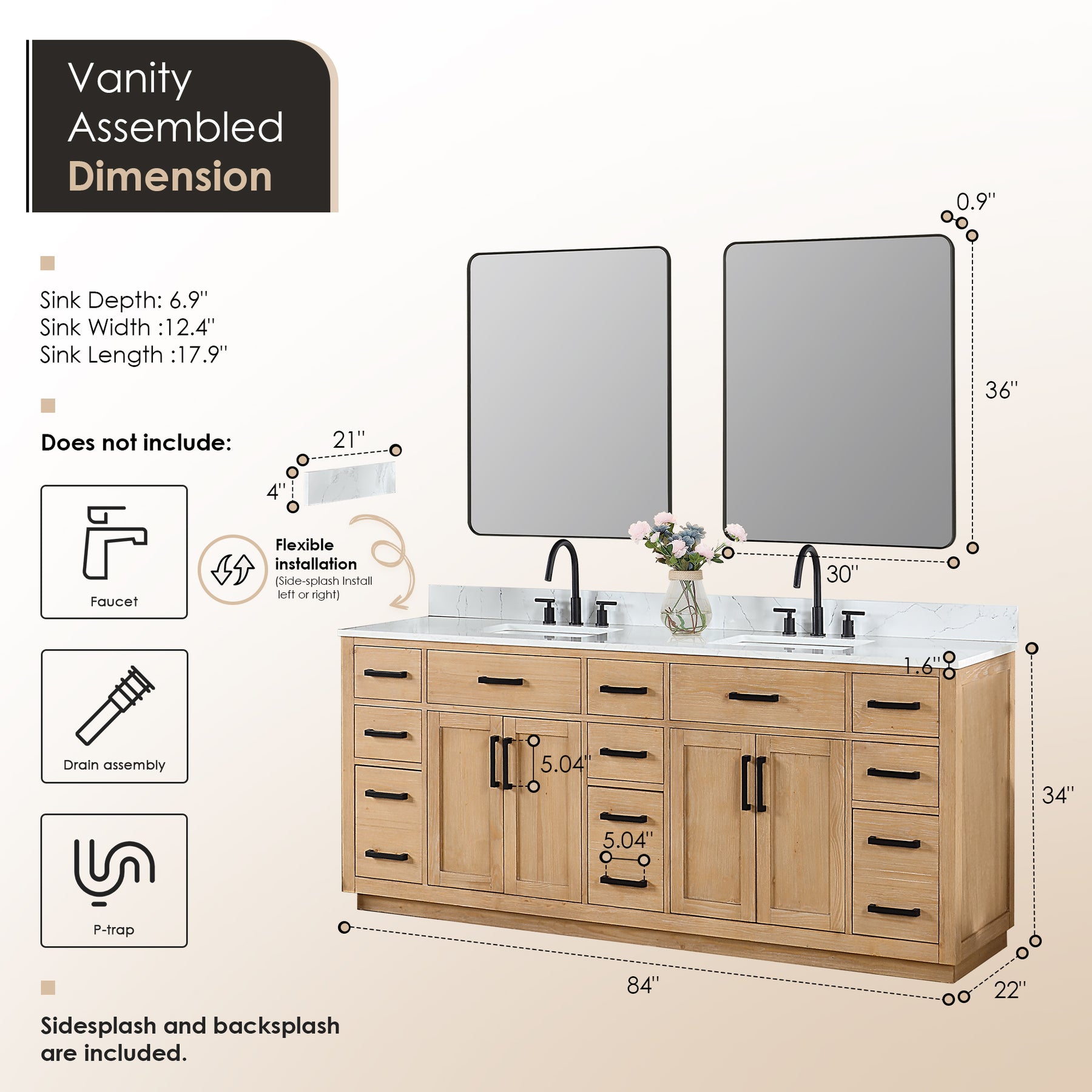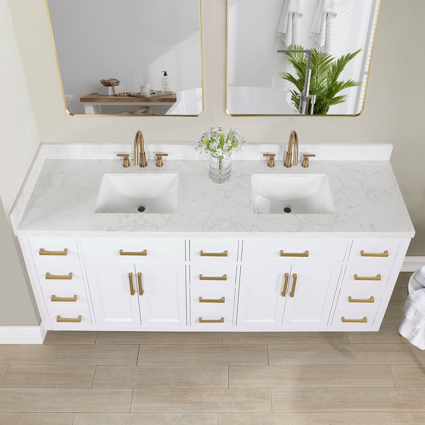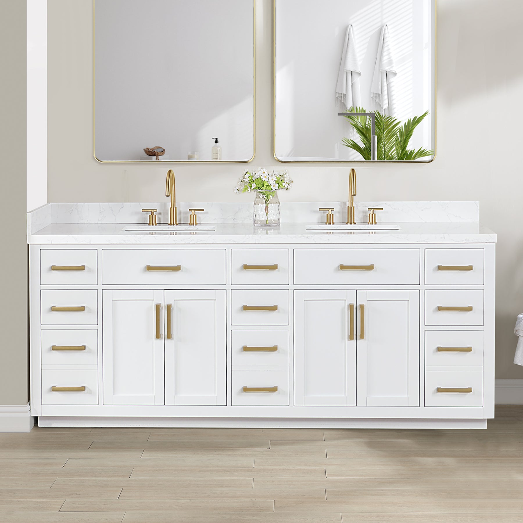 Drawer & Door: 4 soft-closing doors, 2 flip-down drawers, 6 soft-closing drawers, and 3 two-in-one functional drawer to maximize your bathroom storage space.