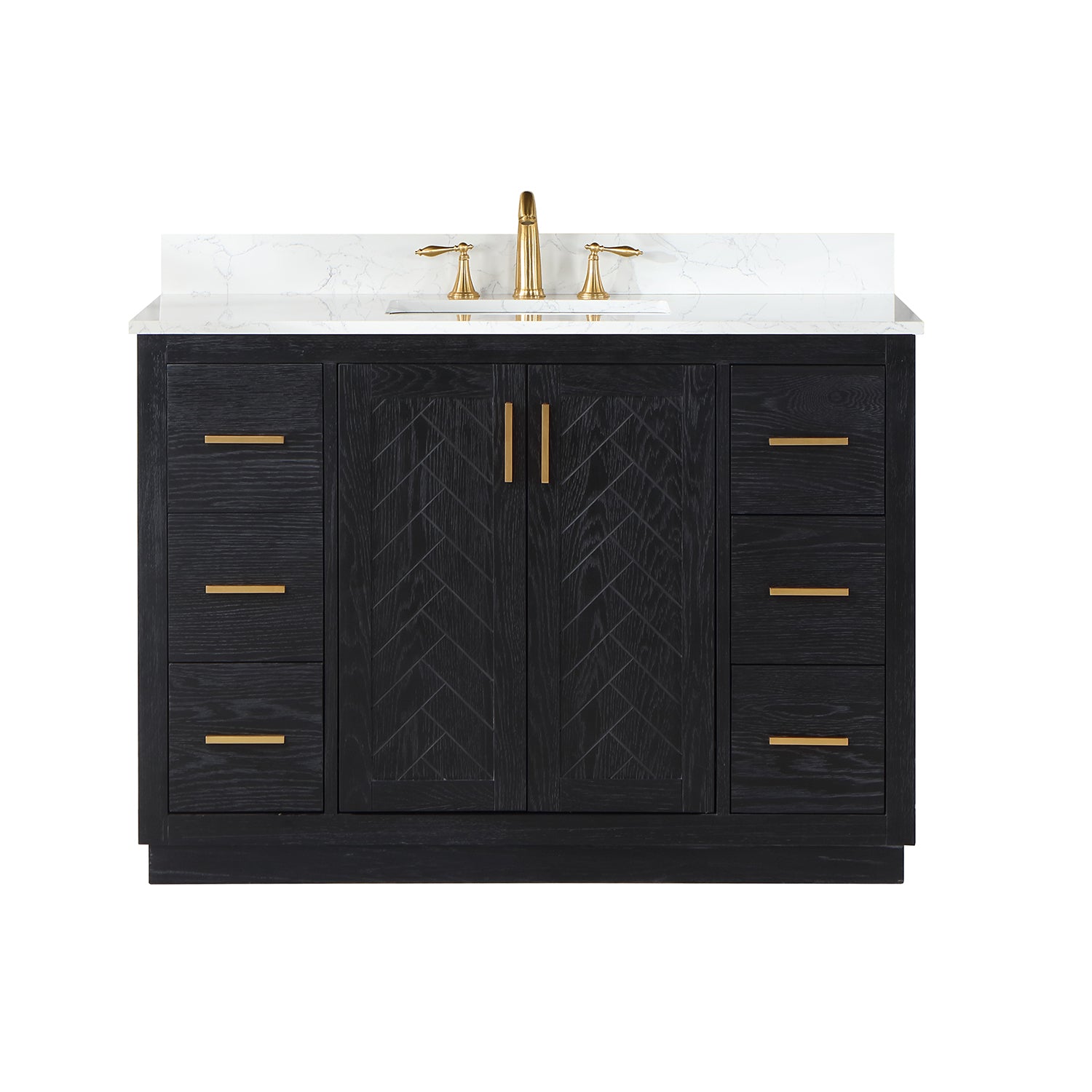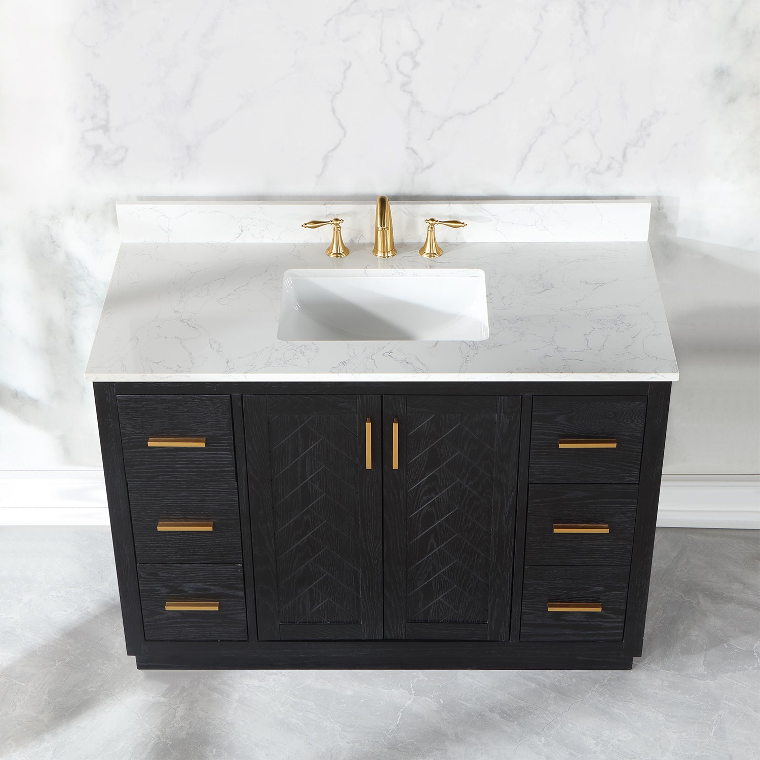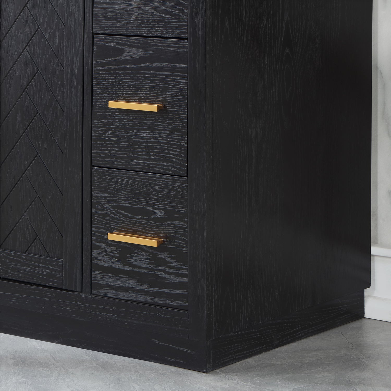 Perfect for the contemporary bathroom, our Gazsi Vanity offers the smart style you want with the everyday functionality you need. Architectural details include textured door panels with a chic chevron pattern as well as a recessed plinth base. Constructed of rugged wood materials, this vanity boasts ample and flexible storage space for all your bath essentials. The marbled Engineered Stone Countertop lends a touch of refinement while providing a striking contrast with the dark-colored modern cabinet.