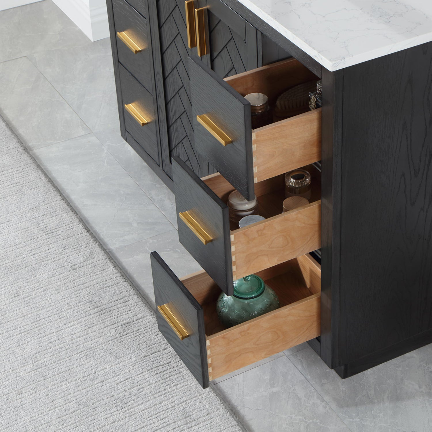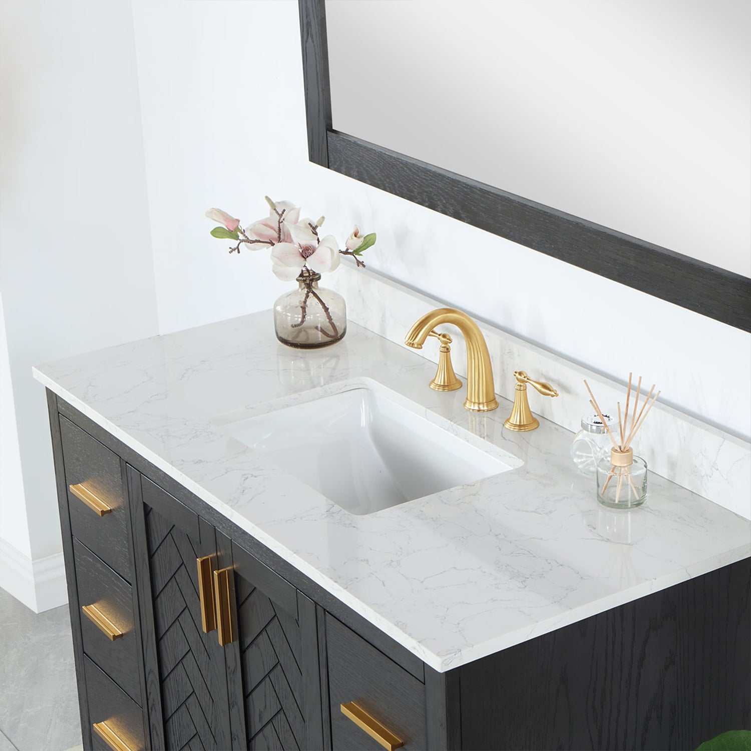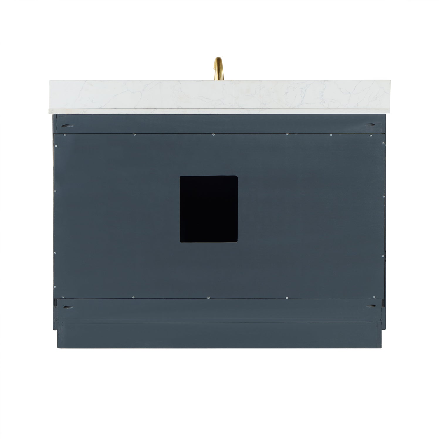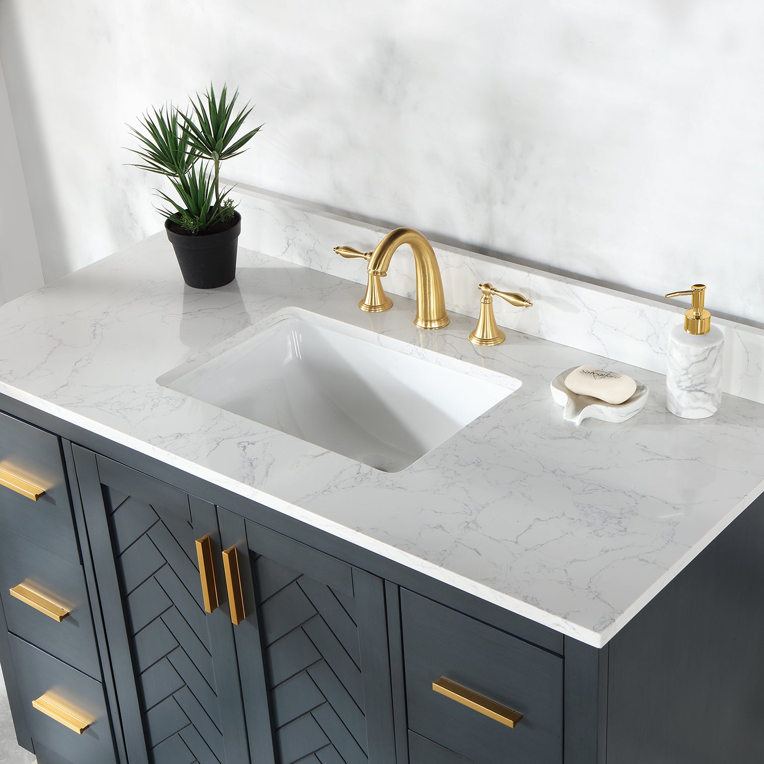 Perfect for the contemporary bathroom, our Gazsi Vanity offers the smart style you want with the everyday functionality you need. Architectural details include textured door panels with a chic chevron pattern as well as a recessed plinth base. Constructed of rugged wood materials, this vanity boasts ample and flexible storage space for all your bath essentials. The marbled Engineered Stone Countertop lends a touch of refinement while providing a striking contrast with the dark-colored modern cabinet.
