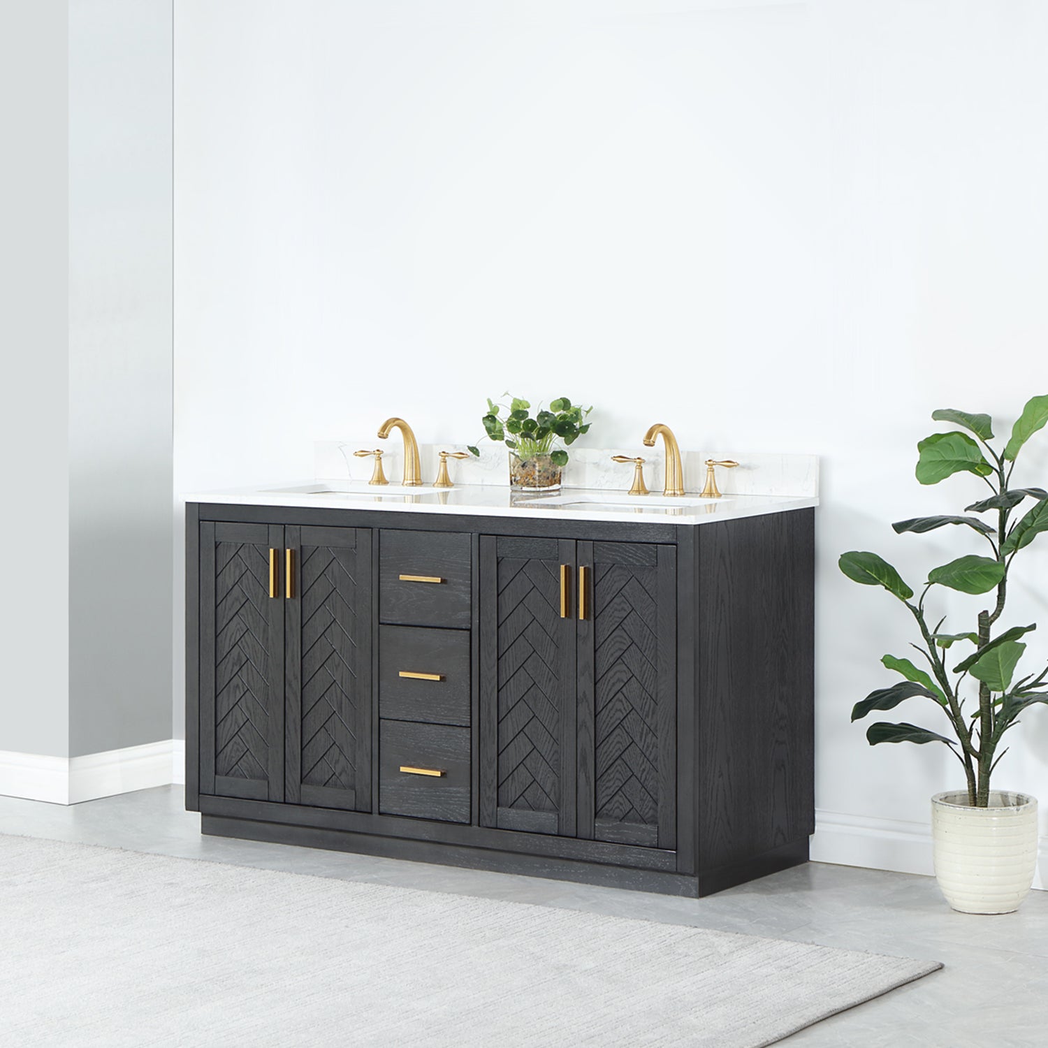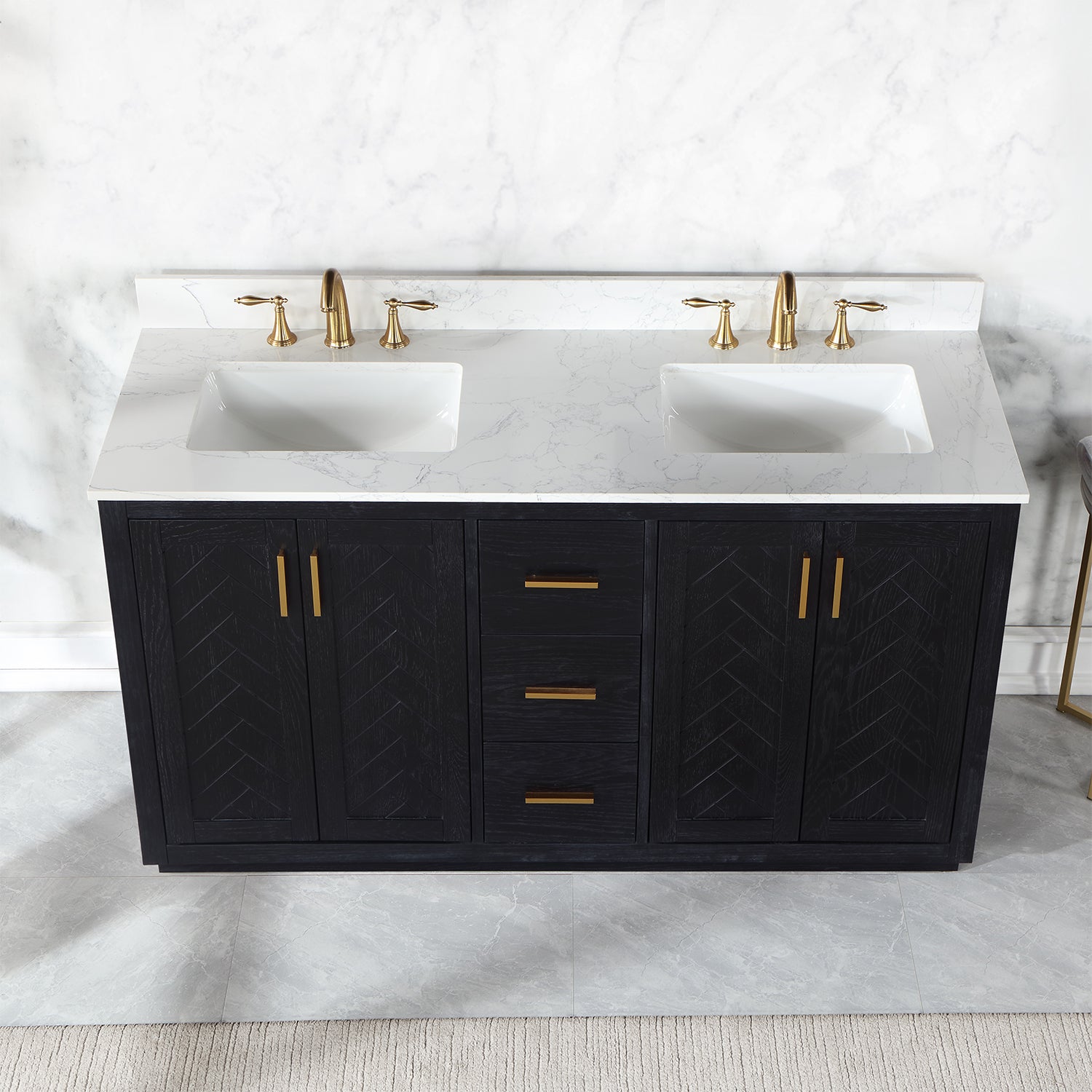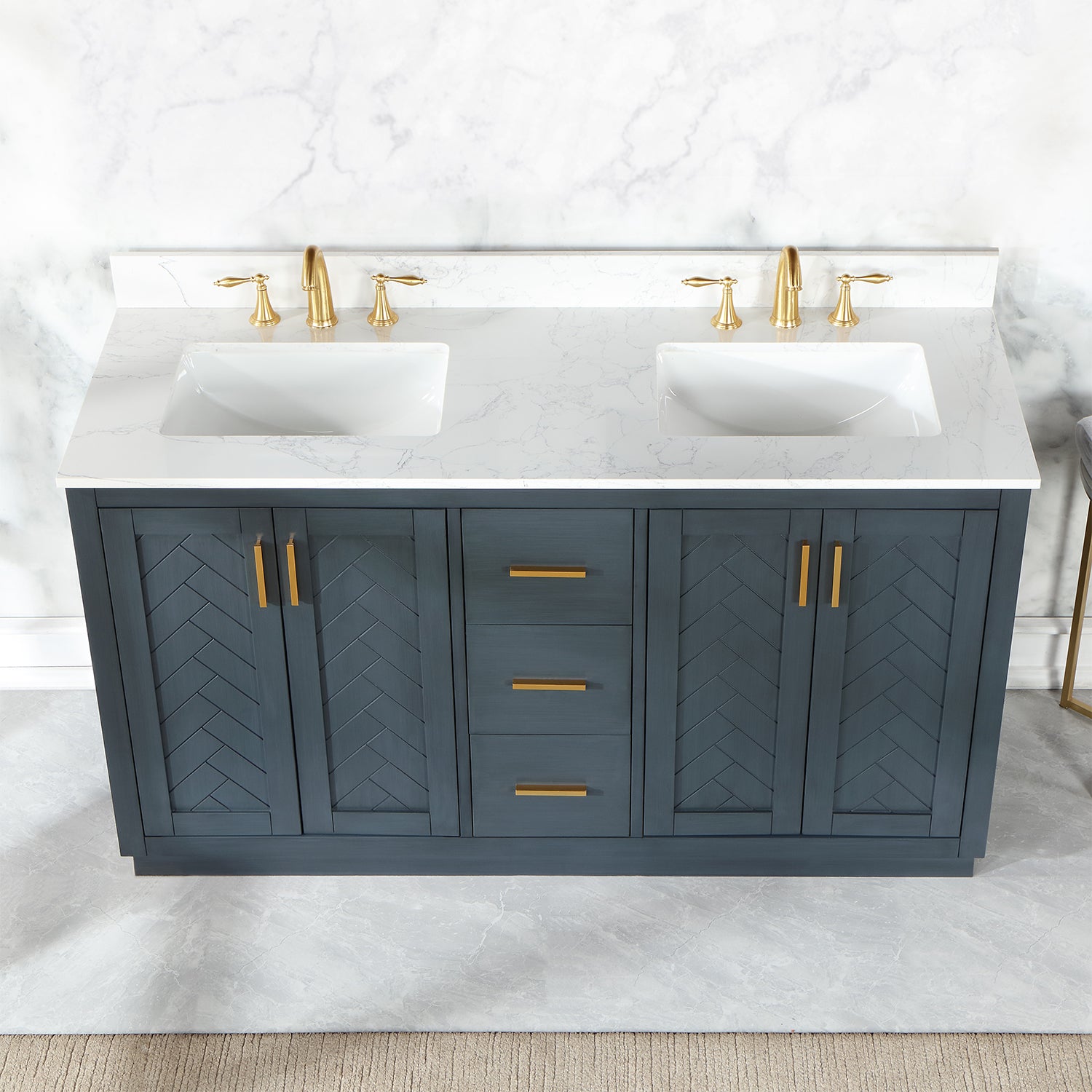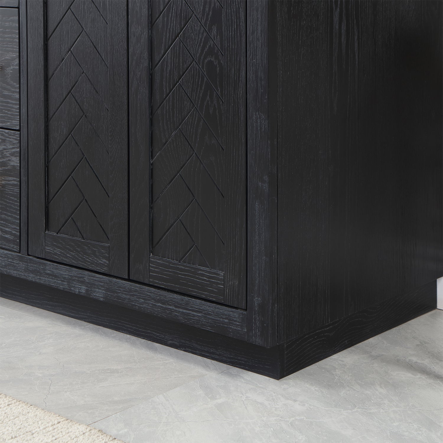 Perfect for the contemporary bathroom, our Gazsi Vanity offers the smart style you want with the everyday functionality you need. Architectural details include textured door panels with a chic chevron pattern as well as a recessed plinth base. Constructed of rugged wood materials, this vanity boasts ample and flexible storage space for all your bath essentials. The marbled Engineered Stone Countertop lends a touch of refinement while providing a striking contrast with the dark-colored modern cabinet.