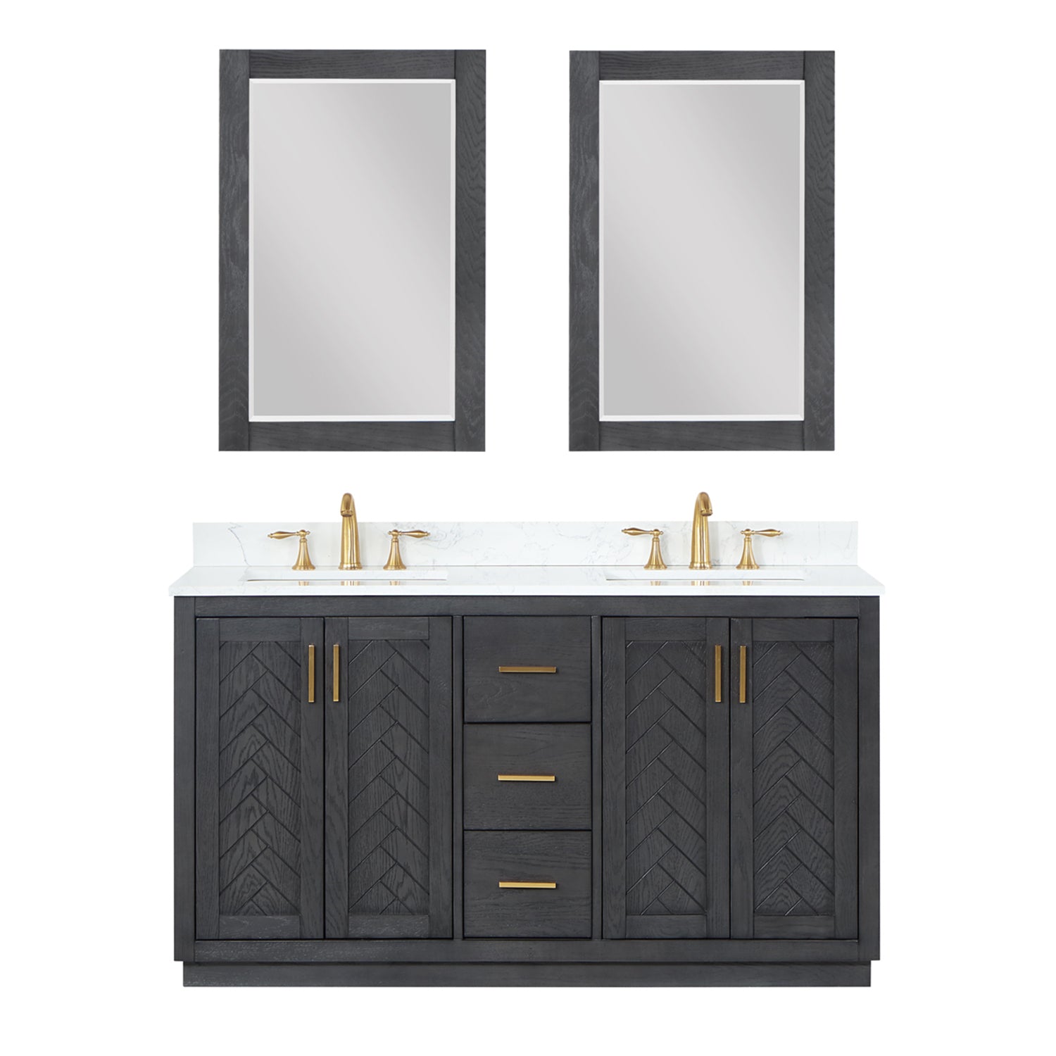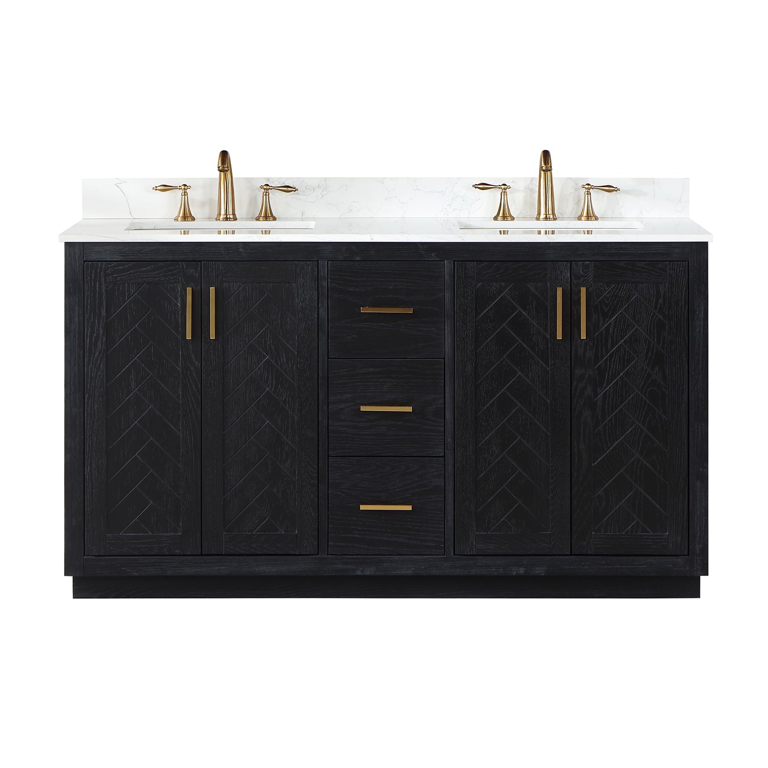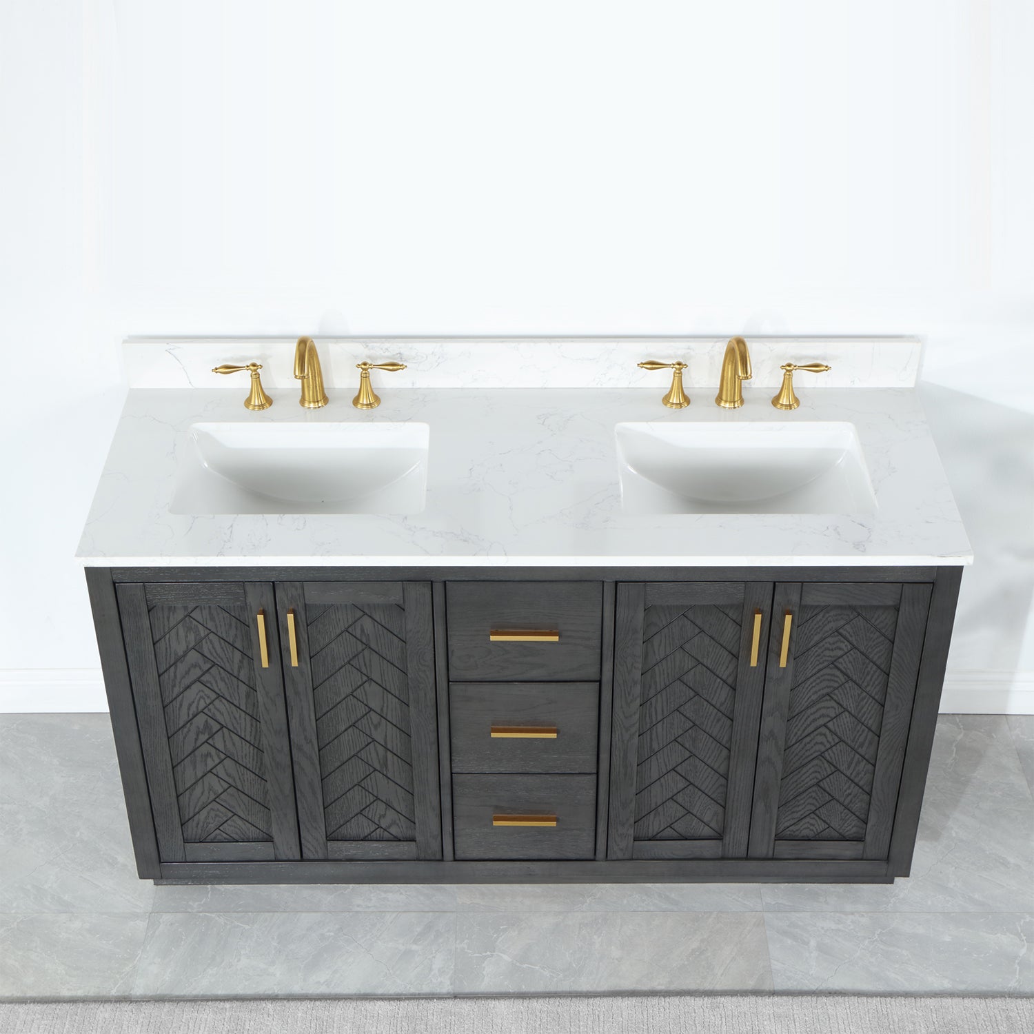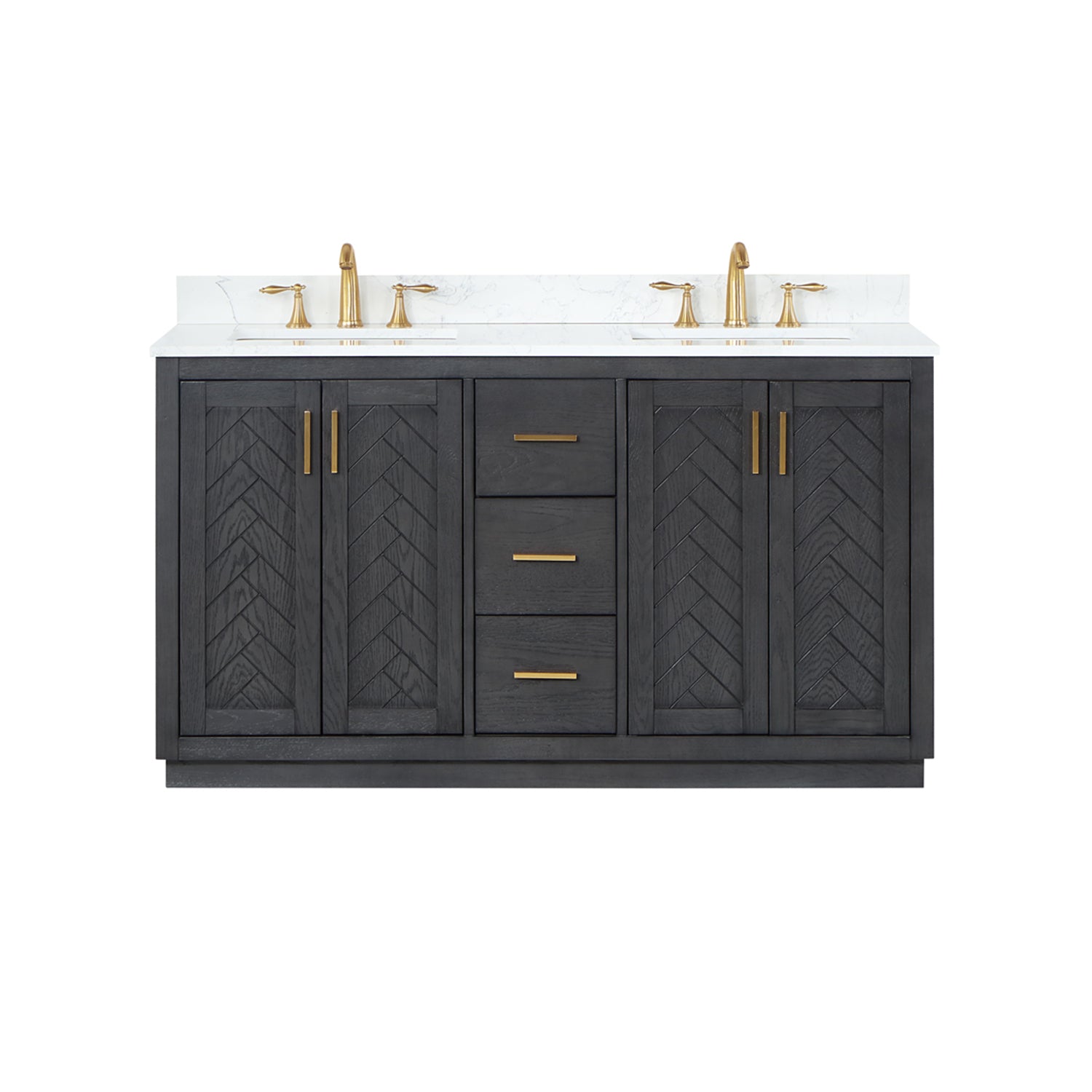 Perfect for the contemporary bathroom, our Gazsi Vanity offers the smart style you want with the everyday functionality you need. Architectural details include textured door panels with a chic chevron pattern as well as a recessed plinth base. Constructed of rugged wood materials, this vanity boasts ample and flexible storage space for all your bath essentials. The marbled Engineered Stone Countertop lends a touch of refinement while providing a striking contrast with the dark-colored modern cabinet.