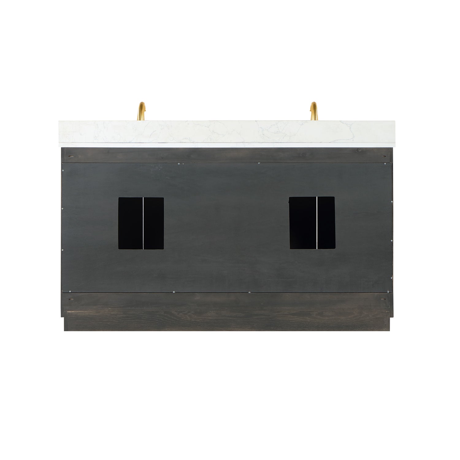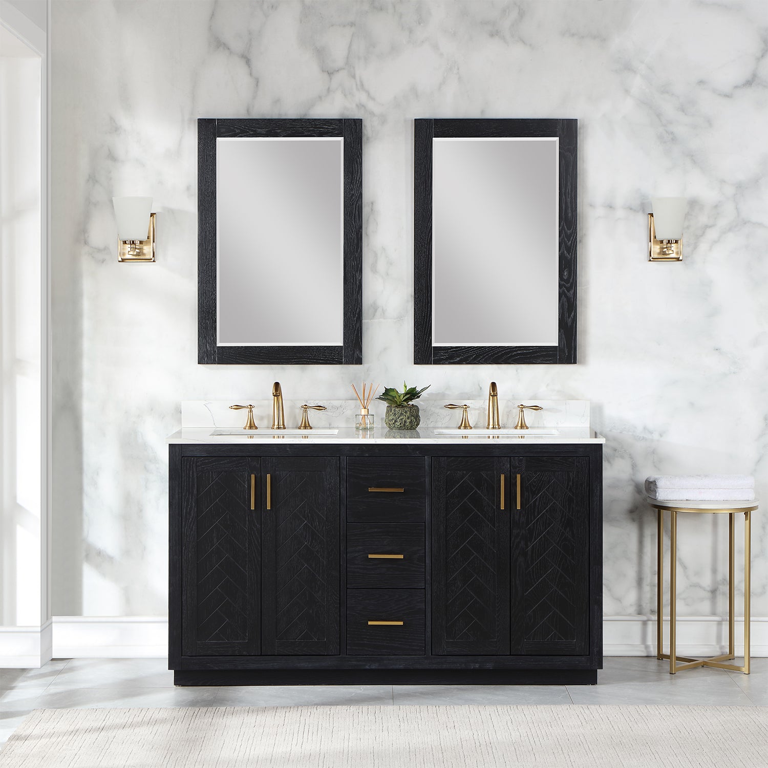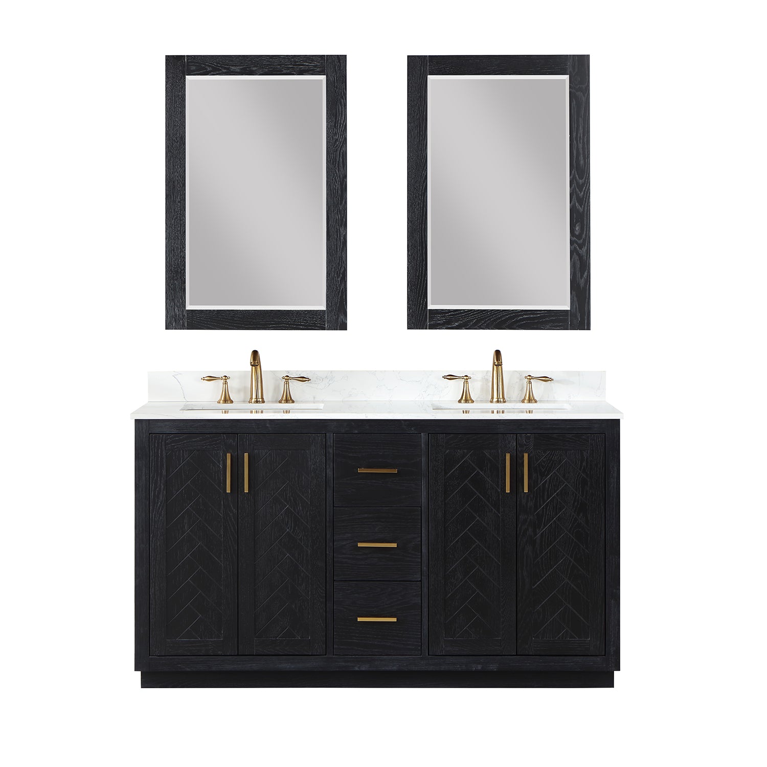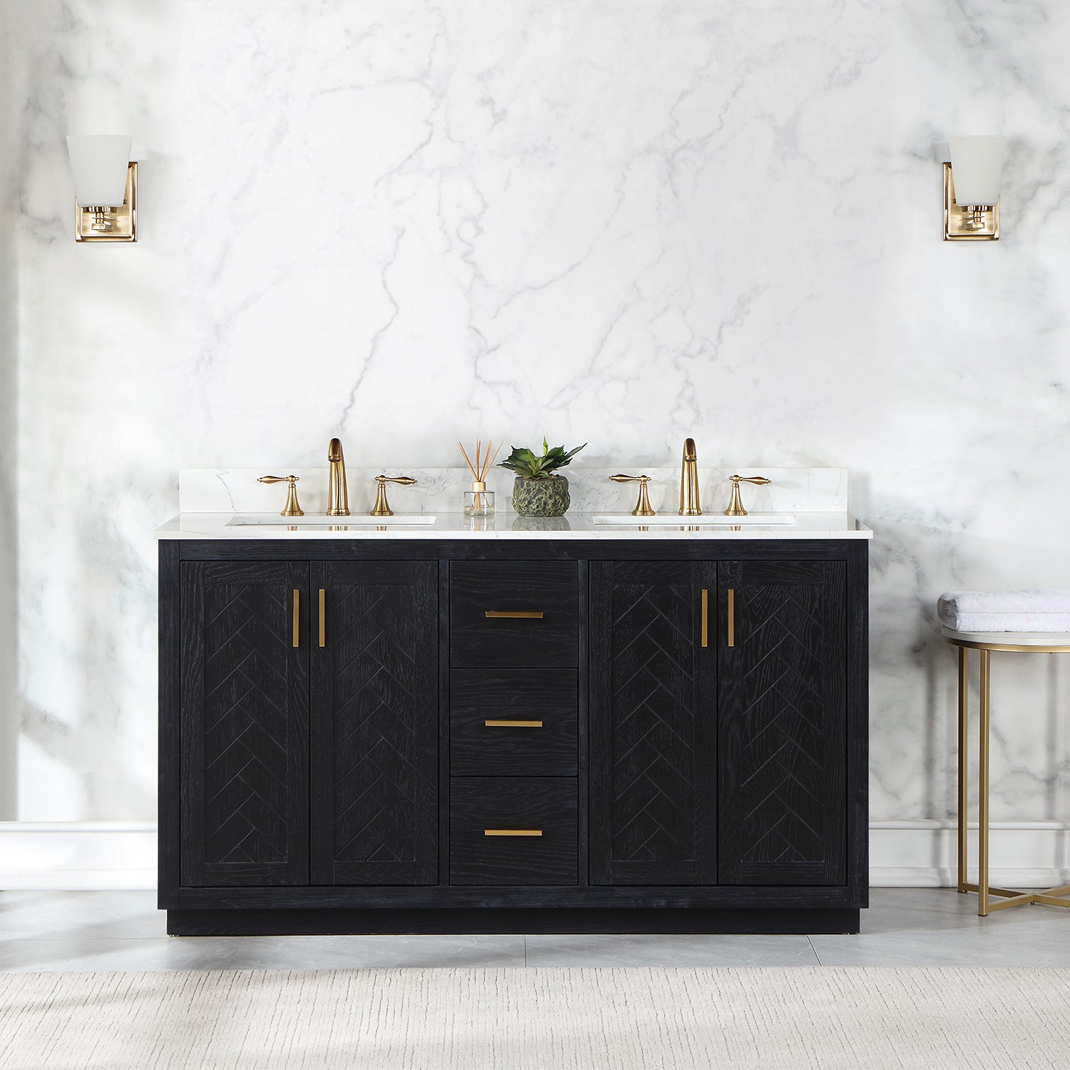 Perfect for the contemporary bathroom, our Gazsi Vanity offers the smart style you want with the everyday functionality you need. Architectural details include textured door panels with a chic chevron pattern as well as a recessed plinth base. Constructed of rugged wood materials, this vanity boasts ample and flexible storage space for all your bath essentials. The marbled Engineered Stone Countertop lends a touch of refinement while providing a striking contrast with the dark-colored modern cabinet.