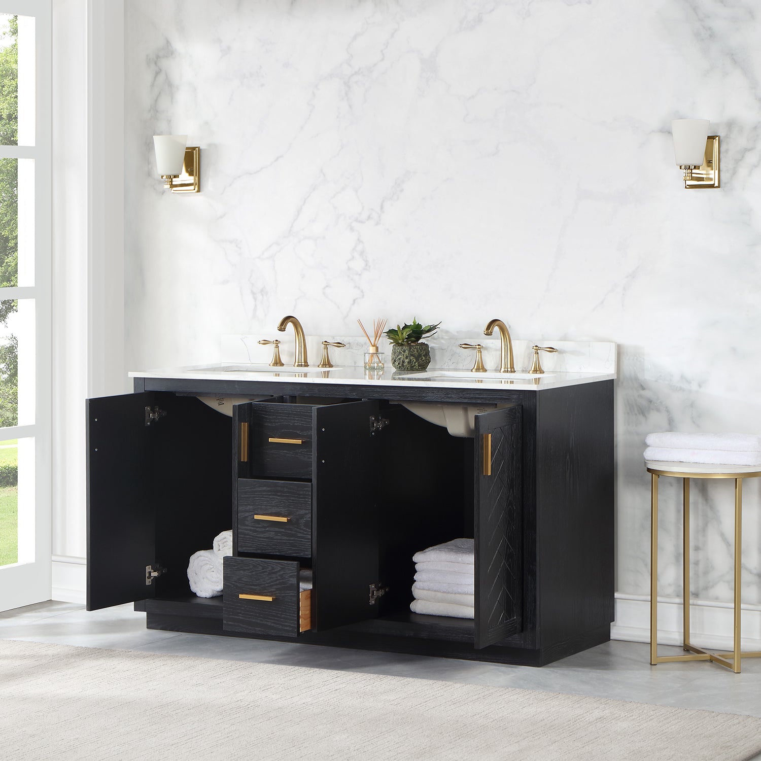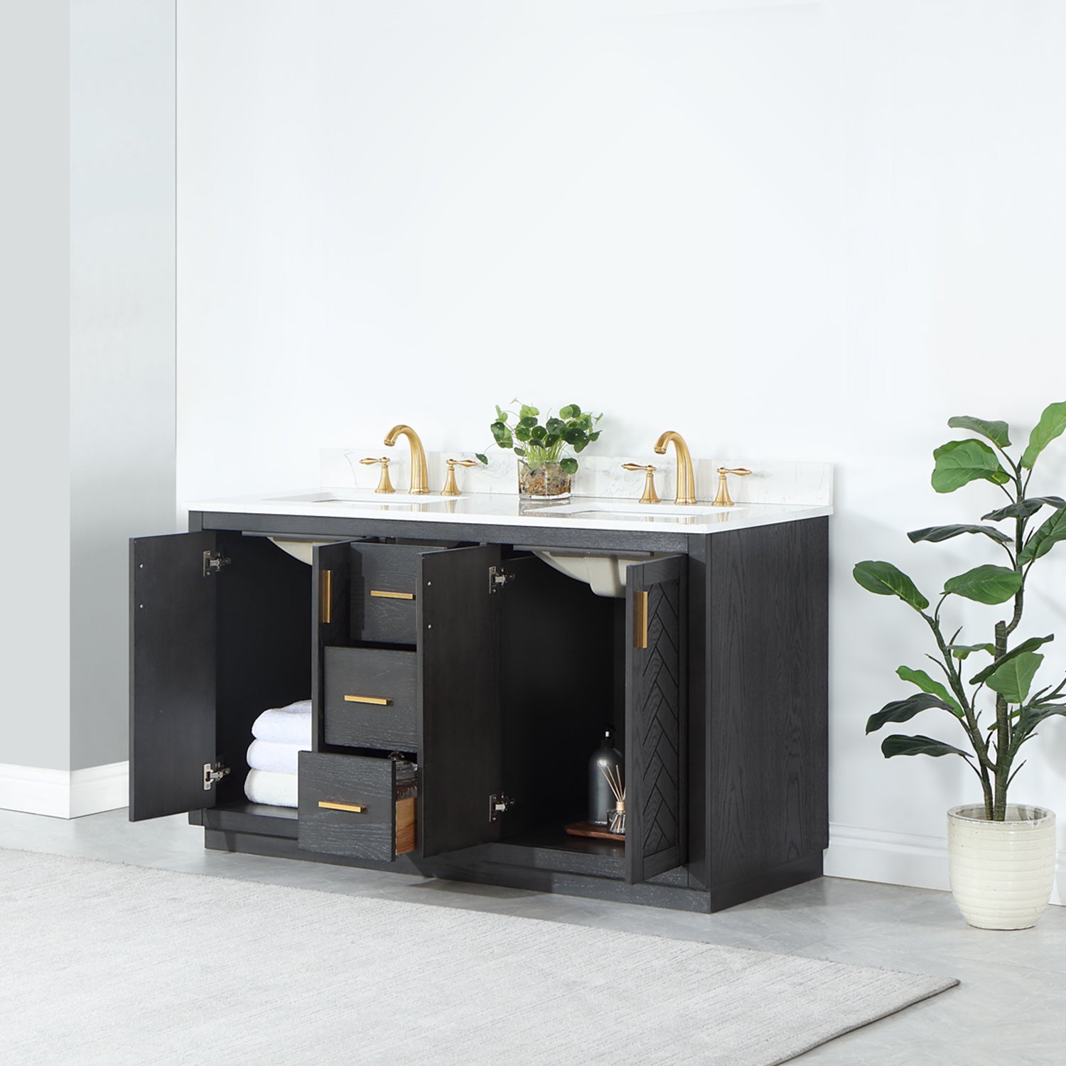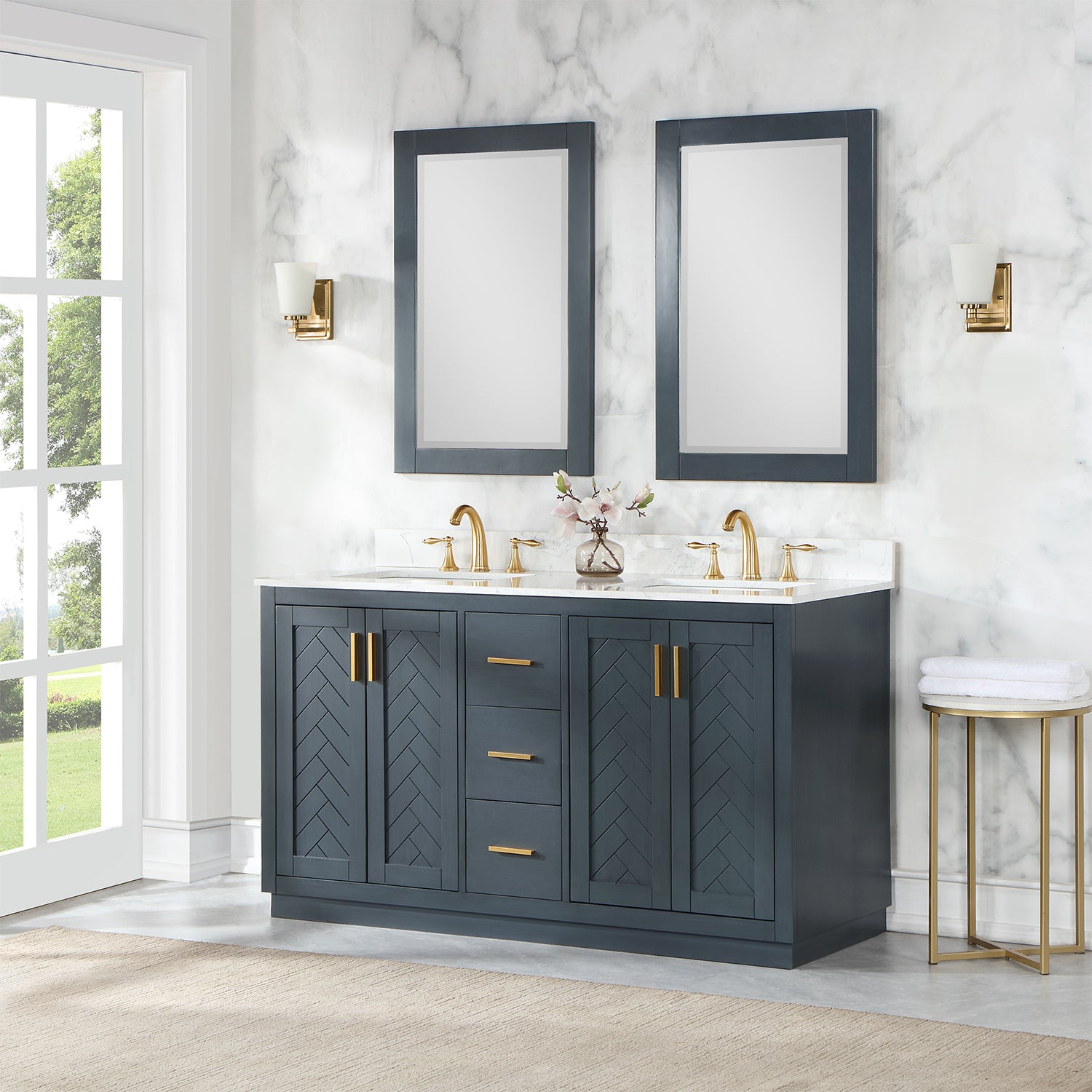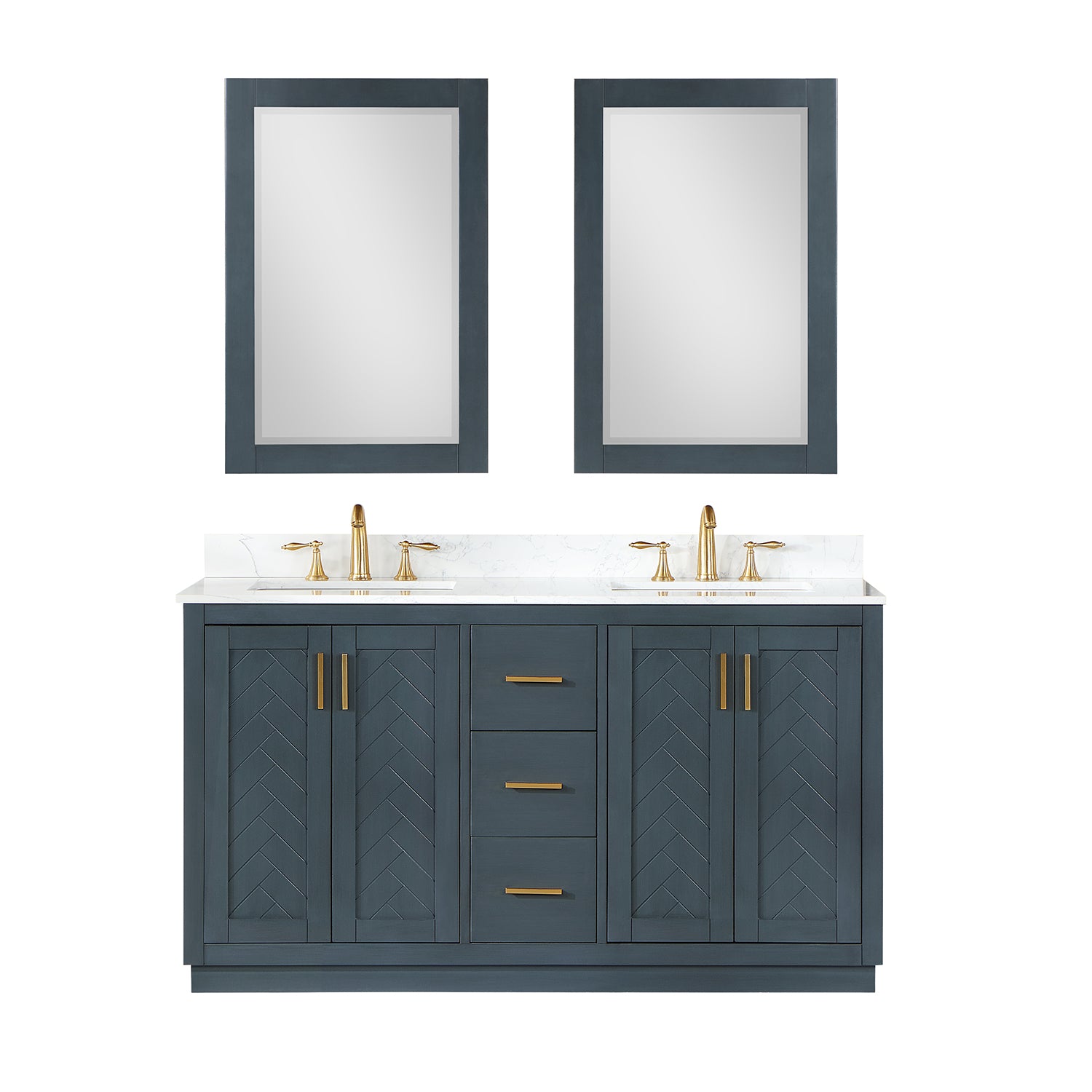 Perfect for the contemporary bathroom, our Gazsi Vanity offers the smart style you want with the everyday functionality you need. Architectural details include textured door panels with a chic chevron pattern as well as a recessed plinth base. Constructed of rugged wood materials, this vanity boasts ample and flexible storage space for all your bath essentials. The marbled Engineered Stone Countertop lends a touch of refinement while providing a striking contrast with the dark-colored modern cabinet.
