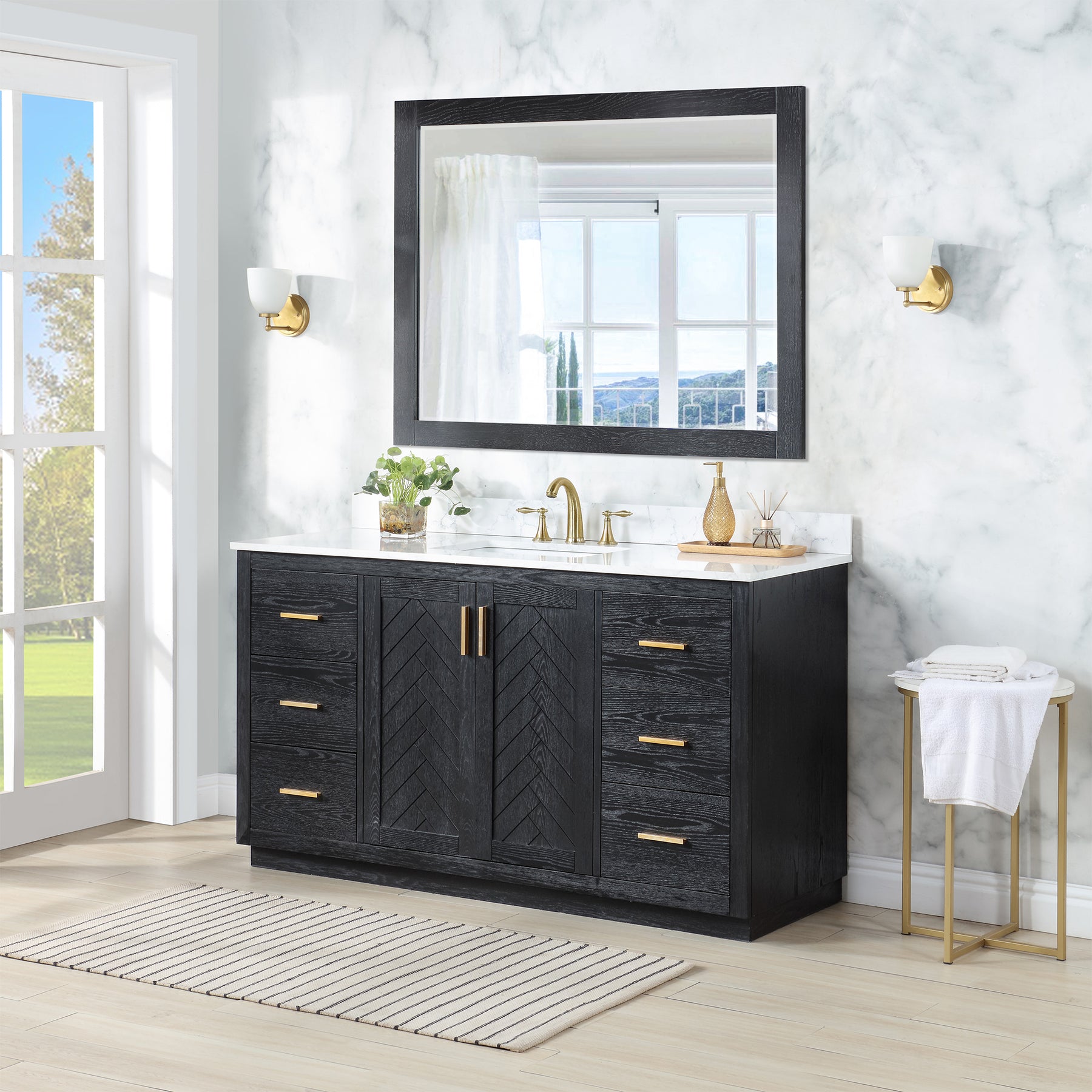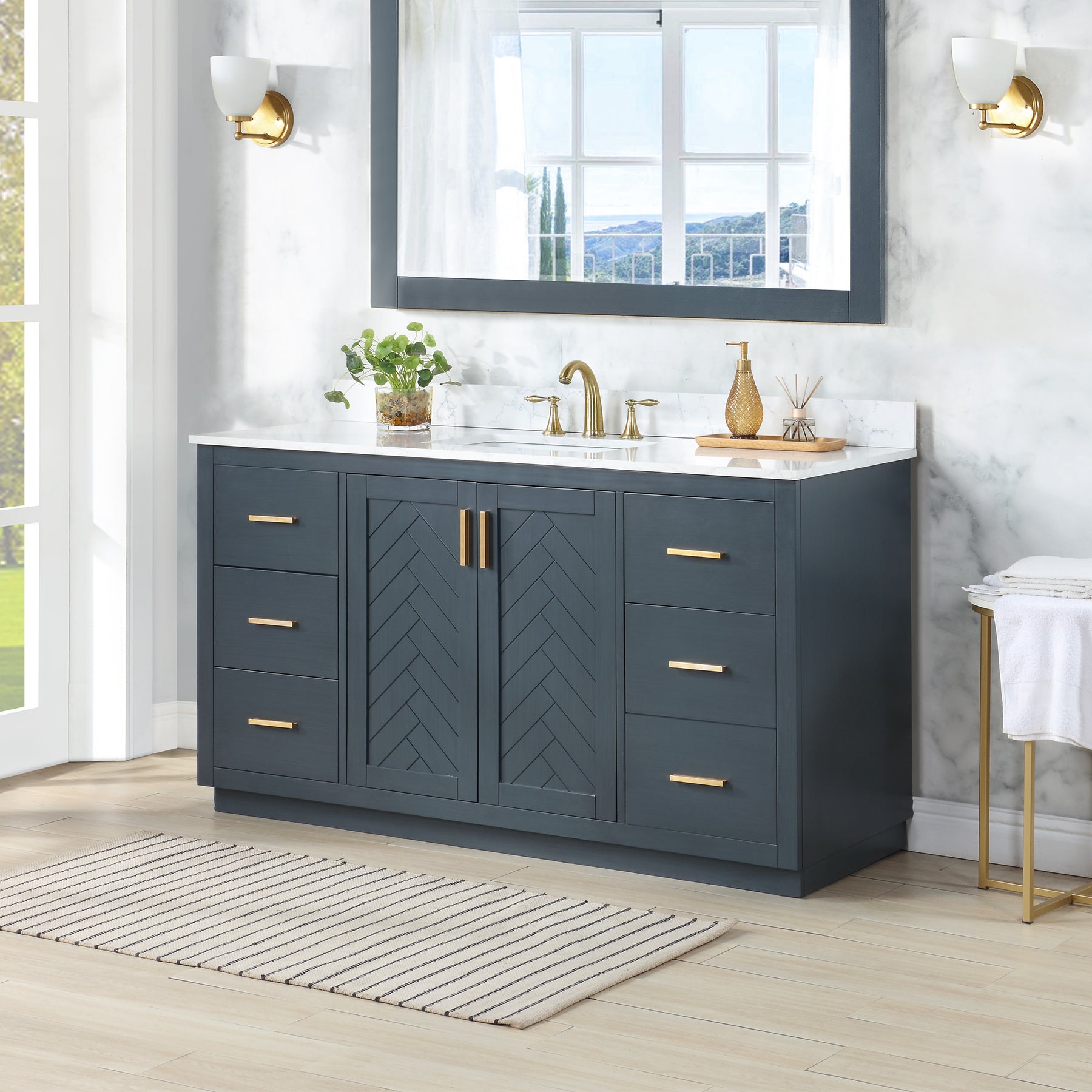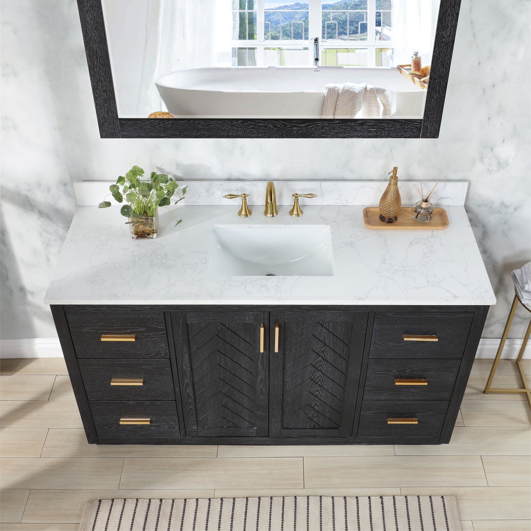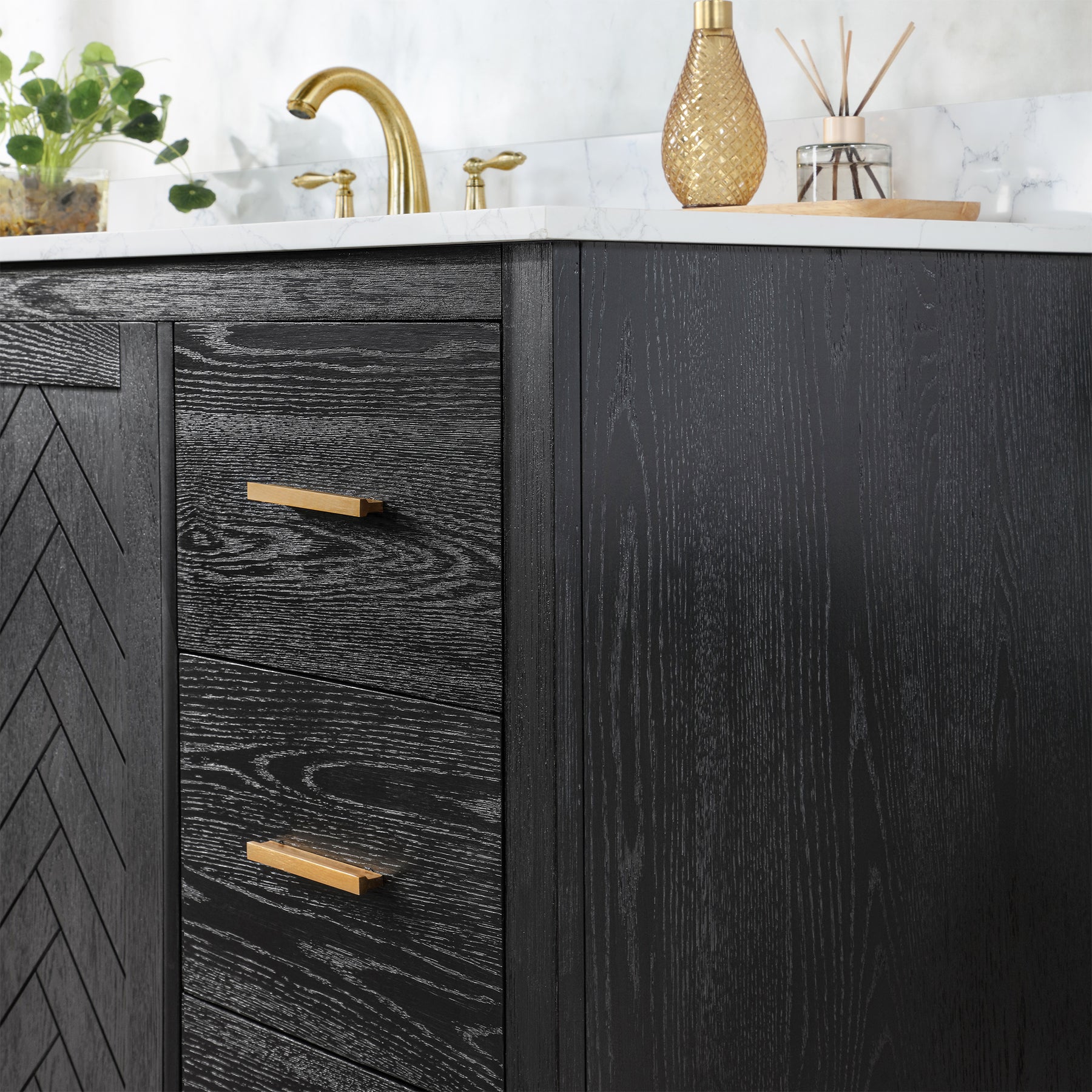 Perfect for the contemporary bathroom, our Gazsi Vanity offers the smart style you want with the everyday functionality you need. Architectural details include textured door panels with a chic chevron pattern as well as a recessed plinth base. Constructed of rugged wood materials, this vanity boasts ample and flexible storage space for all your bath essentials. The marbled Engineered Stone Countertop lends a touch of refinement while providing a striking contrast with the dark-colored modern cabinet.