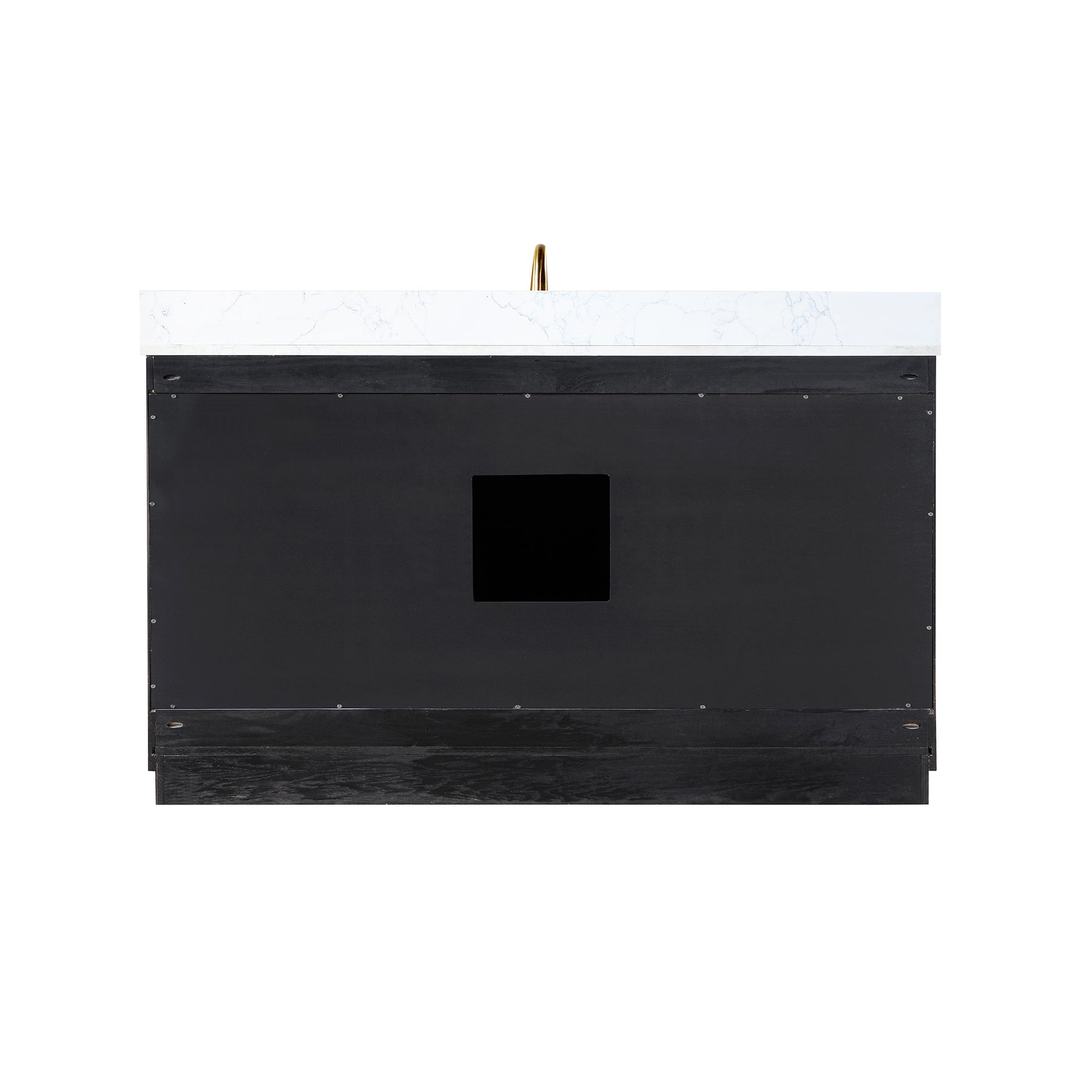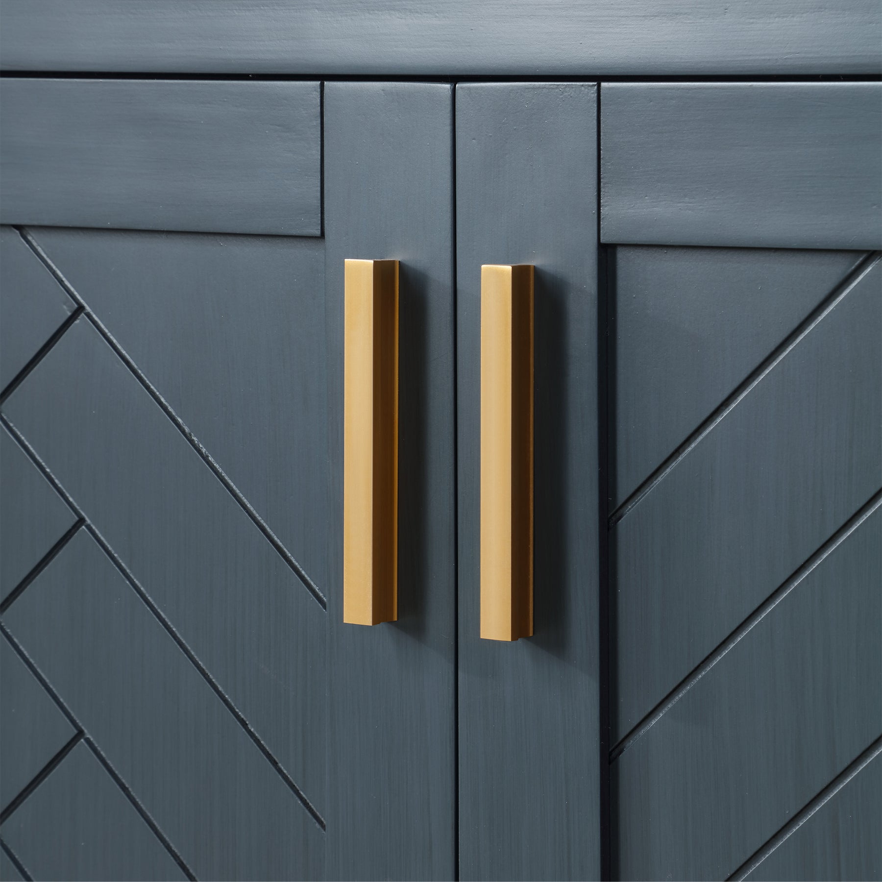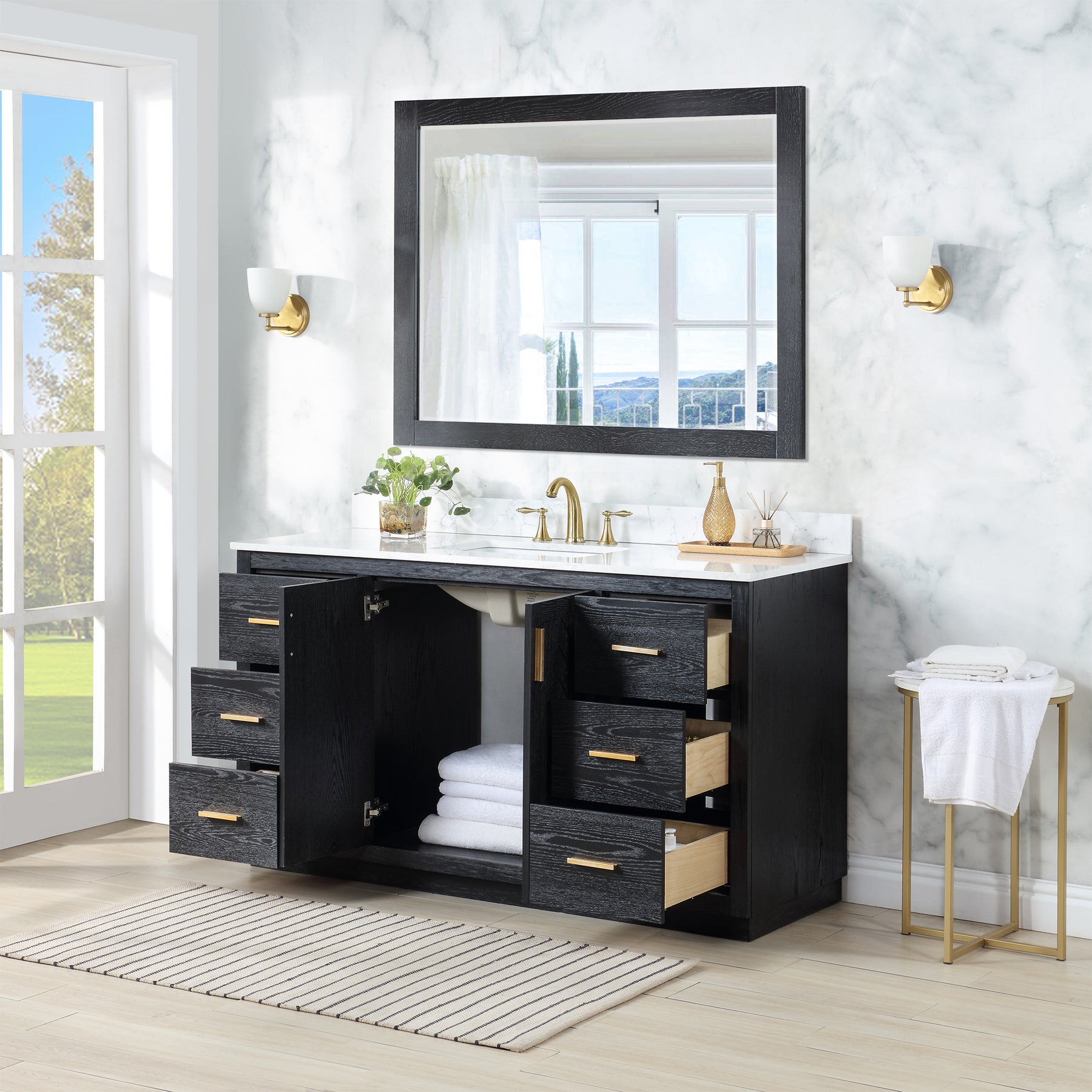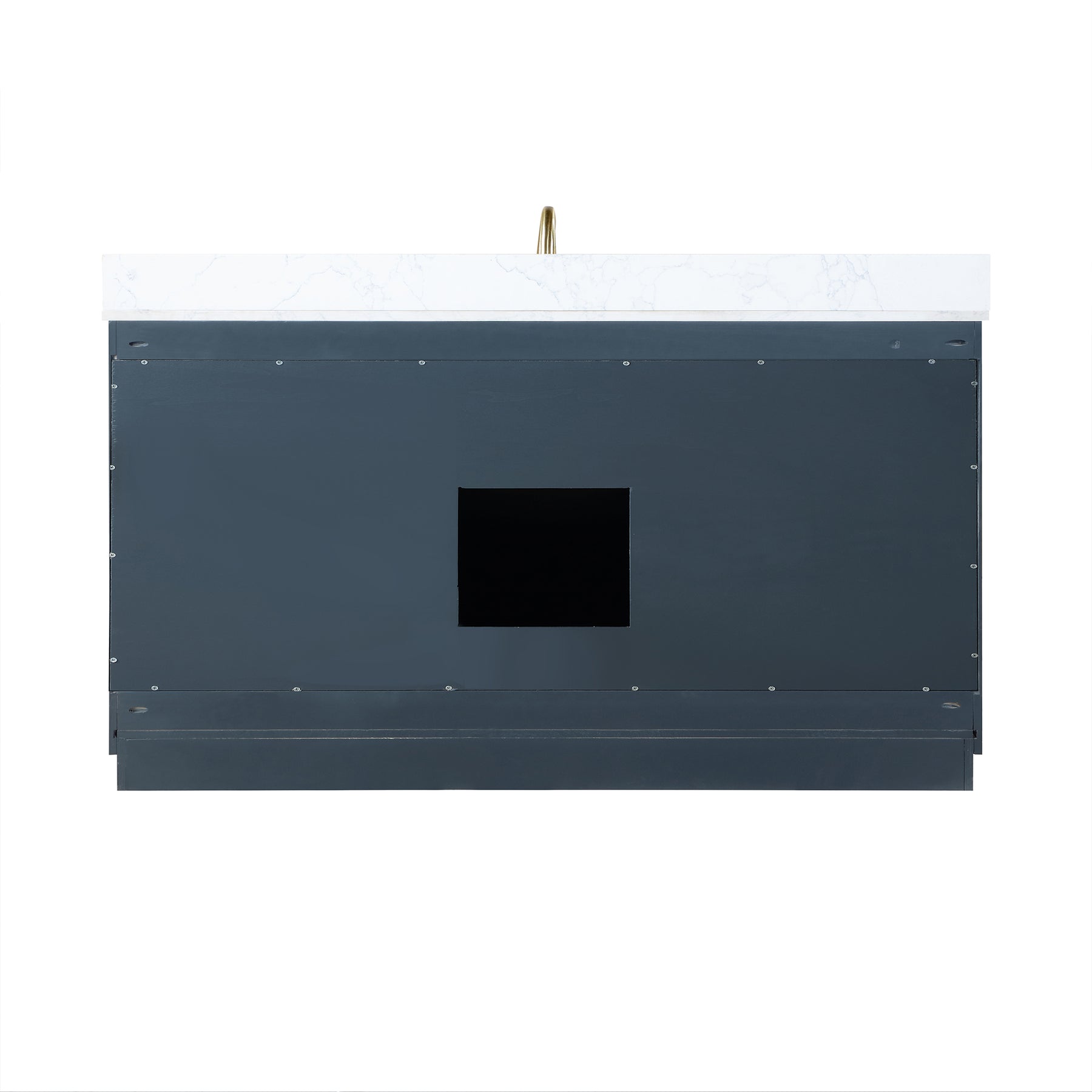 Perfect for the contemporary bathroom, our Gazsi Vanity offers the smart style you want with the everyday functionality you need. Architectural details include textured door panels with a chic chevron pattern as well as a recessed plinth base. Constructed of rugged wood materials, this vanity boasts ample and flexible storage space for all your bath essentials. The marbled Engineered Stone Countertop lends a touch of refinement while providing a striking contrast with the dark-colored modern cabinet.