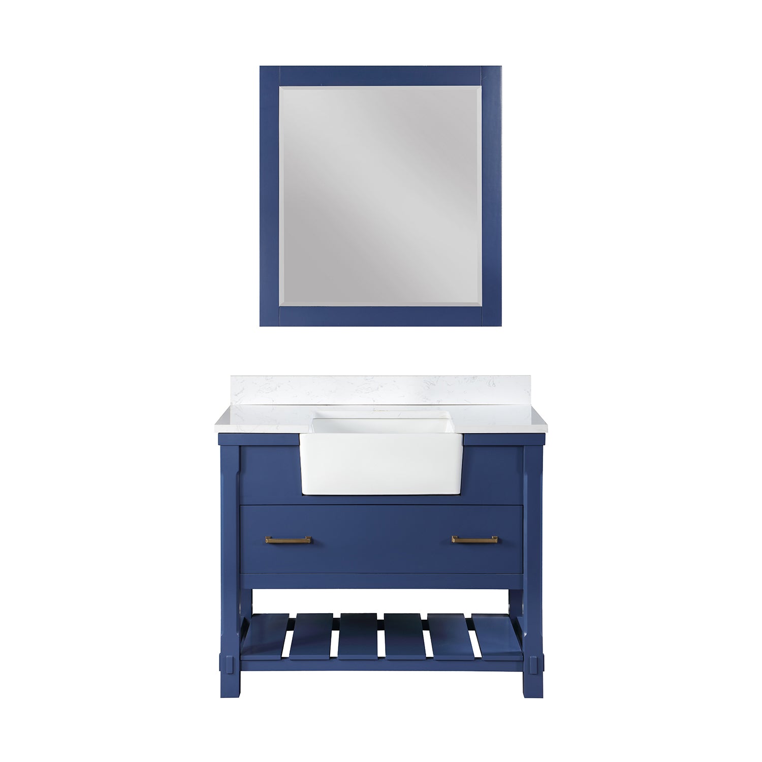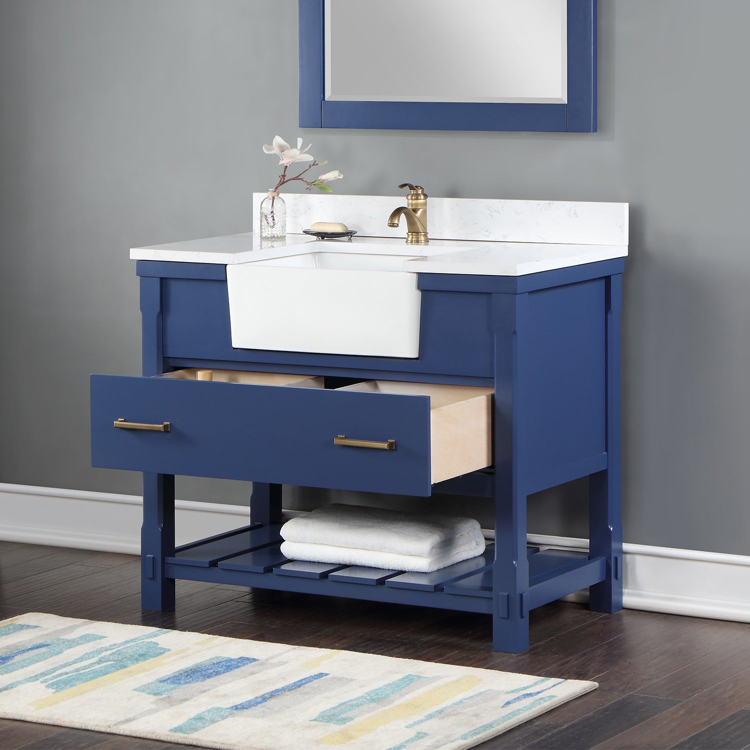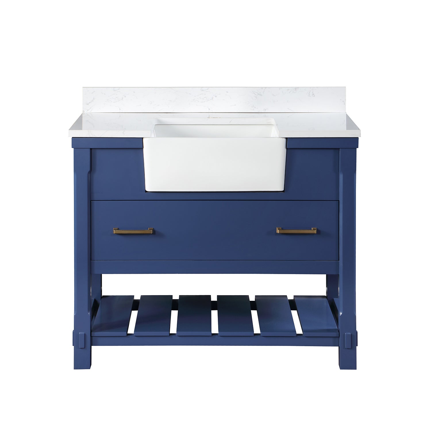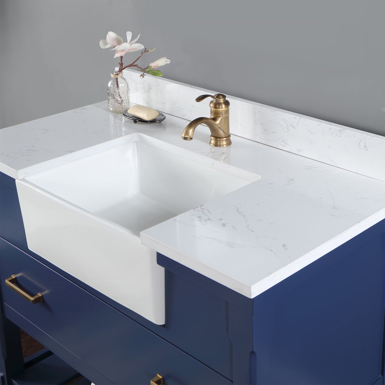 Georgia is that show stopping, breathtaking piece of furniture your bathroom is in need of! Featuring a classic apron-style sink, Aosta White Engineered Stone Countertop and matching backsplash which includes a farmhouse style ceramic under-mount sink, this piece lends affordable style to any guest or master bath. It has an open bay at the bottom that's perfect for fluffy spa towels, toiletries or decorative items.