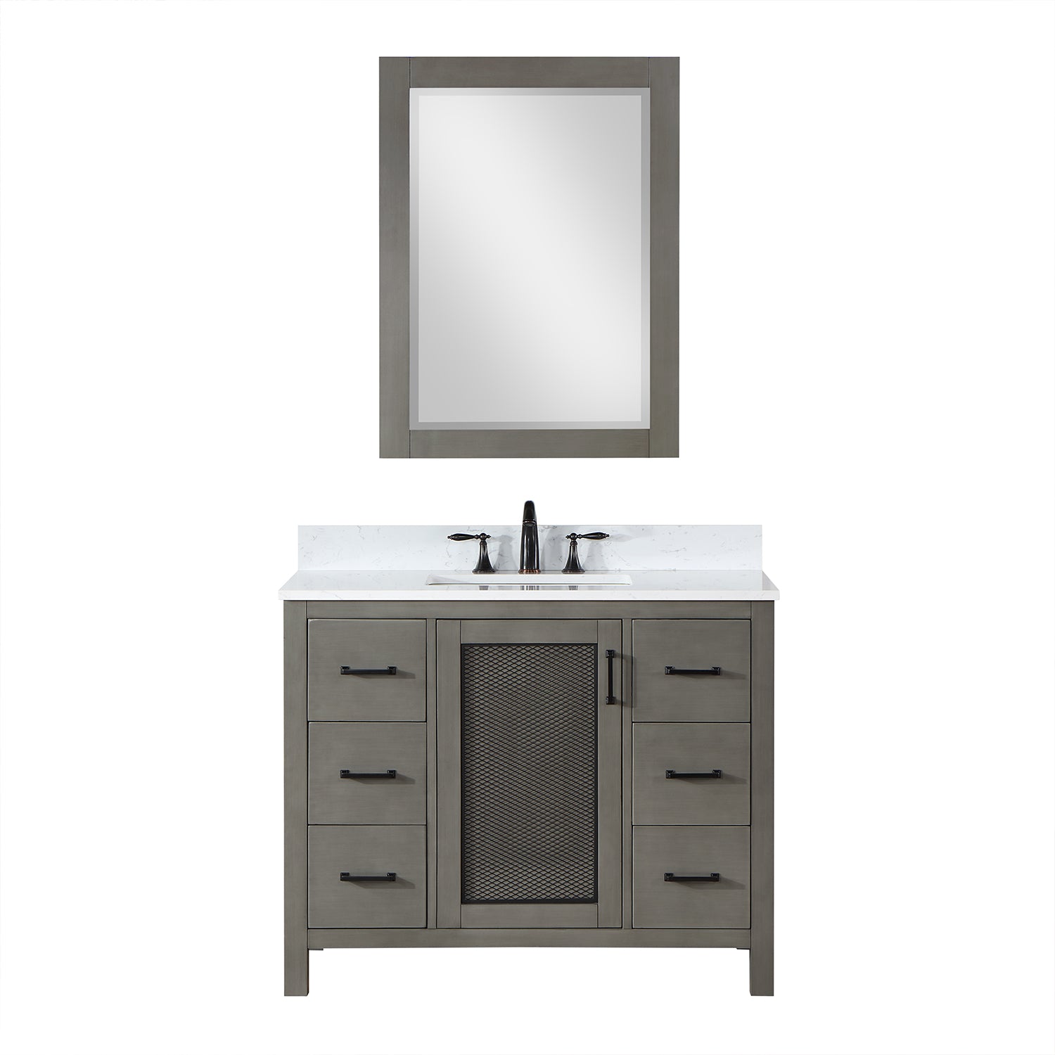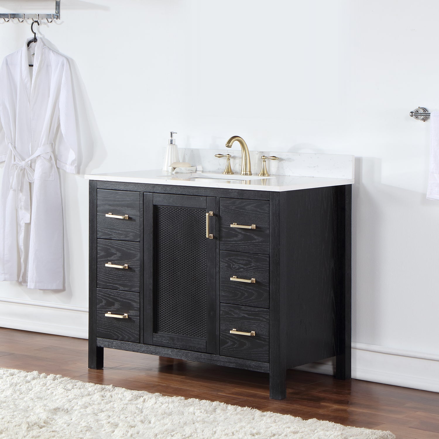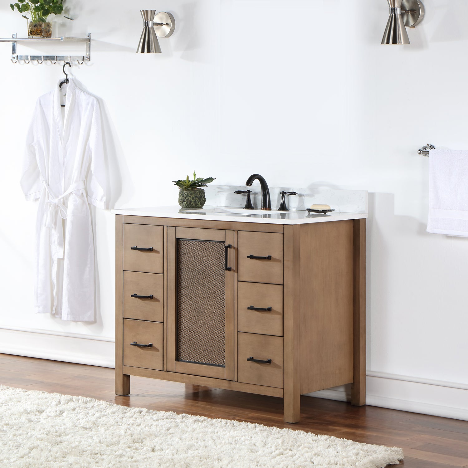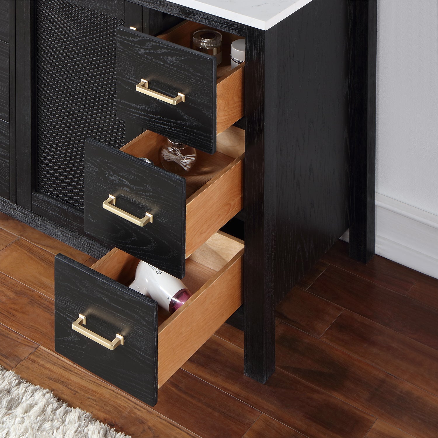 With its compelling blend of wood, metal, and stone, our Hadiya Vanity has an industrial style edge. Metal mesh inserts on the cabinet doors lend a dash of bold texture, concealing spacious storage for stowing away towels, cleaning supplies, and toiletries. Soft-closing drawers provide additional storage flexibility to help keep your space tidy. This sturdy and well-constructed vanity is capped with a beautiful, easy-to-clean composite-stone countertop that provides a stunning parallel with the natural wood grain.