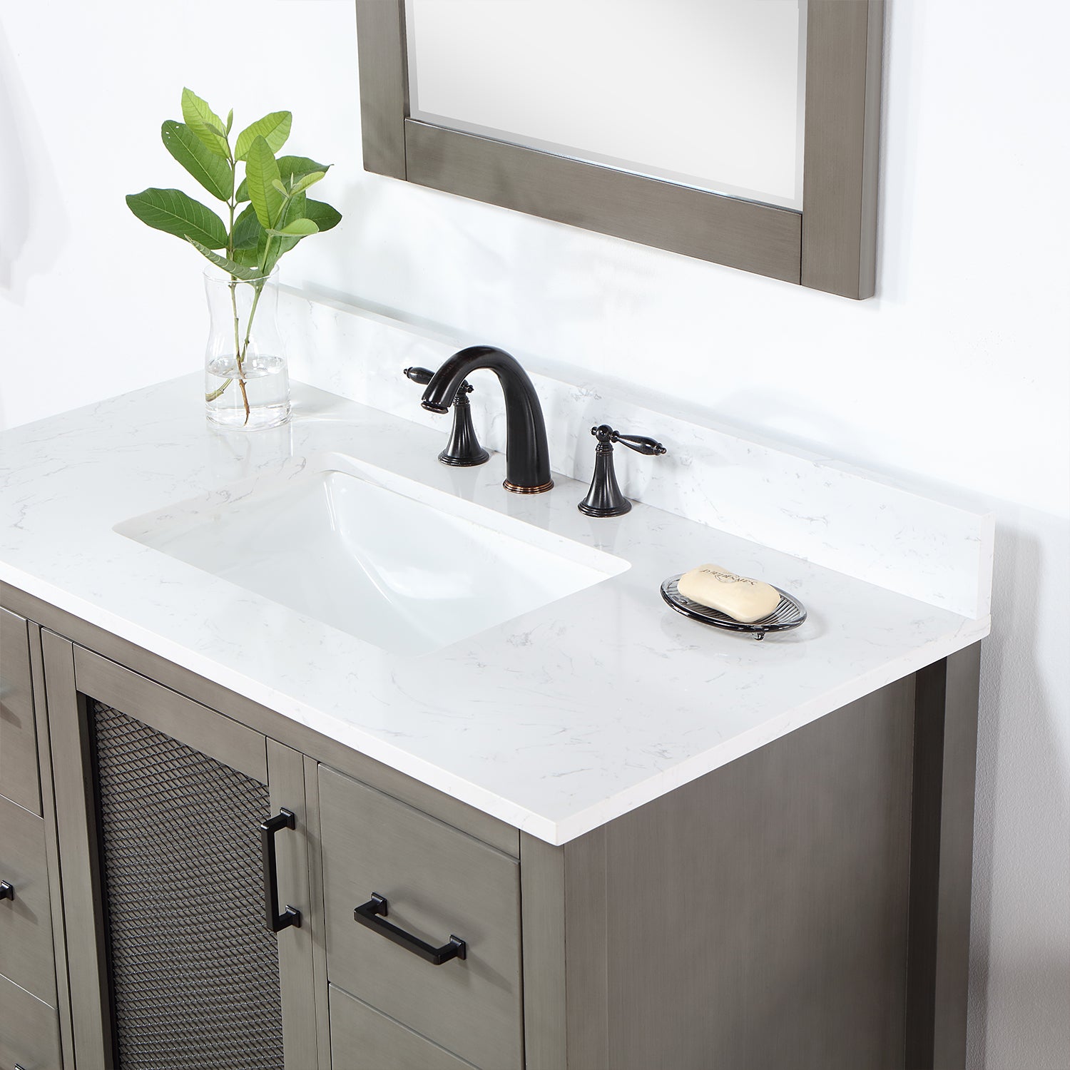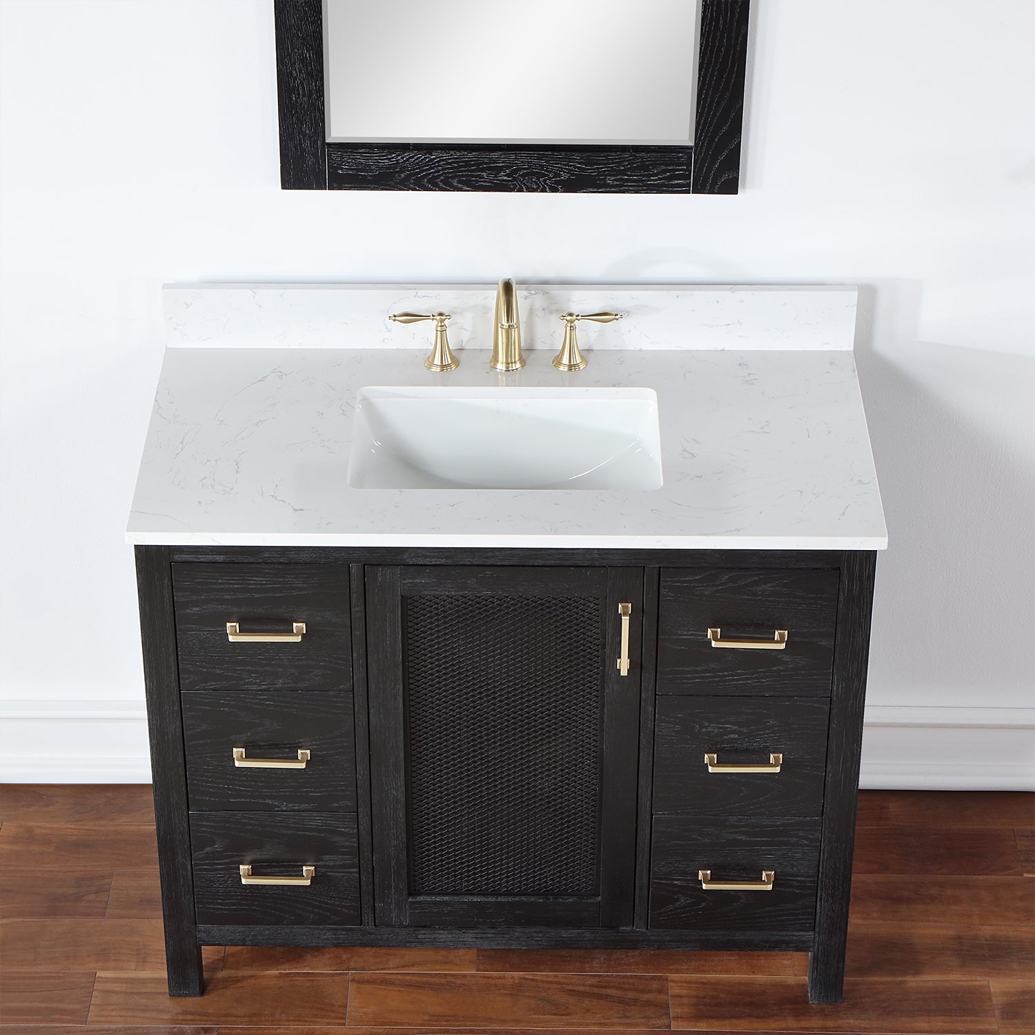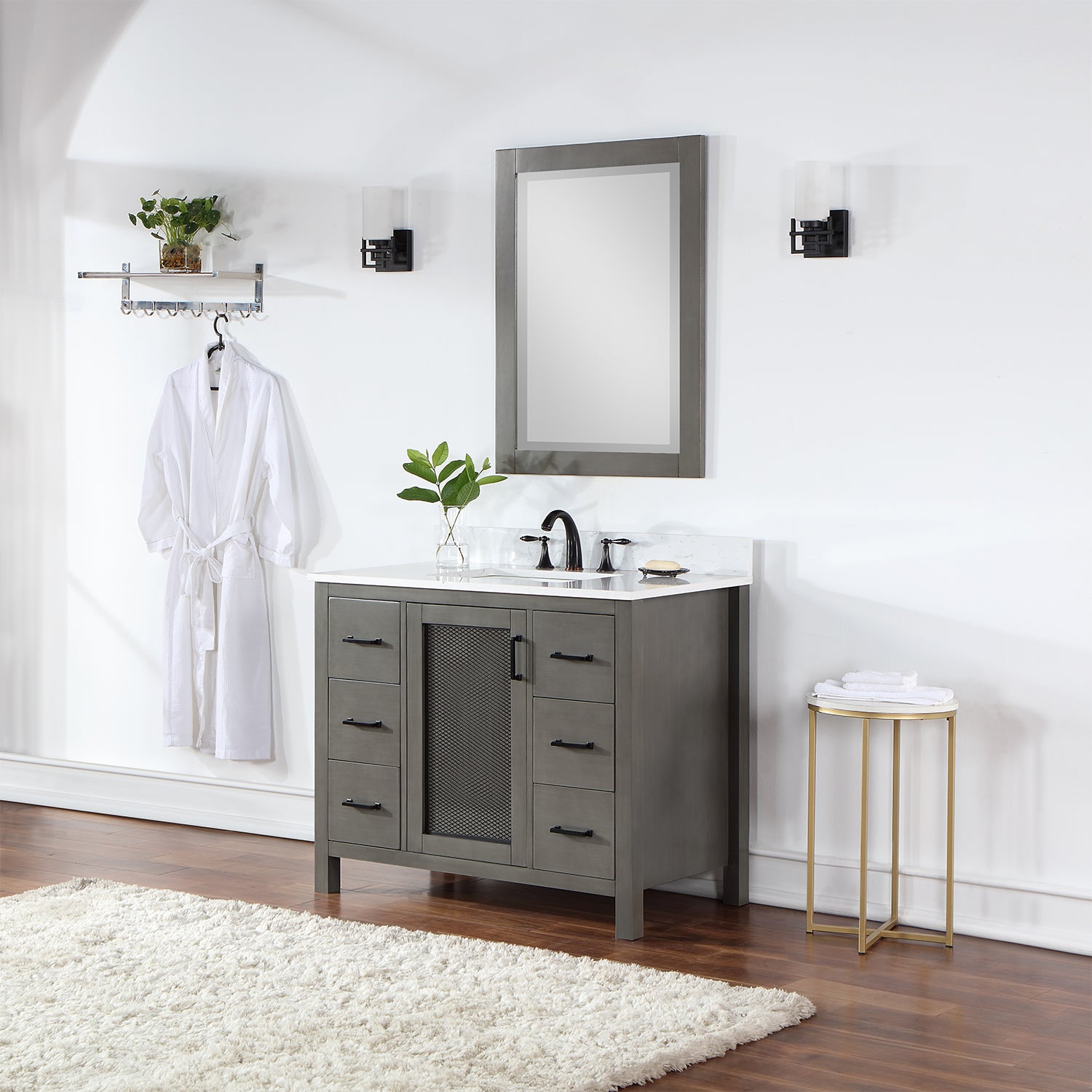 With its compelling blend of wood, metal, and stone, our Hadiya Vanity has an industrial style edge. Metal mesh inserts on the cabinet doors lend a dash of bold texture, concealing spacious storage for stowing away towels, cleaning supplies, and toiletries. Soft-closing drawers provide additional storage flexibility to help keep your space tidy. This sturdy and well-constructed vanity is capped with a beautiful, easy-to-clean composite-stone countertop that provides a stunning parallel with the natural wood grain.