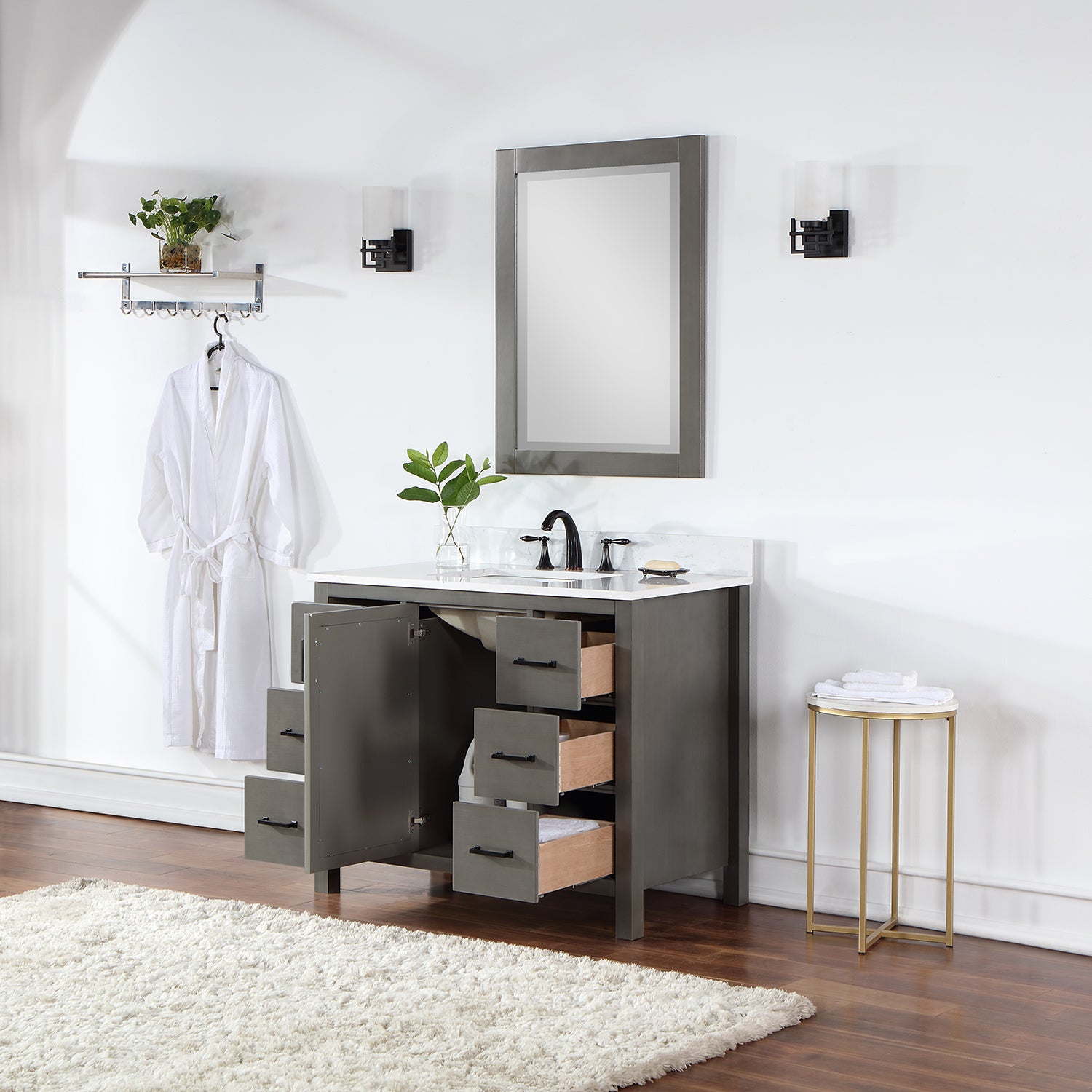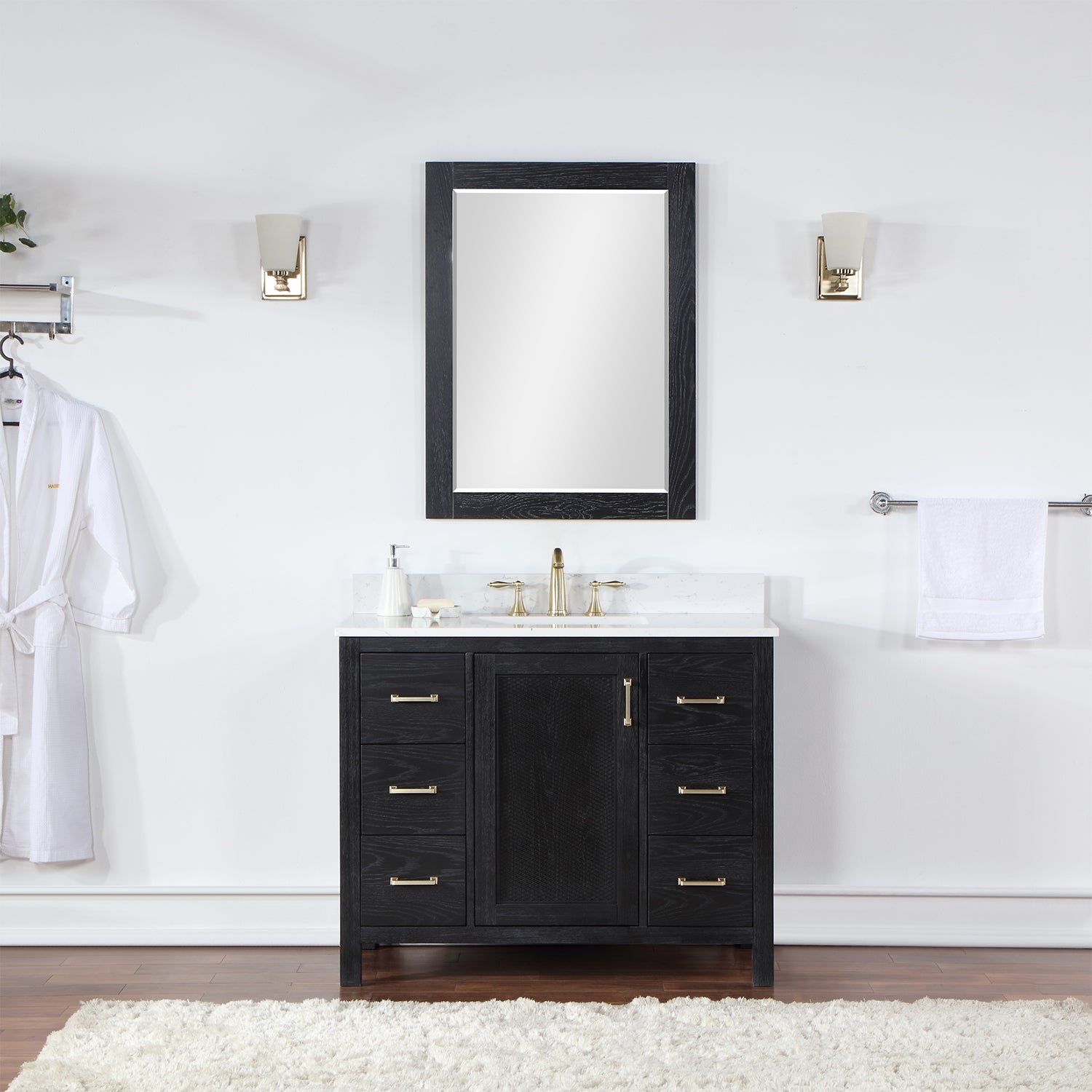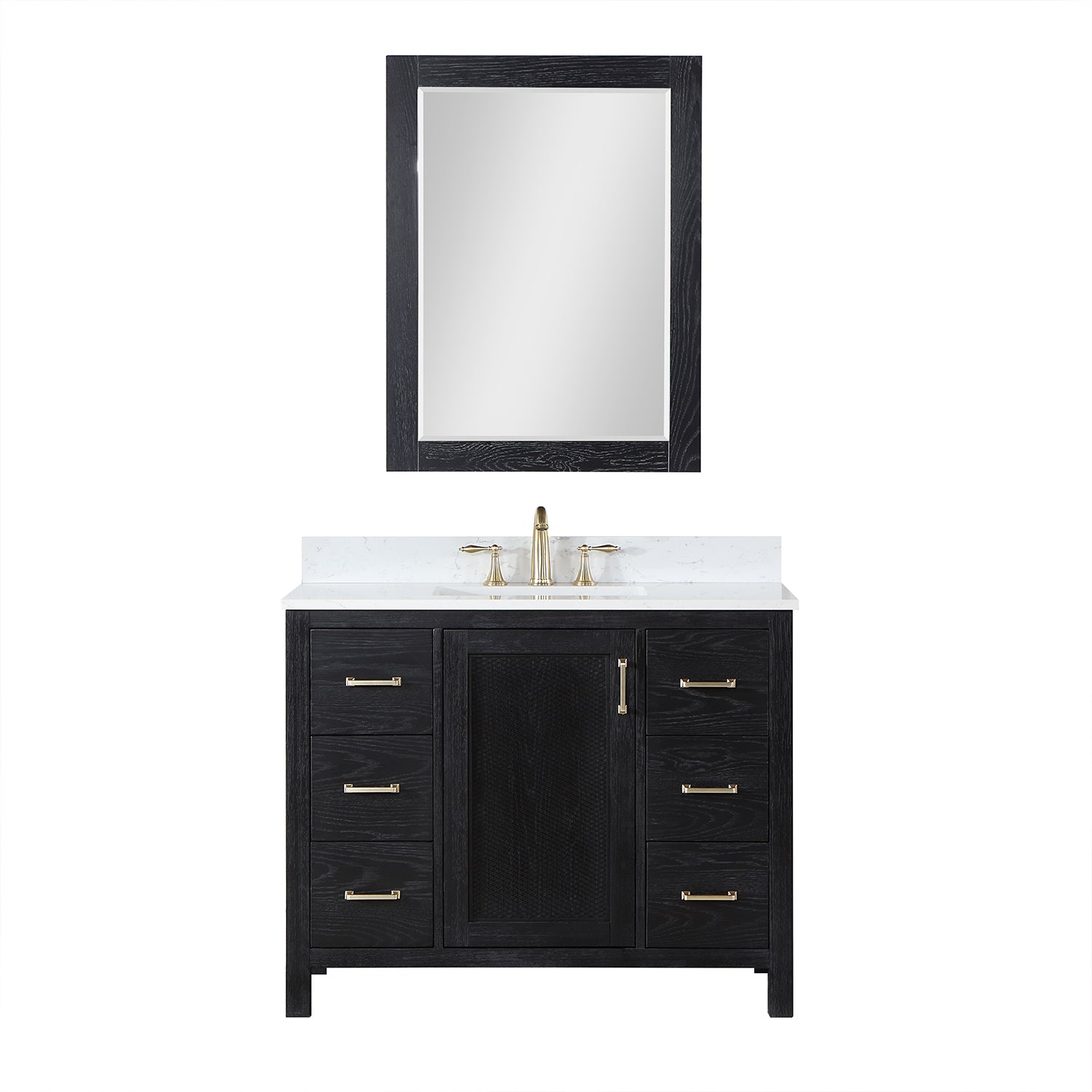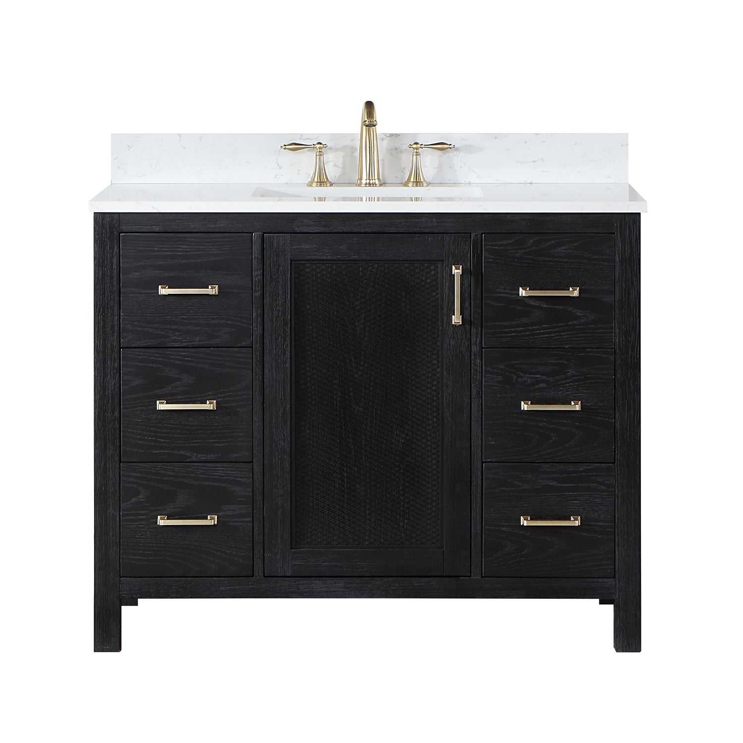 With its compelling blend of wood, metal, and stone, our Hadiya Vanity has an industrial style edge. Metal mesh inserts on the cabinet doors lend a dash of bold texture, concealing spacious storage for stowing away towels, cleaning supplies, and toiletries. Soft-closing drawers provide additional storage flexibility to help keep your space tidy. This sturdy and well-constructed vanity is capped with a beautiful, easy-to-clean composite-stone countertop that provides a stunning parallel with the natural wood grain.