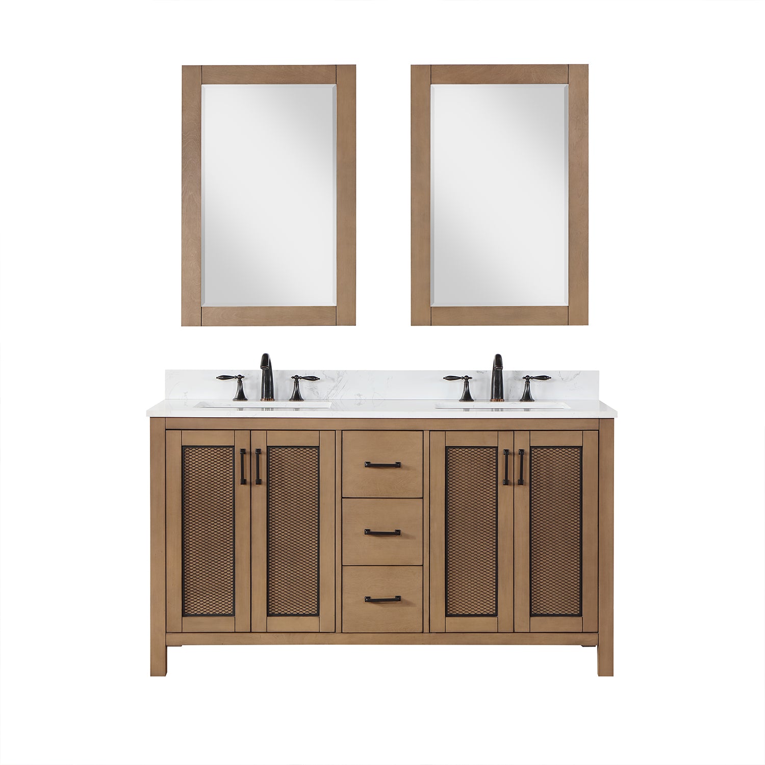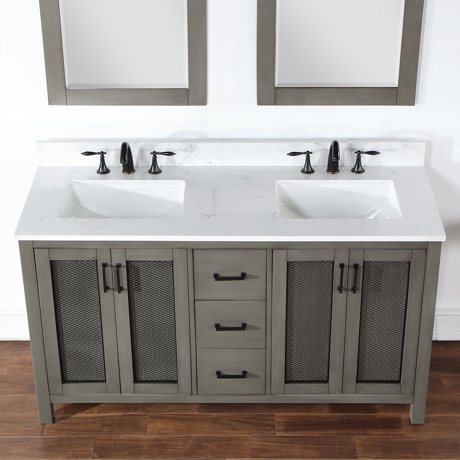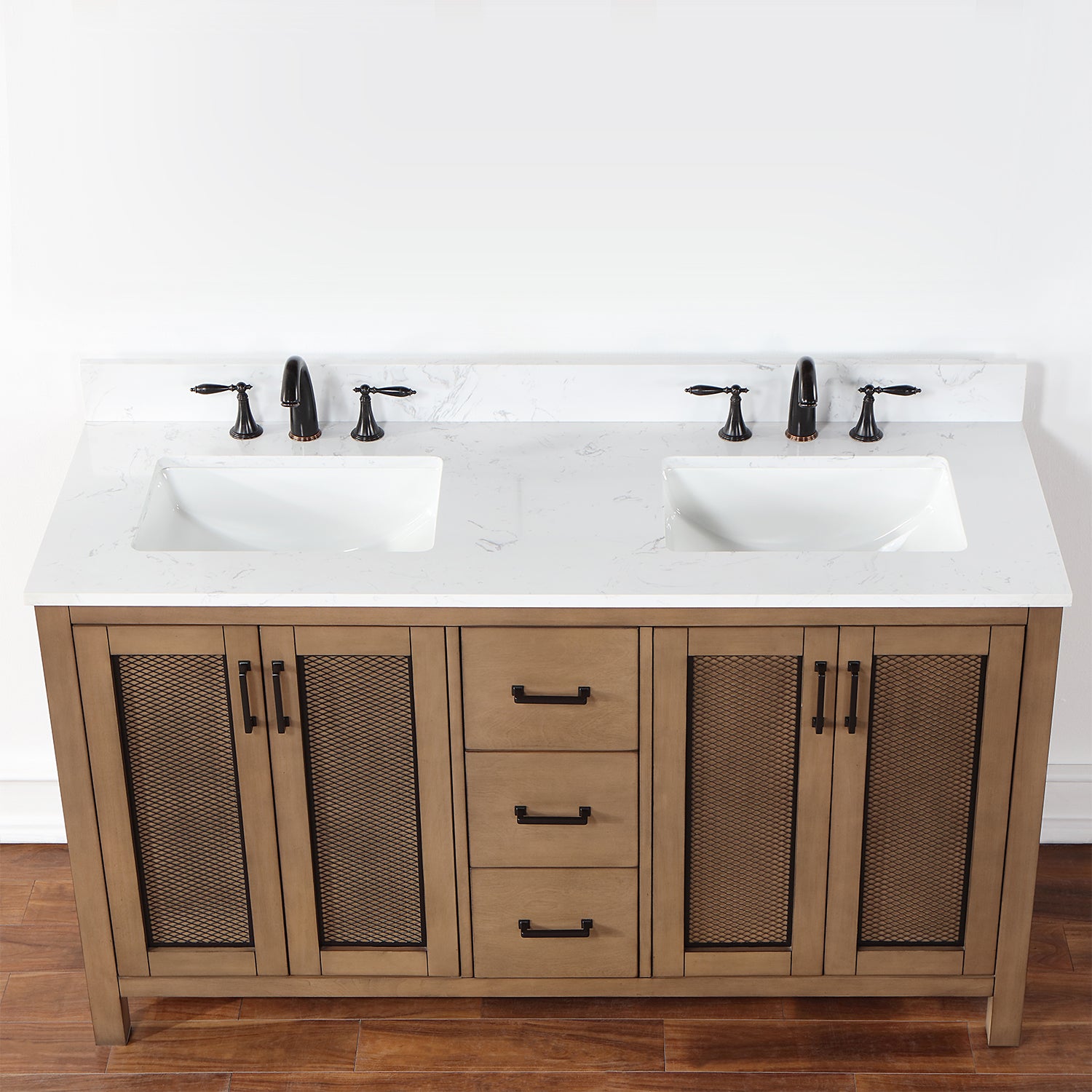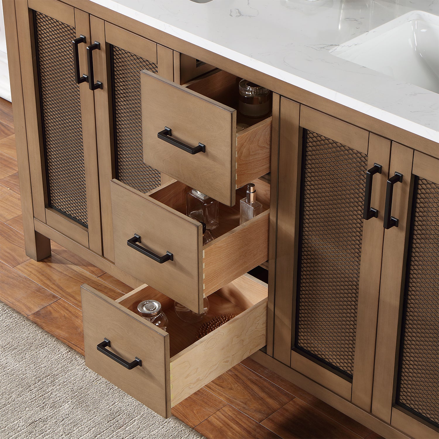 With its compelling blend of wood, metal, and stone, our Hadiya Vanity has an industrial style edge. Metal mesh inserts on the cabinet doors lend a dash of bold texture, concealing spacious storage for stowing away towels, cleaning supplies, and toiletries. Soft-closing drawers provide additional storage flexibility to help keep your space tidy. This sturdy and well-constructed vanity is capped with a beautiful, easy-to-clean composite-stone countertop that provides a stunning parallel with the natural wood grain.
