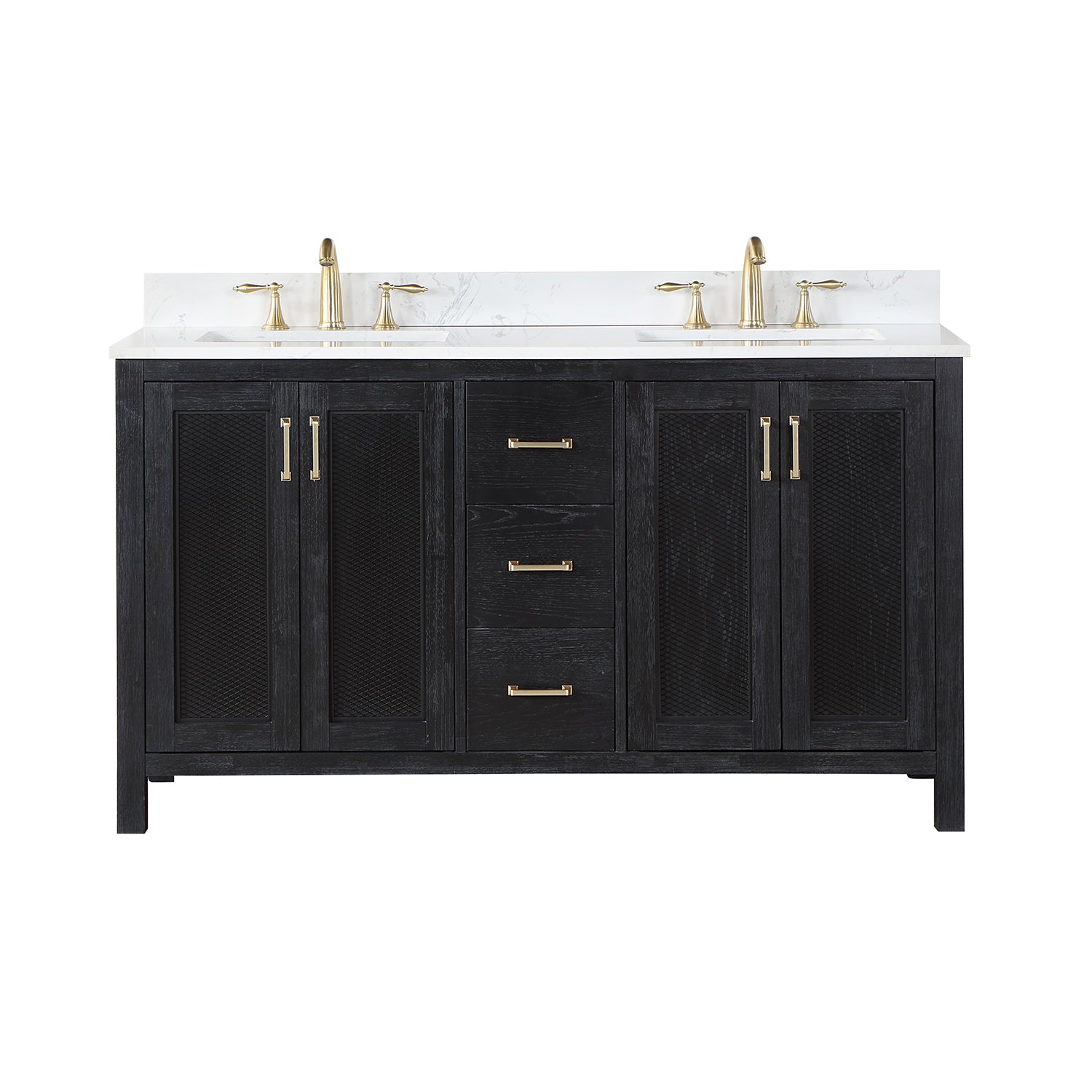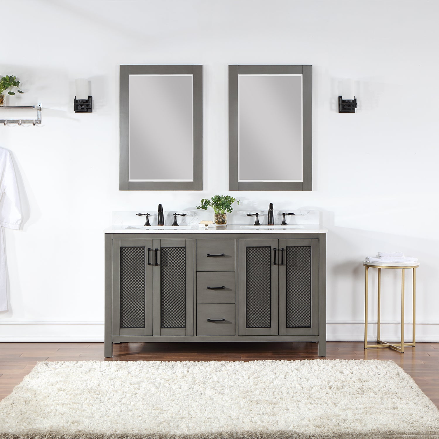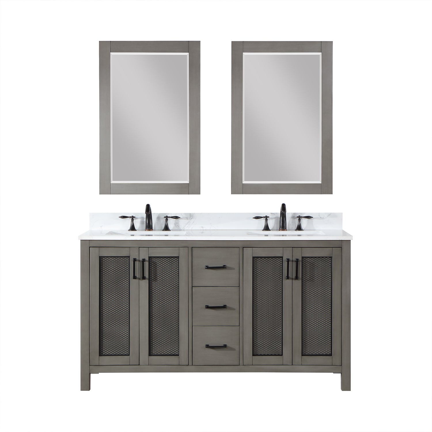 With its compelling blend of wood, metal, and stone, our Hadiya Vanity has an industrial style edge. Metal mesh inserts on the cabinet doors lend a dash of bold texture, concealing spacious storage for stowing away towels, cleaning supplies, and toiletries. Soft-closing drawers provide additional storage flexibility to help keep your space tidy. This sturdy and well-constructed vanity is capped with a beautiful, easy-to-clean composite-stone countertop that provides a stunning parallel with the natural wood grain.
