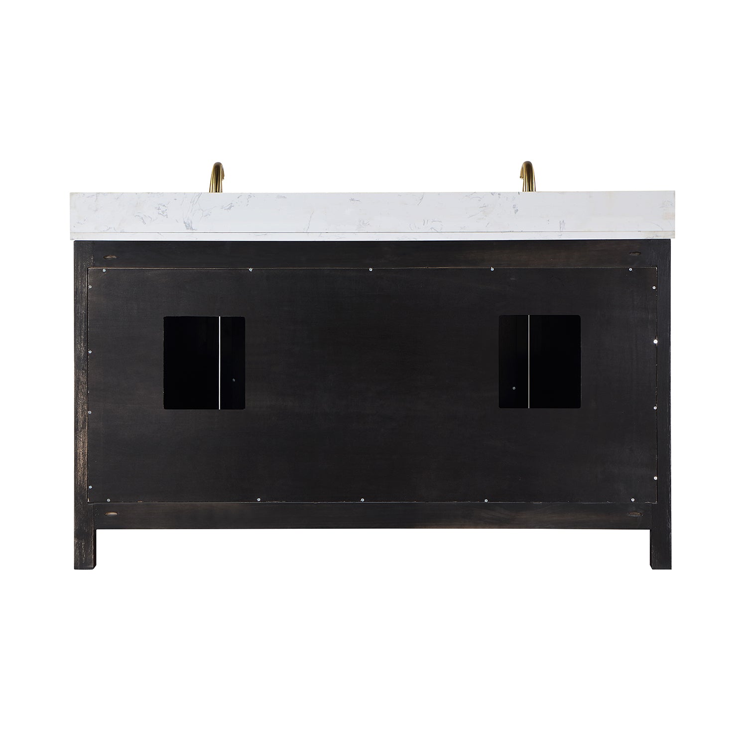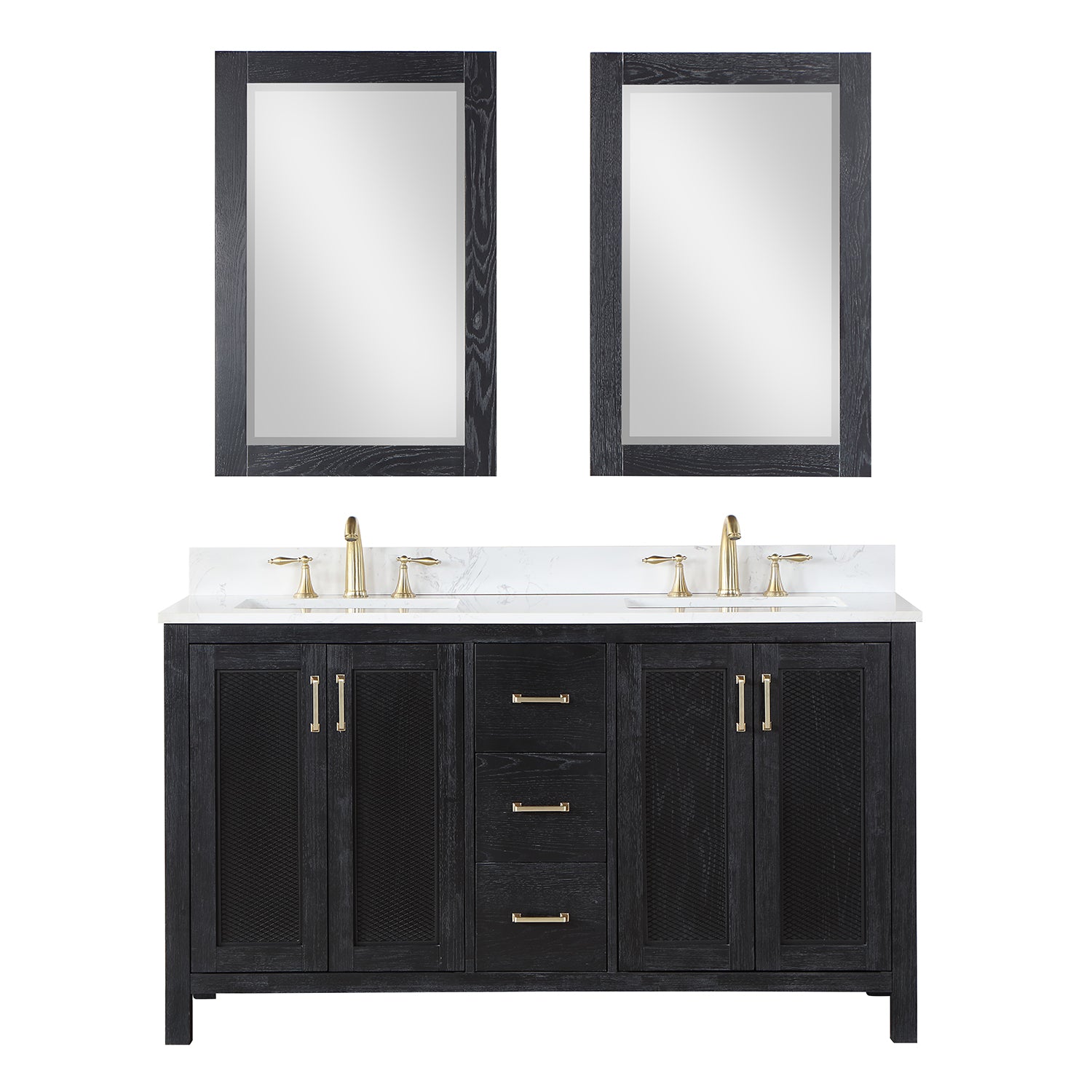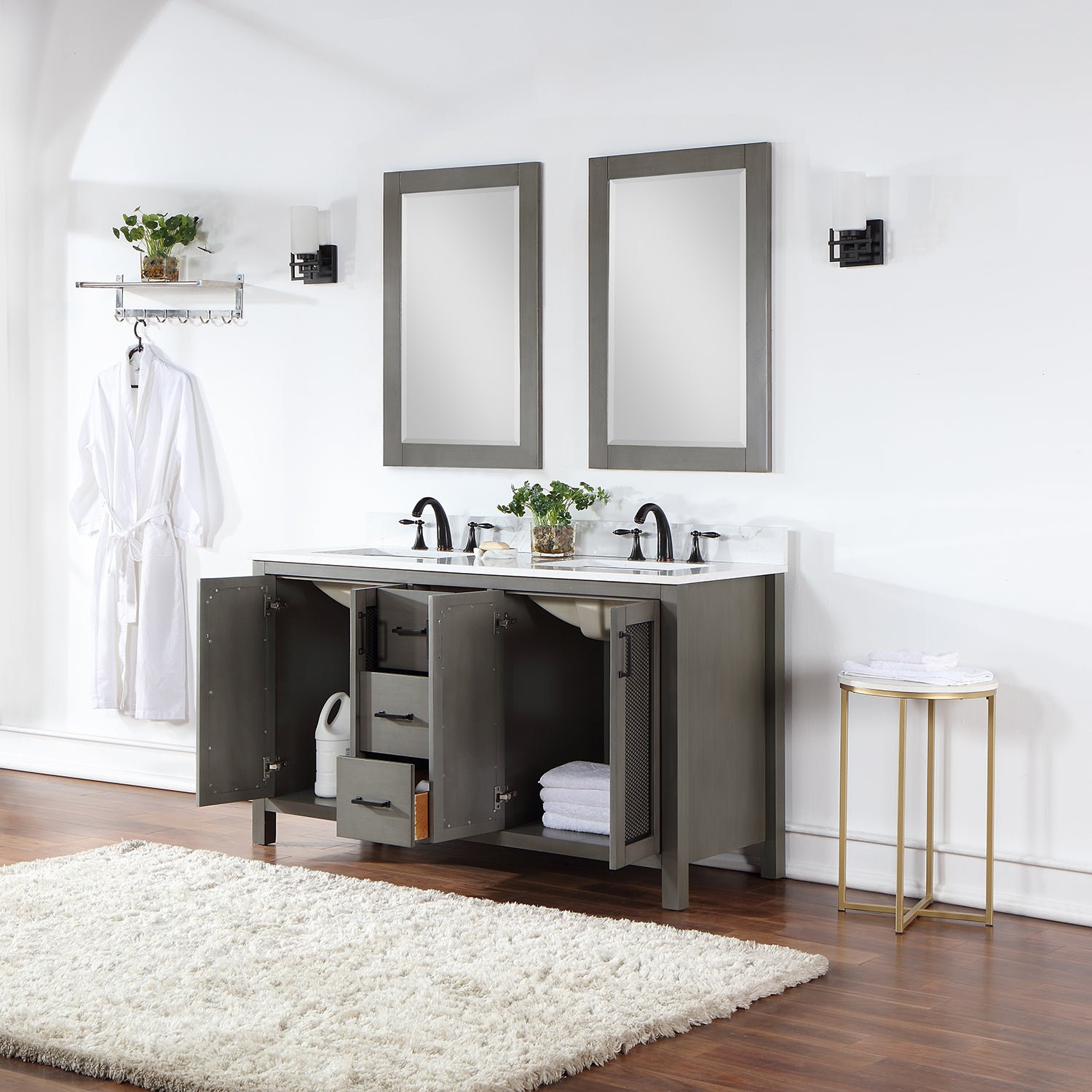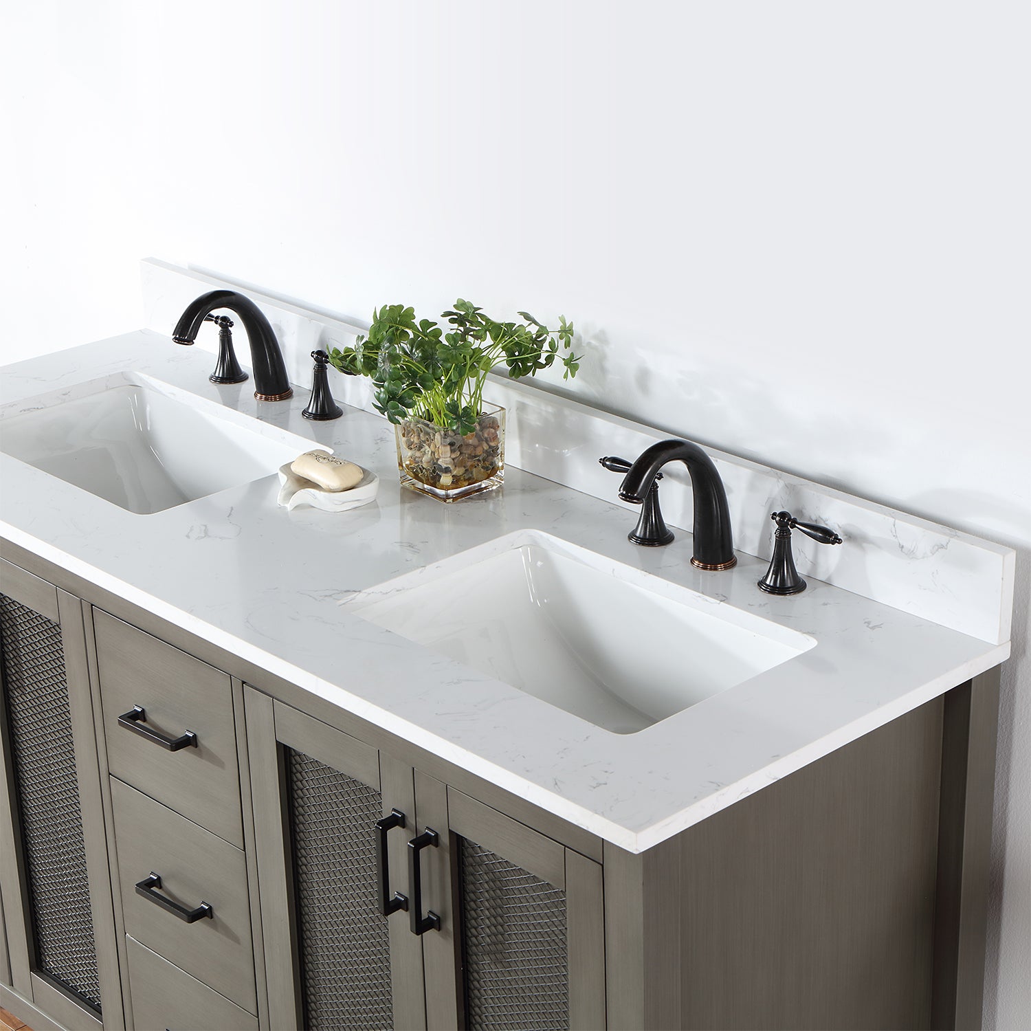 With its compelling blend of wood, metal, and stone, our Hadiya Vanity has an industrial style edge. Metal mesh inserts on the cabinet doors lend a dash of bold texture, concealing spacious storage for stowing away towels, cleaning supplies, and toiletries. Soft-closing drawers provide additional storage flexibility to help keep your space tidy. This sturdy and well-constructed vanity is capped with a beautiful, easy-to-clean composite-stone countertop that provides a stunning parallel with the natural wood grain.
