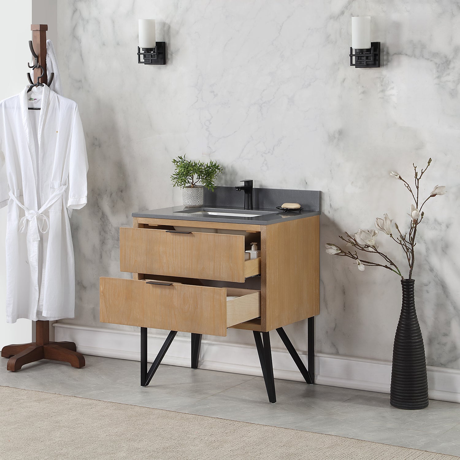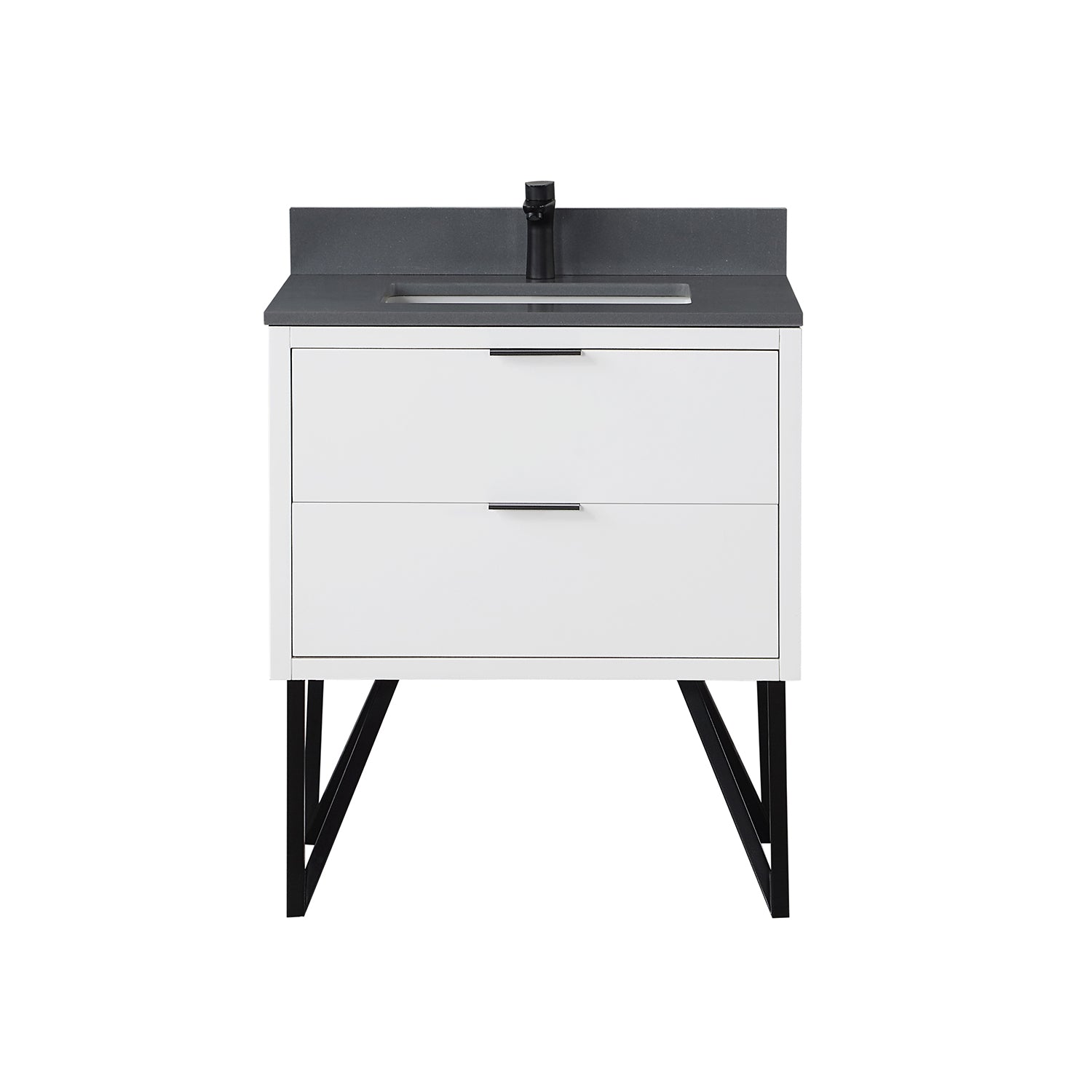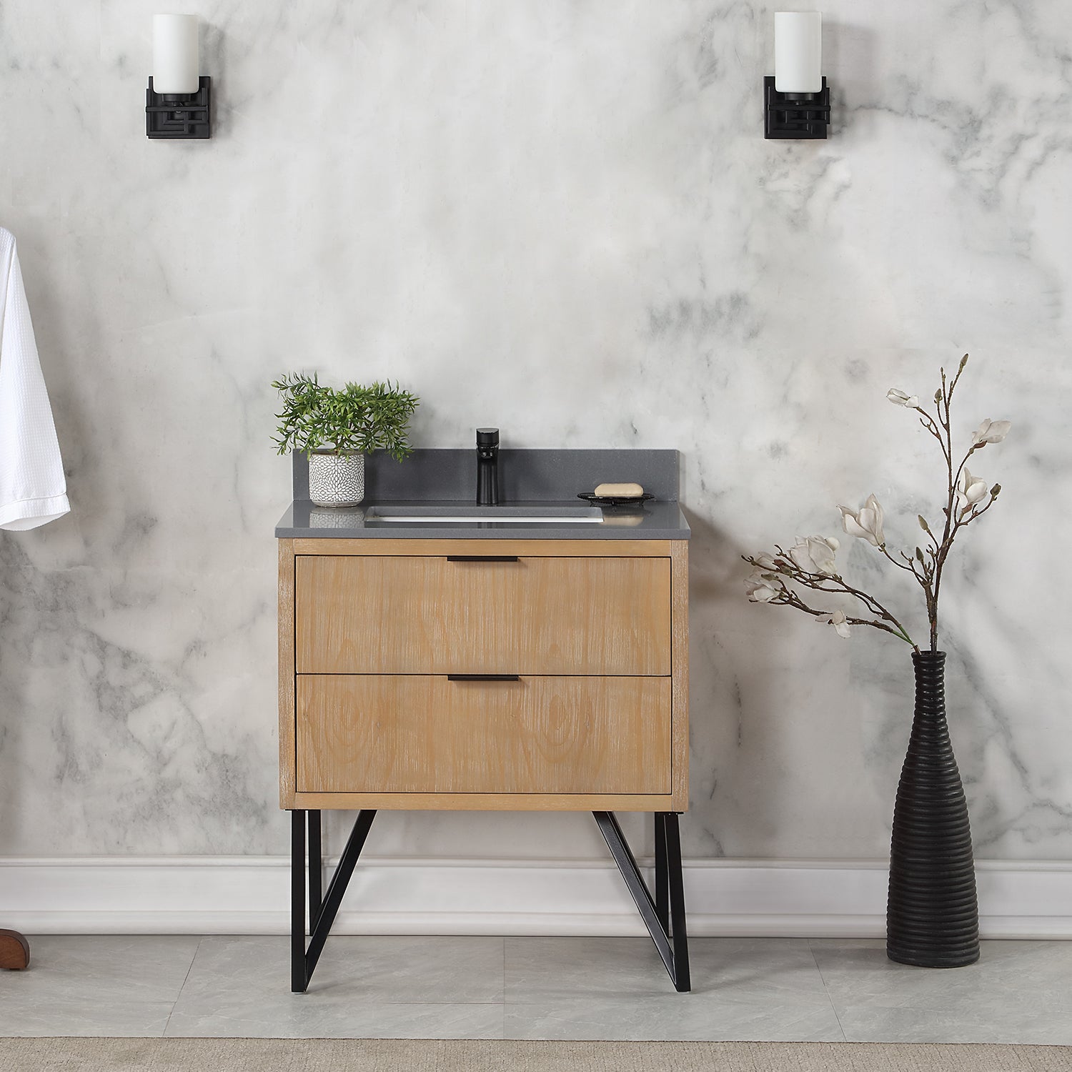 With its fabricated metal legs, our striking Helios vanity collection recalls the timelessness of mid-century design while evoking an edgy industrial feel. This piece embodies a stunning blend of textures and colors, featuring a concrete-look countertop paired with a painted or wood-grain cabinet. Two soft-closing drawers with invisible handles offer spacious storage for toiletries and more. Built with supreme attention to detail, Helios is a stylish, eye-catching accent to any guest or master bath.