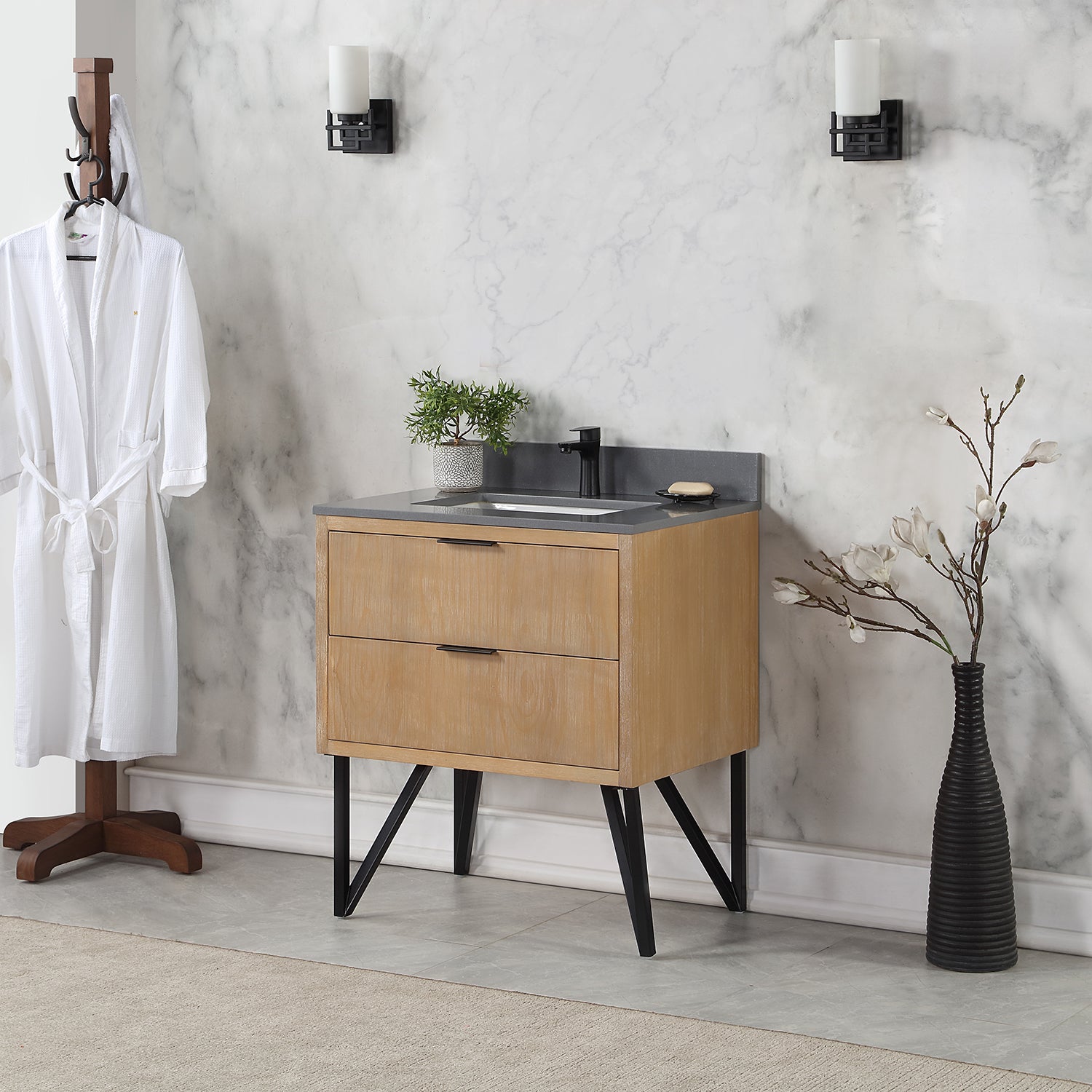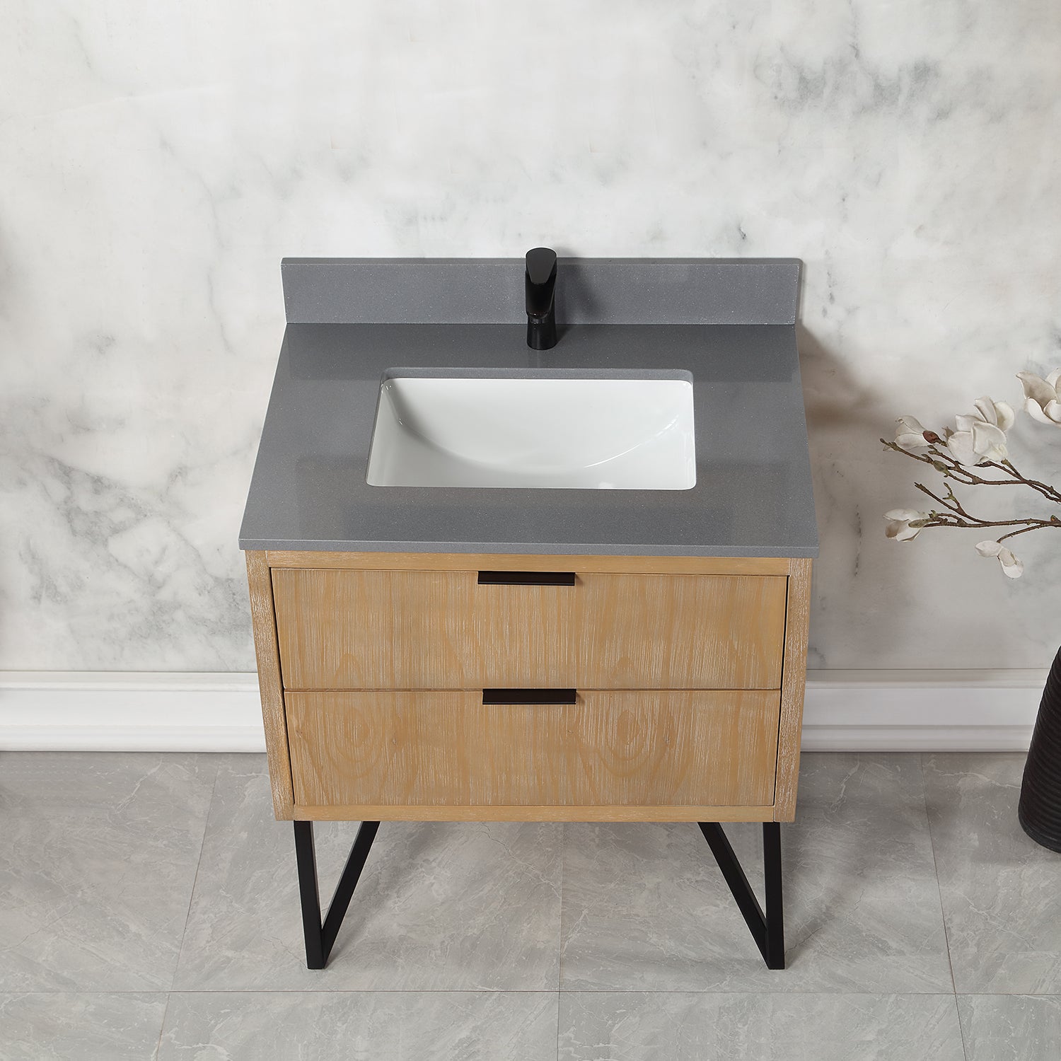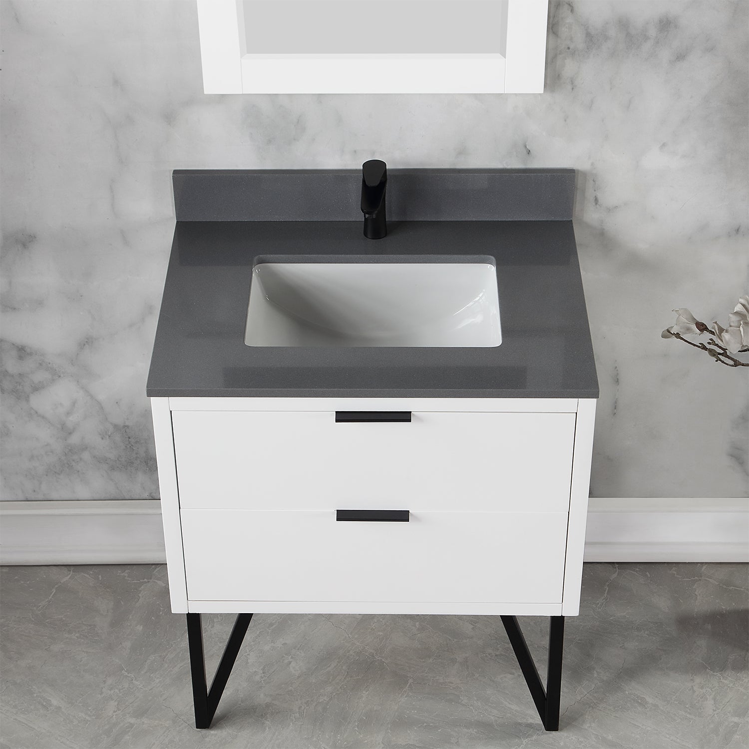With its fabricated metal legs, our striking Helios vanity collection recalls the timelessness of mid-century design while evoking an edgy industrial feel. This piece embodies a stunning blend of textures and colors, featuring a concrete-look countertop paired with a painted or wood-grain cabinet. Two soft-closing drawers with invisible handles offer spacious storage for toiletries and more. Built with supreme attention to detail, Helios is a stylish, eye-catching accent to any guest or master bath.
