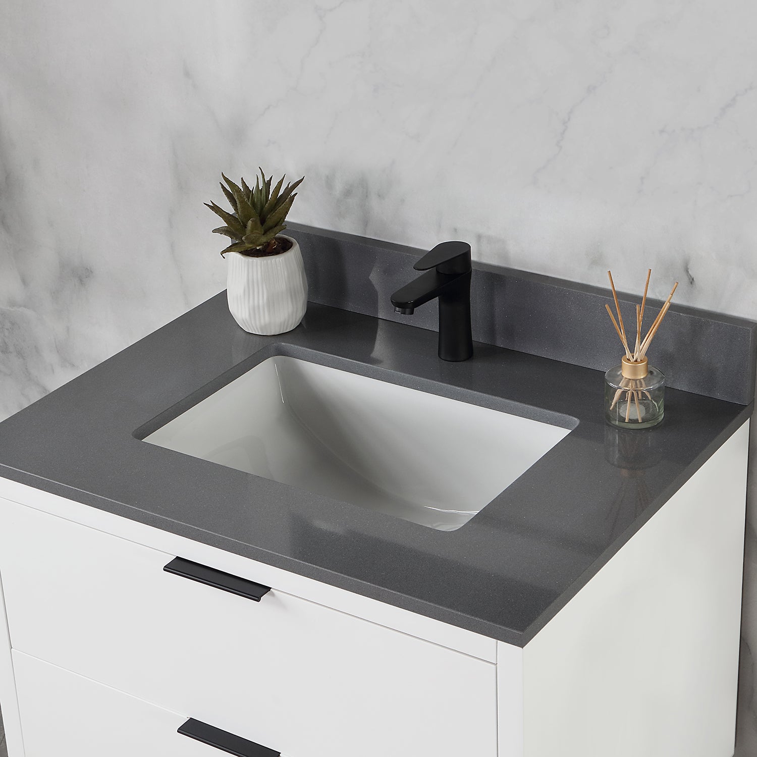 Countertop: Elegant composite Concrete Grey stone countertop with backsplash adds a touch of refinement.