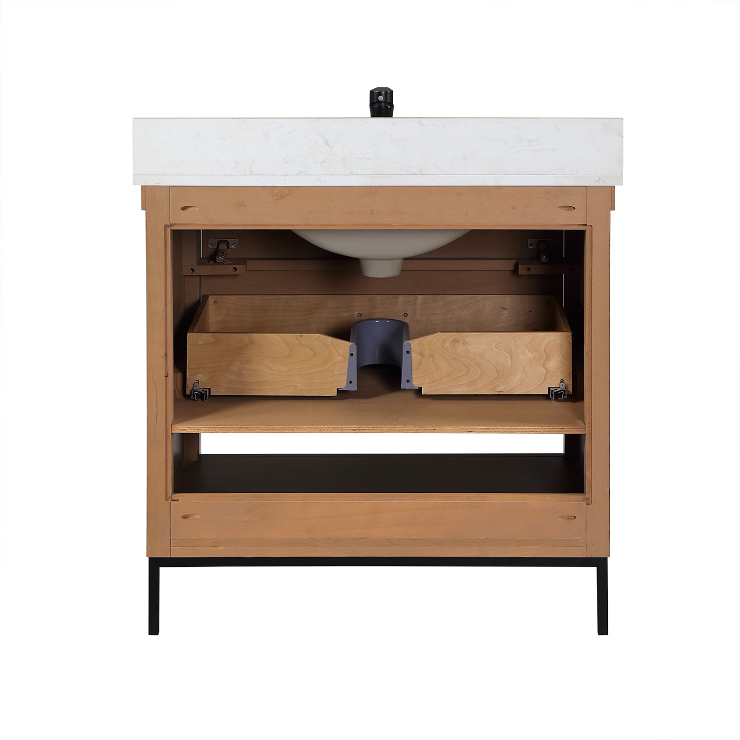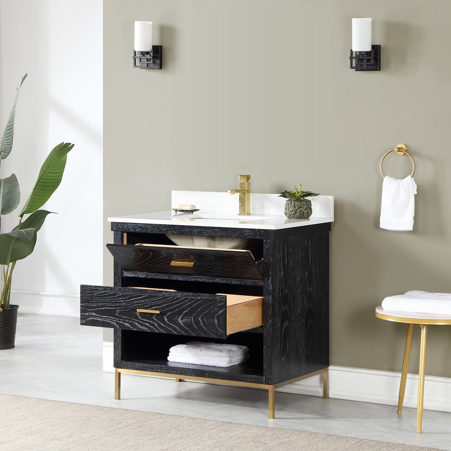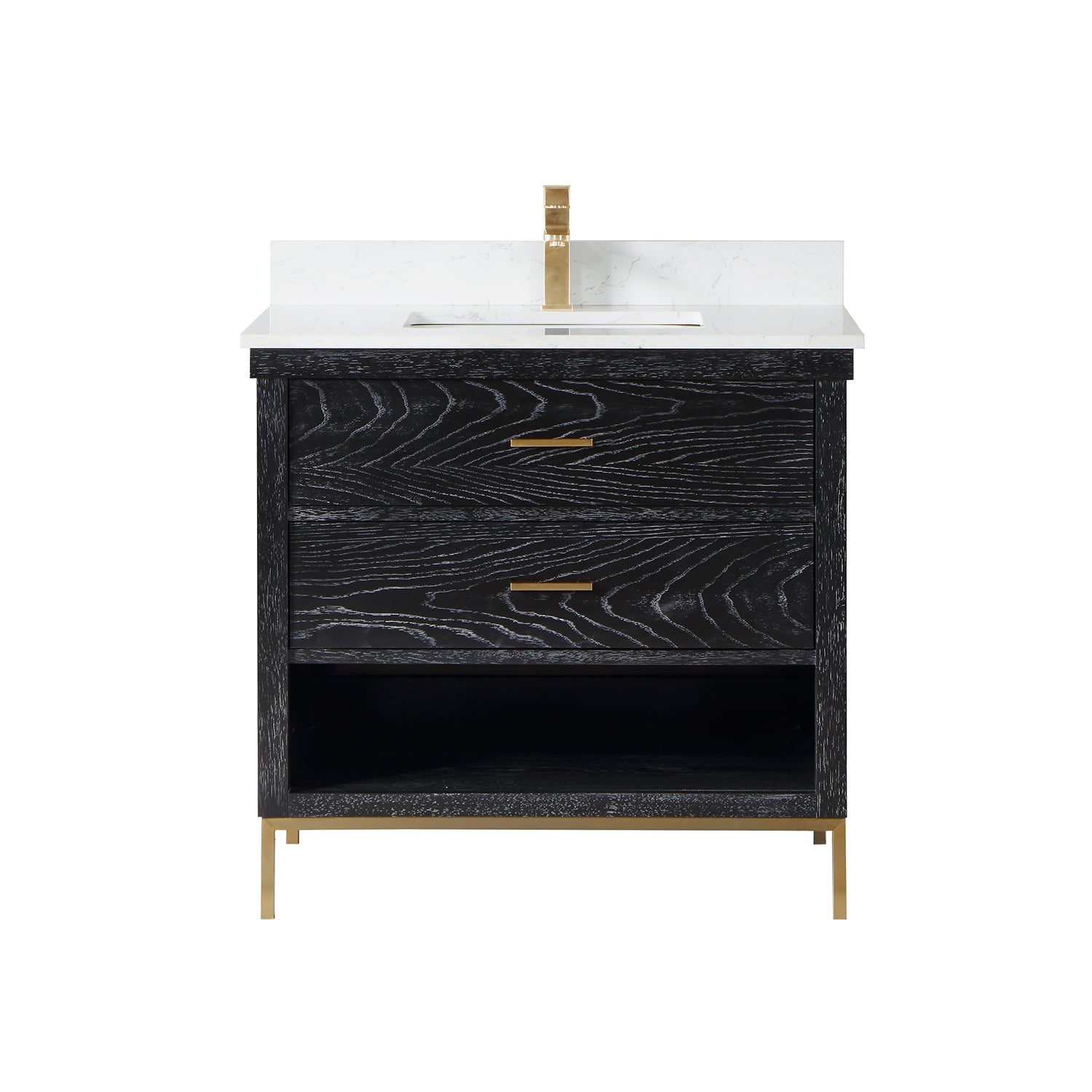 With its clean structural lines and austere design, our Kesia Vanity brings a minimalist aesthetic to your guest or master bath. Its iron frame, available in black or gold, adds a hint of industrial design, drawing a heavy contrast with the cabinet's natural wood finish. This piece features a flexible blend of closed and open storage, allowing you to conceal smaller accoutrements while putting others on display. A Engineered Stone Countertop in marbled Carrara White pulls it all together with a sophisticated finish.