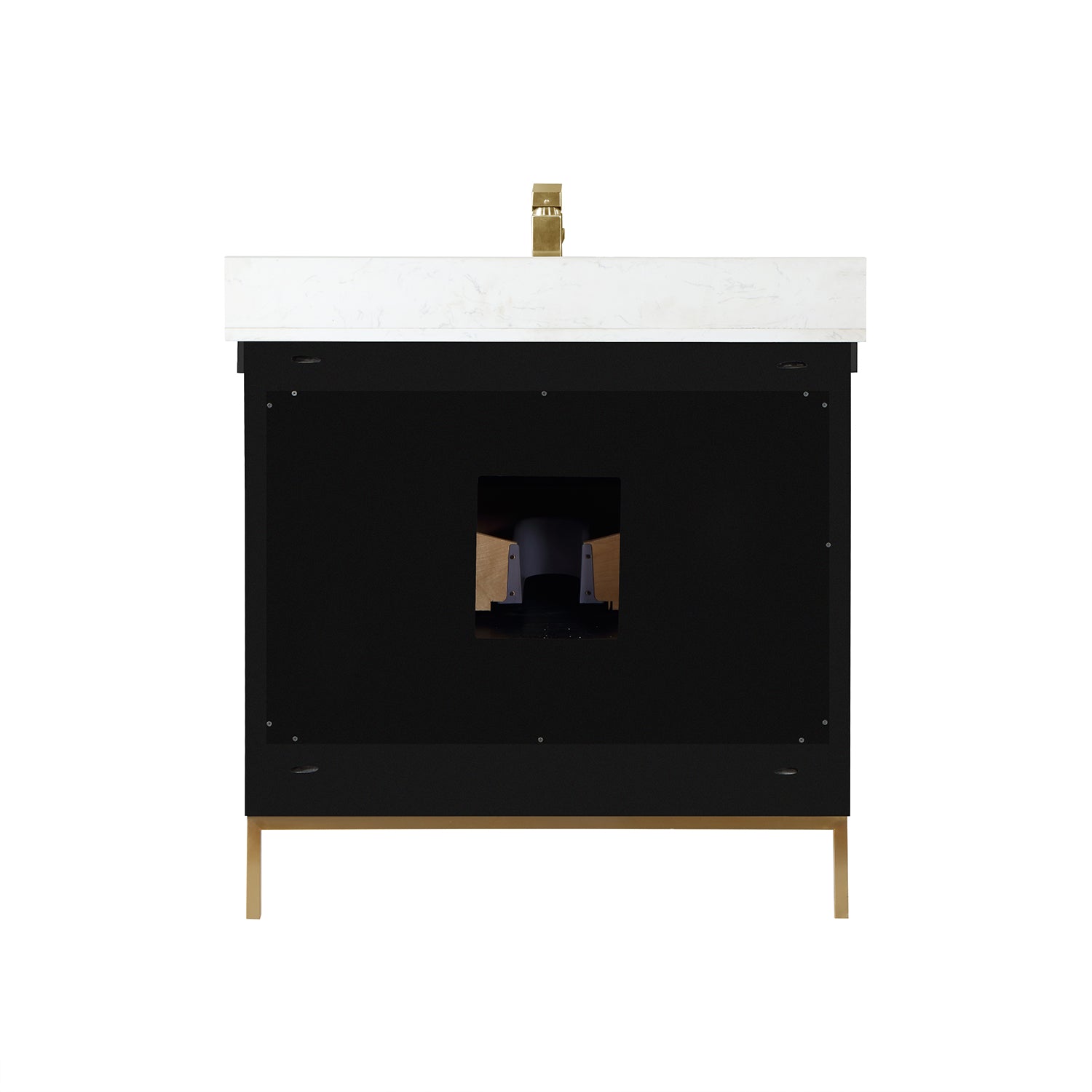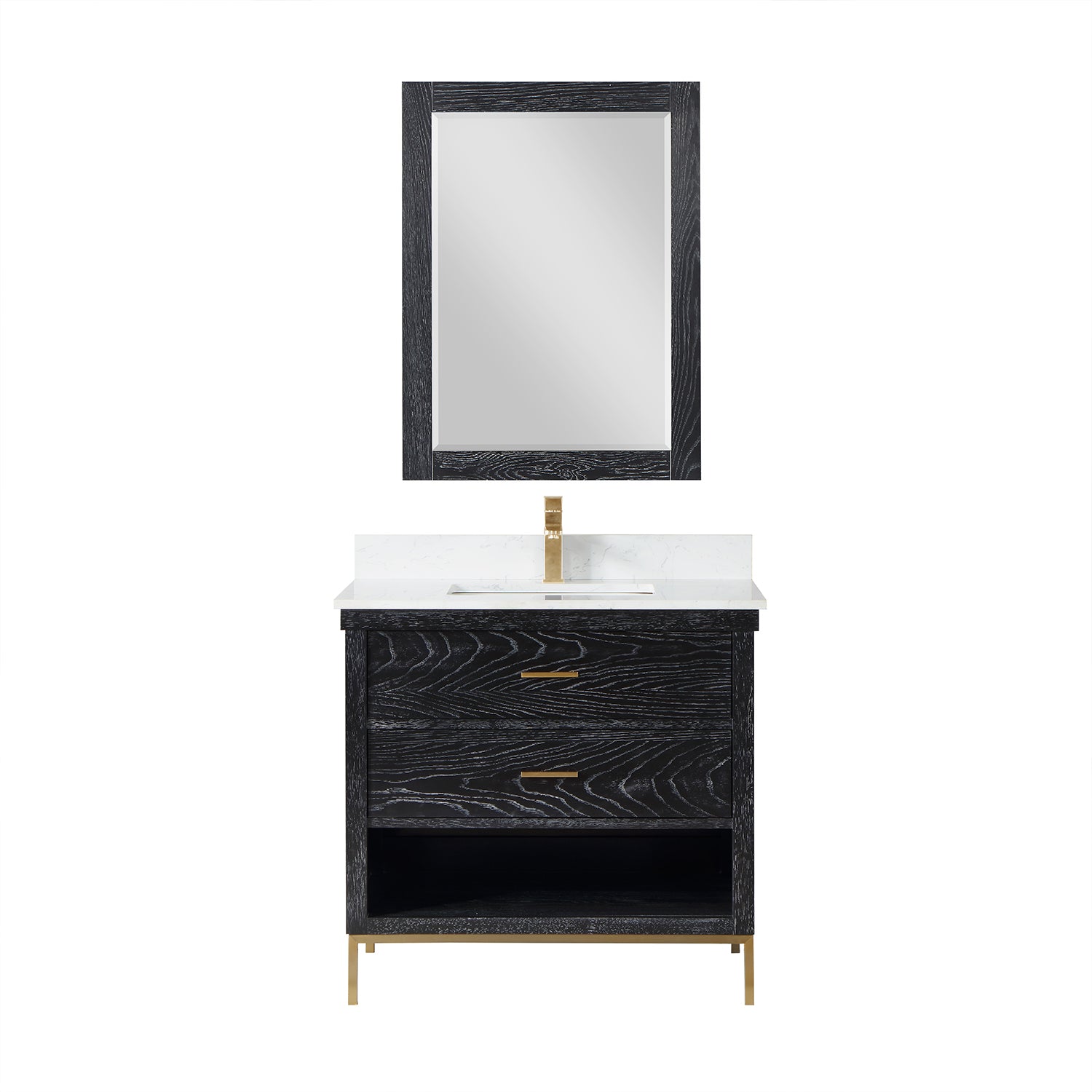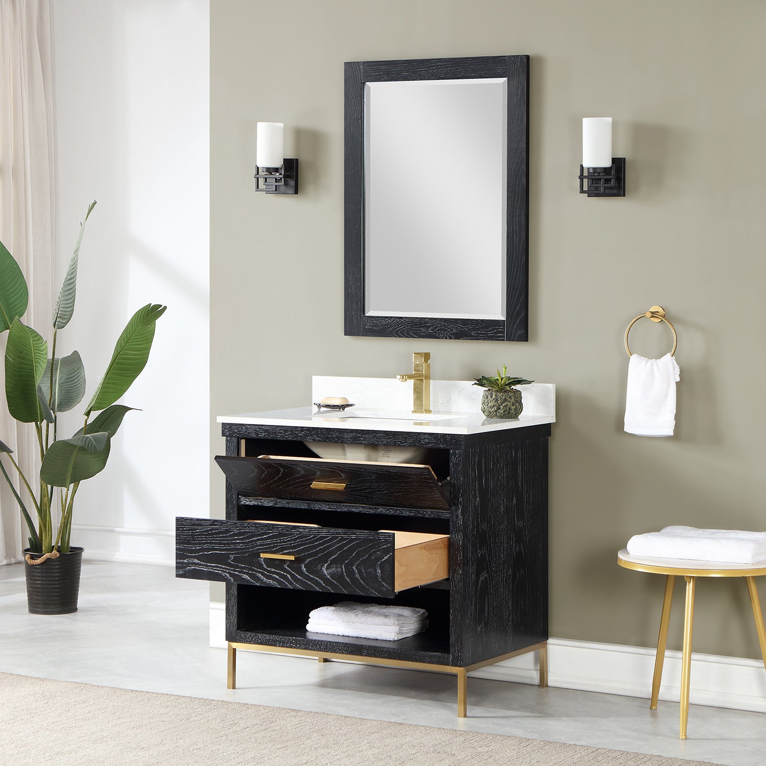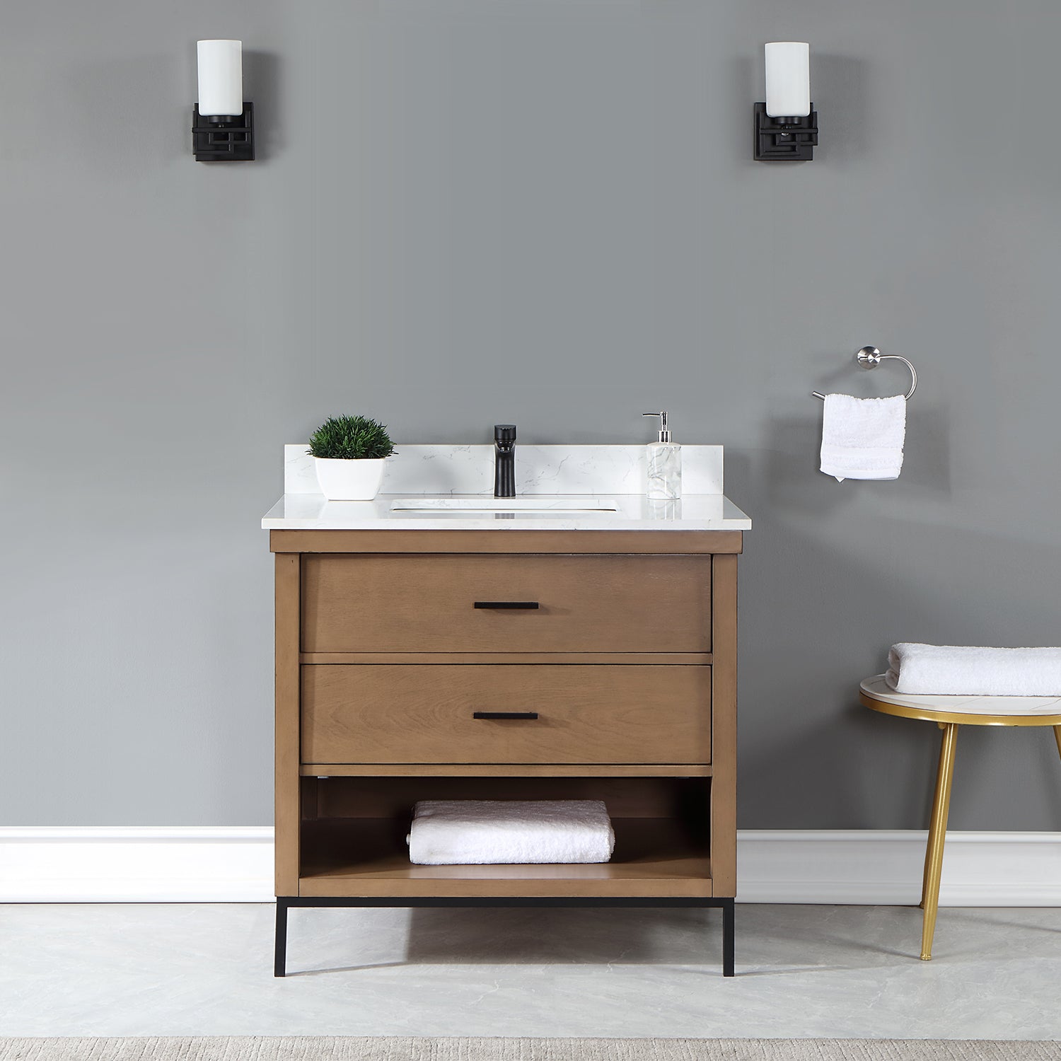 With its clean structural lines and austere design, our Kesia Vanity brings a minimalist aesthetic to your guest or master bath. Its iron frame, available in black or gold, adds a hint of industrial design, drawing a heavy contrast with the cabinet's natural wood finish. This piece features a flexible blend of closed and open storage, allowing you to conceal smaller accoutrements while putting others on display. A Engineered Stone Countertop in marbled Carrara White pulls it all together with a sophisticated finish.