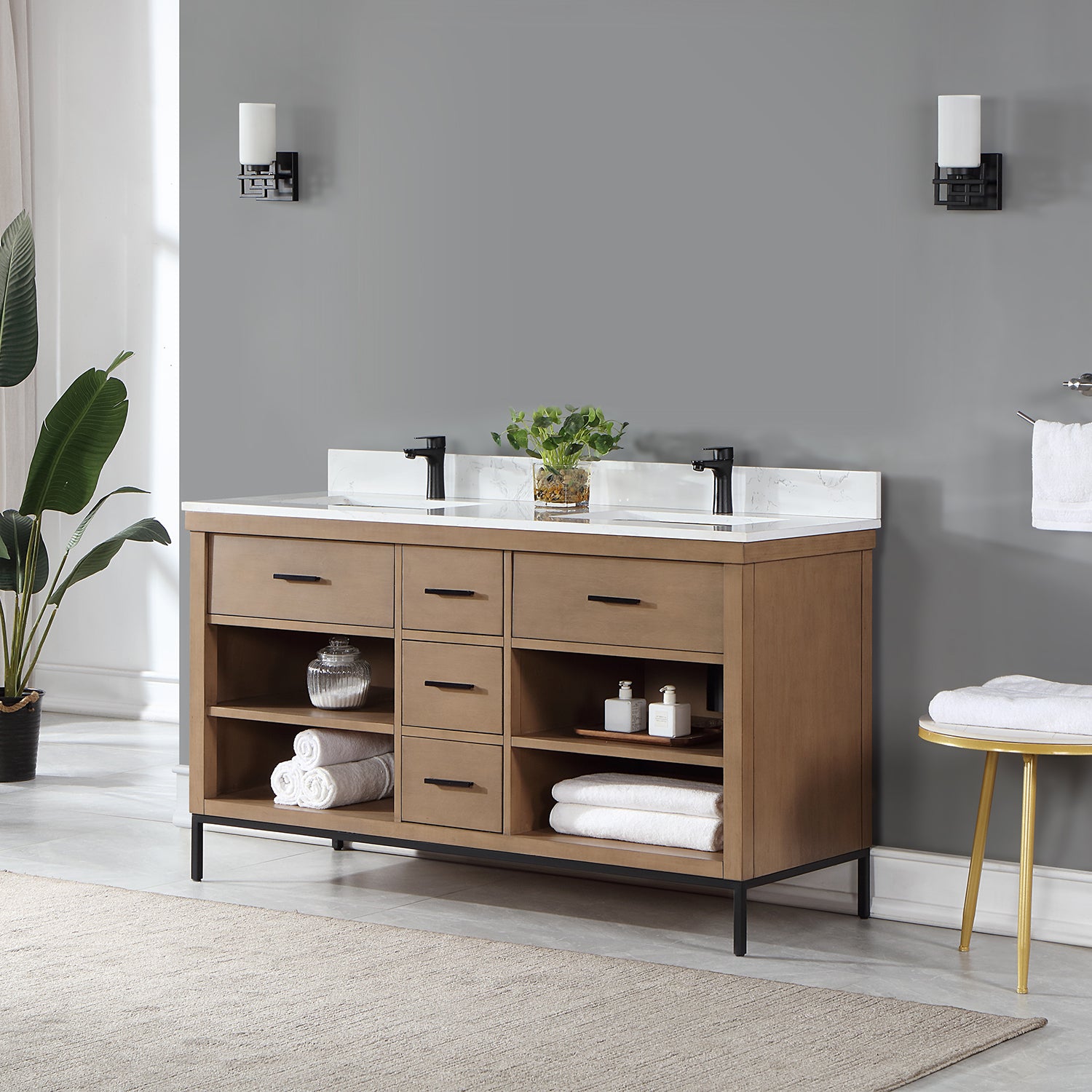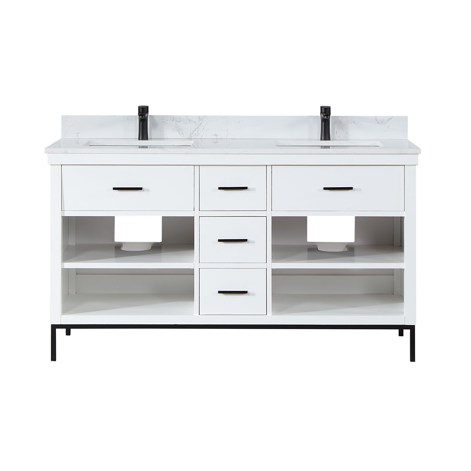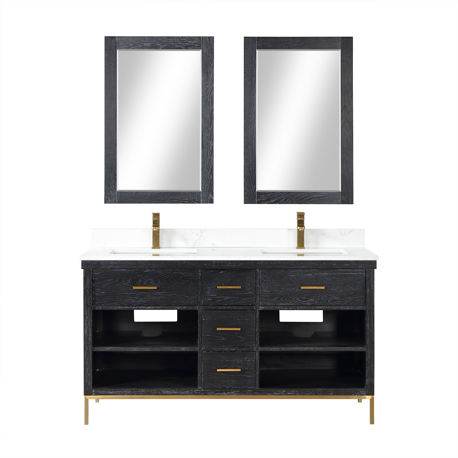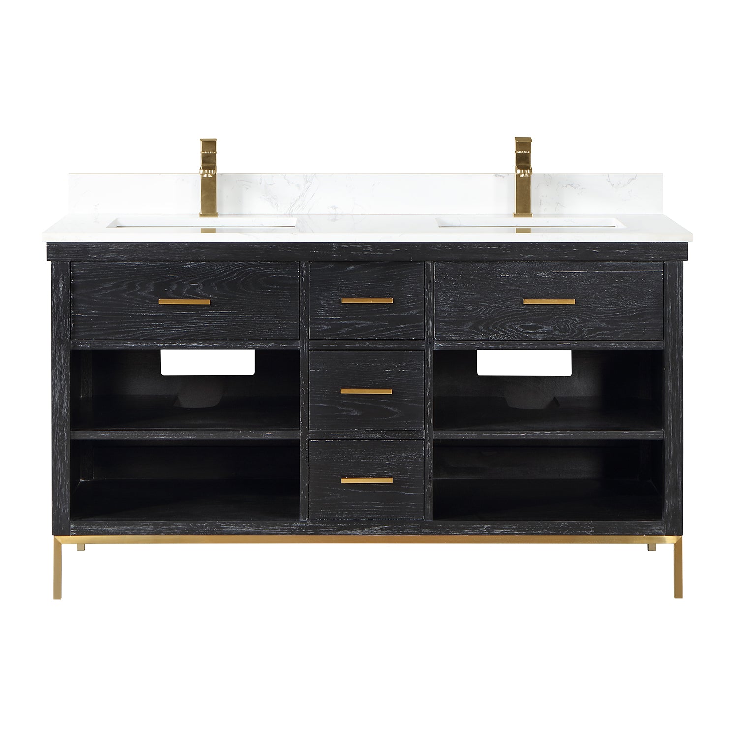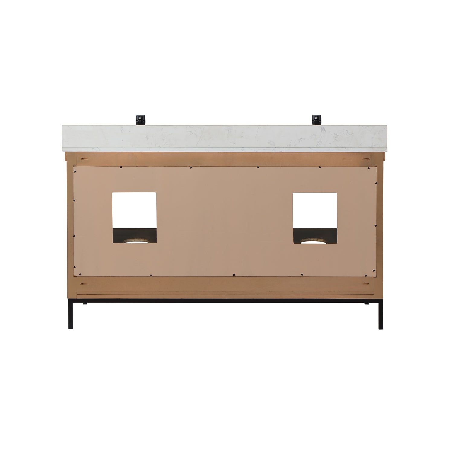 With its clean structural lines and austere design, our Kesia Vanity brings a minimalist aesthetic to your guest or master bath. Its iron frame, available in black or gold, adds a hint of industrial design, drawing a heavy contrast with the cabinet's natural wood finish. This piece features a flexible blend of closed and open storage, allowing you to conceal smaller accoutrements while putting others on display. A Engineered Stone Countertop in marbled Carrara White pulls it all together with a sophisticated finish.