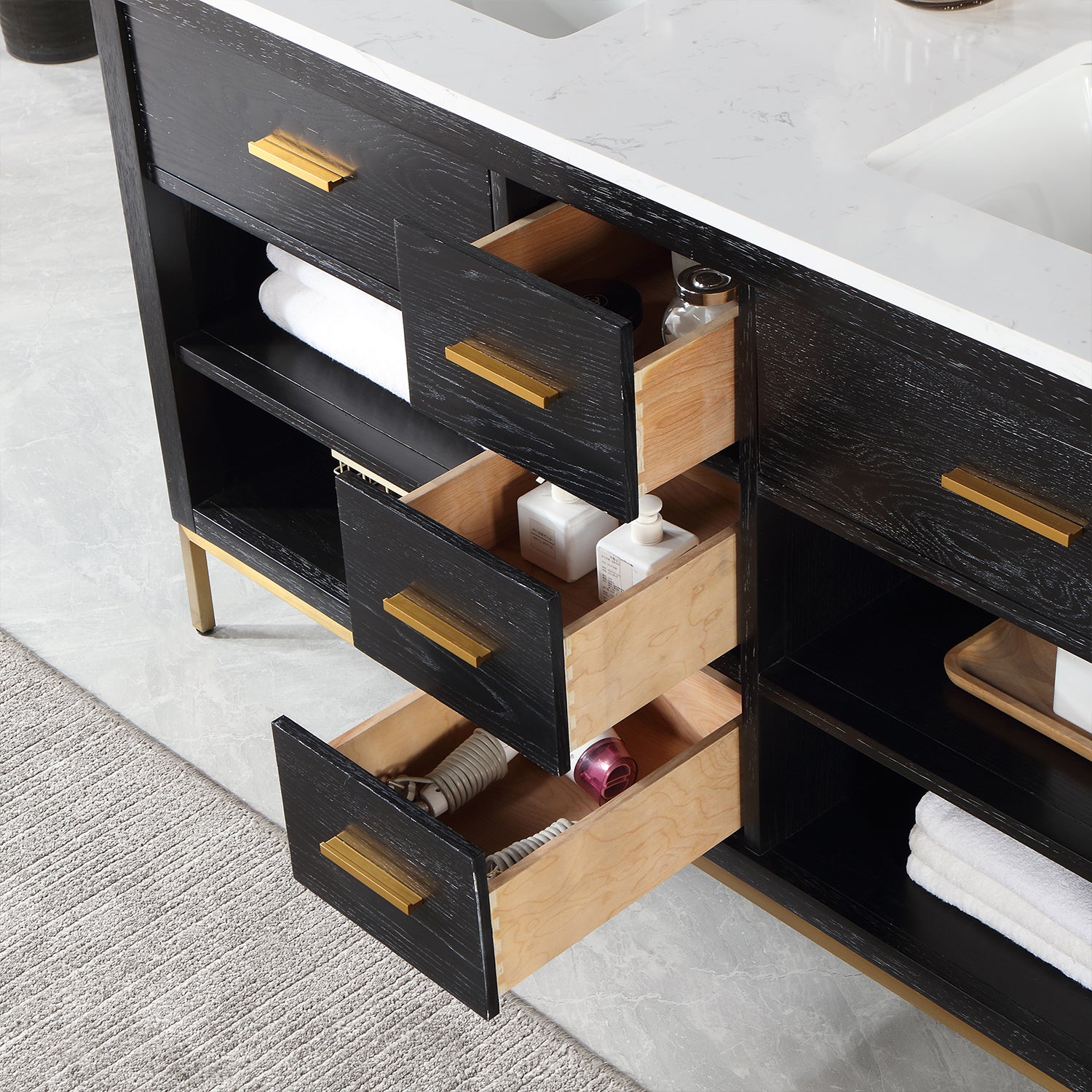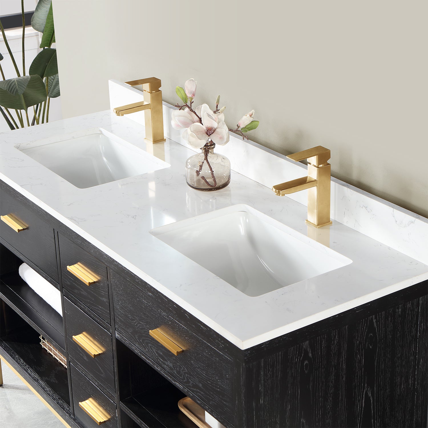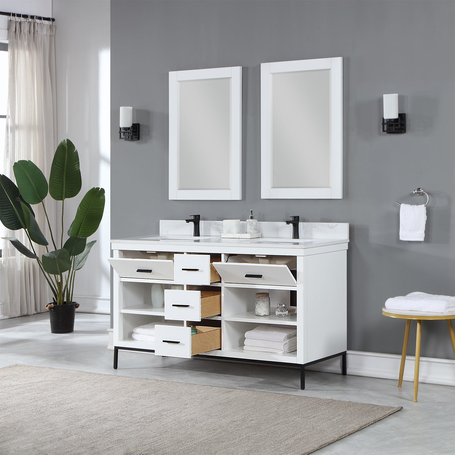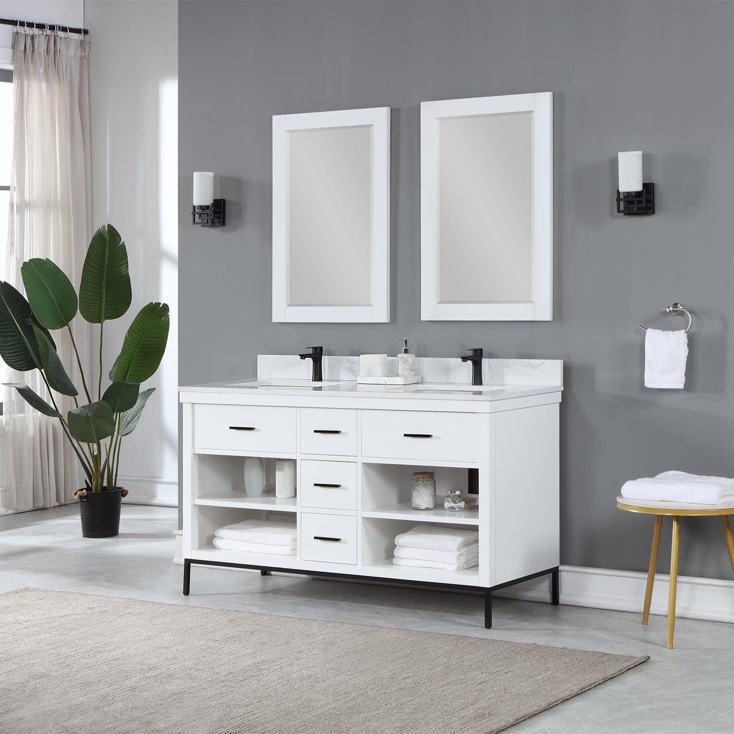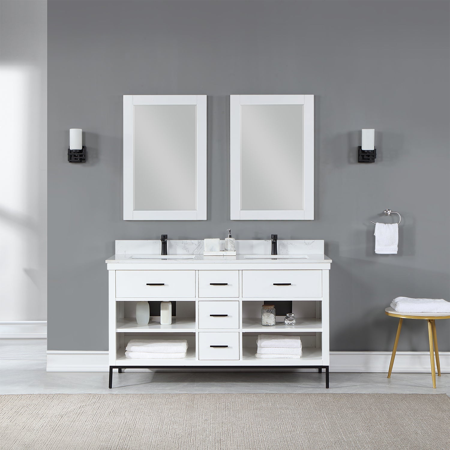 With its clean structural lines and austere design, our Kesia Vanity brings a minimalist aesthetic to your guest or master bath. Its iron frame, available in black or gold, adds a hint of industrial design, drawing a heavy contrast with the cabinet's natural wood finish. This piece features a flexible blend of closed and open storage, allowing you to conceal smaller accoutrements while putting others on display. A Engineered Stone Countertop in marbled Carrara White pulls it all together with a sophisticated finish.