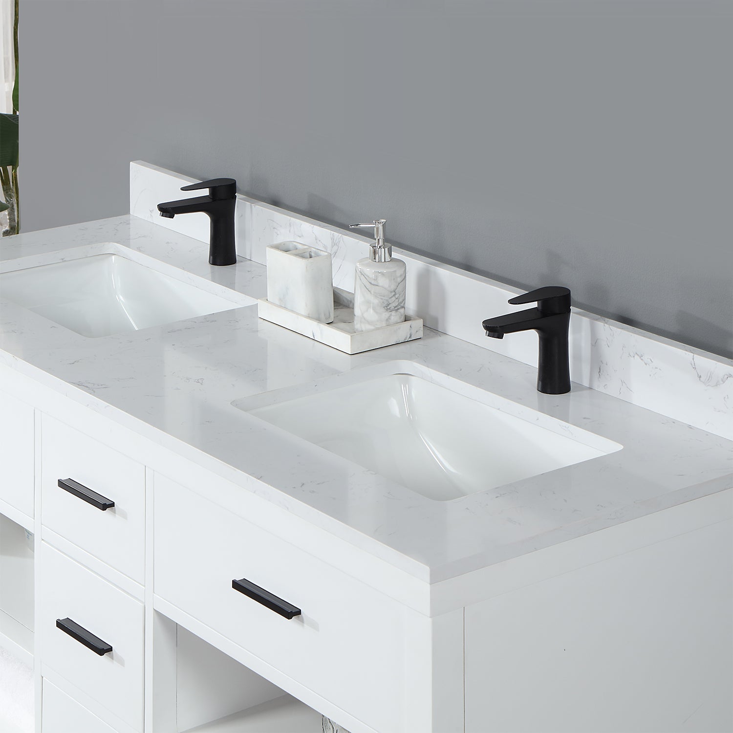 Ceramic Basin: Two rectangular, undermount ceramic basins with overflow included
