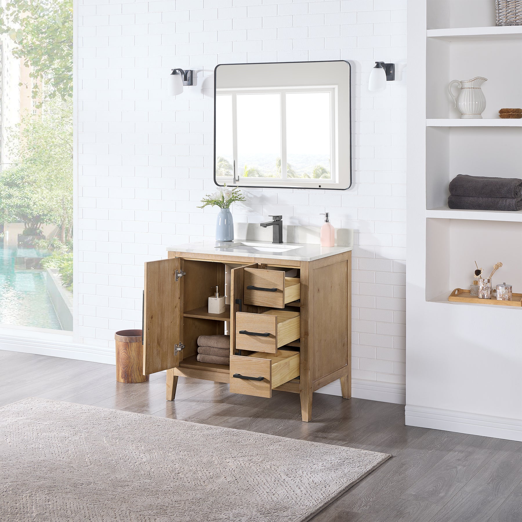 Looking to dial up the style in your guest or master bath? Sleek and streamlined in design, our Laurel vanity is a functional and elegant addition crafted with materials of the finest quality. Its unique blend of textures lends this piece a distinctive contemporary edge that enhances the overall aesthetic of any decor. Despite its minimalist look, our vanity doesn't skimp on storage. A roomy cabinet and drawers help keep your space organized and clutter-free, providing the perfect spot for all your grooming essentials.