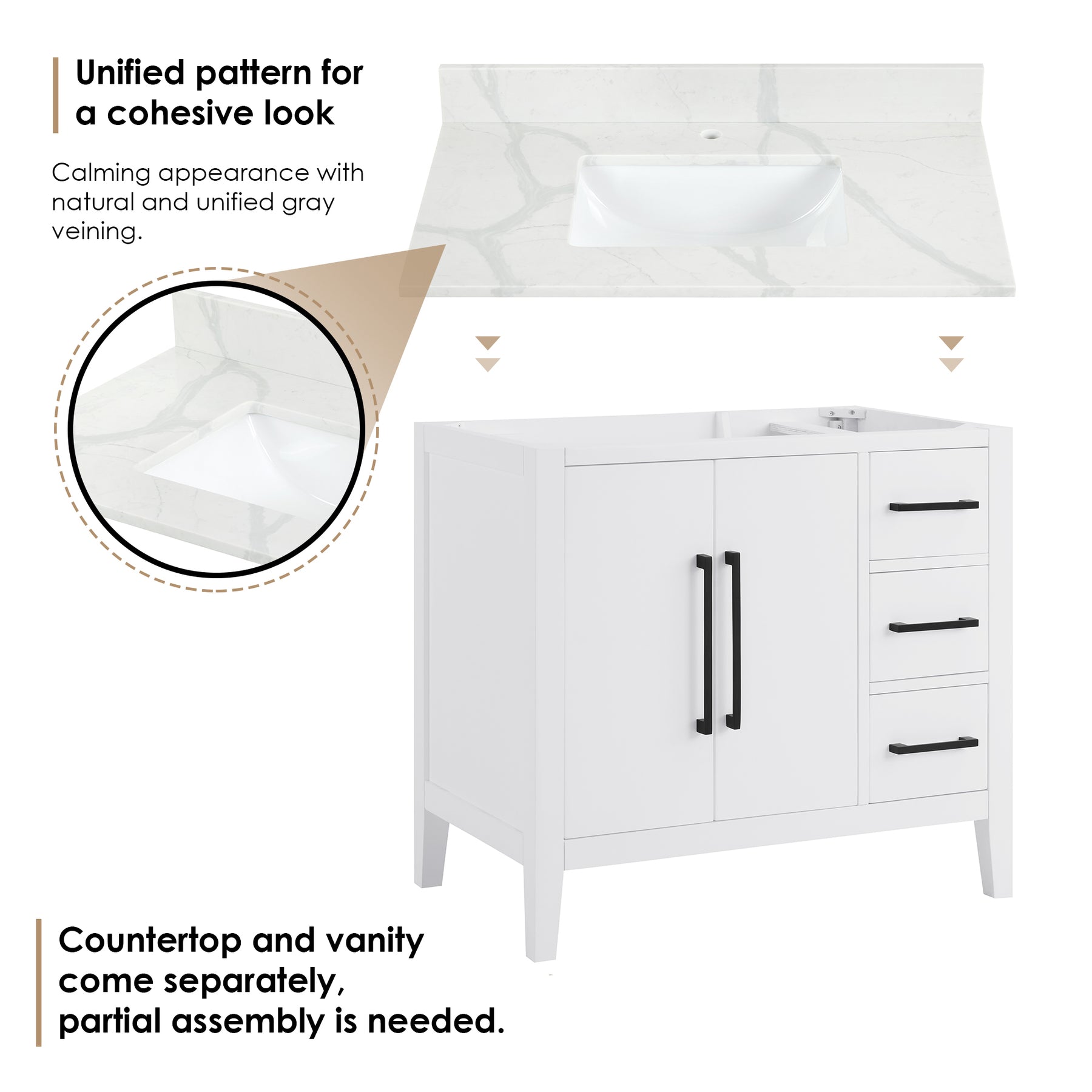 Accessories: Countertop and backsplash are included but come separately, partial assembly is needed.