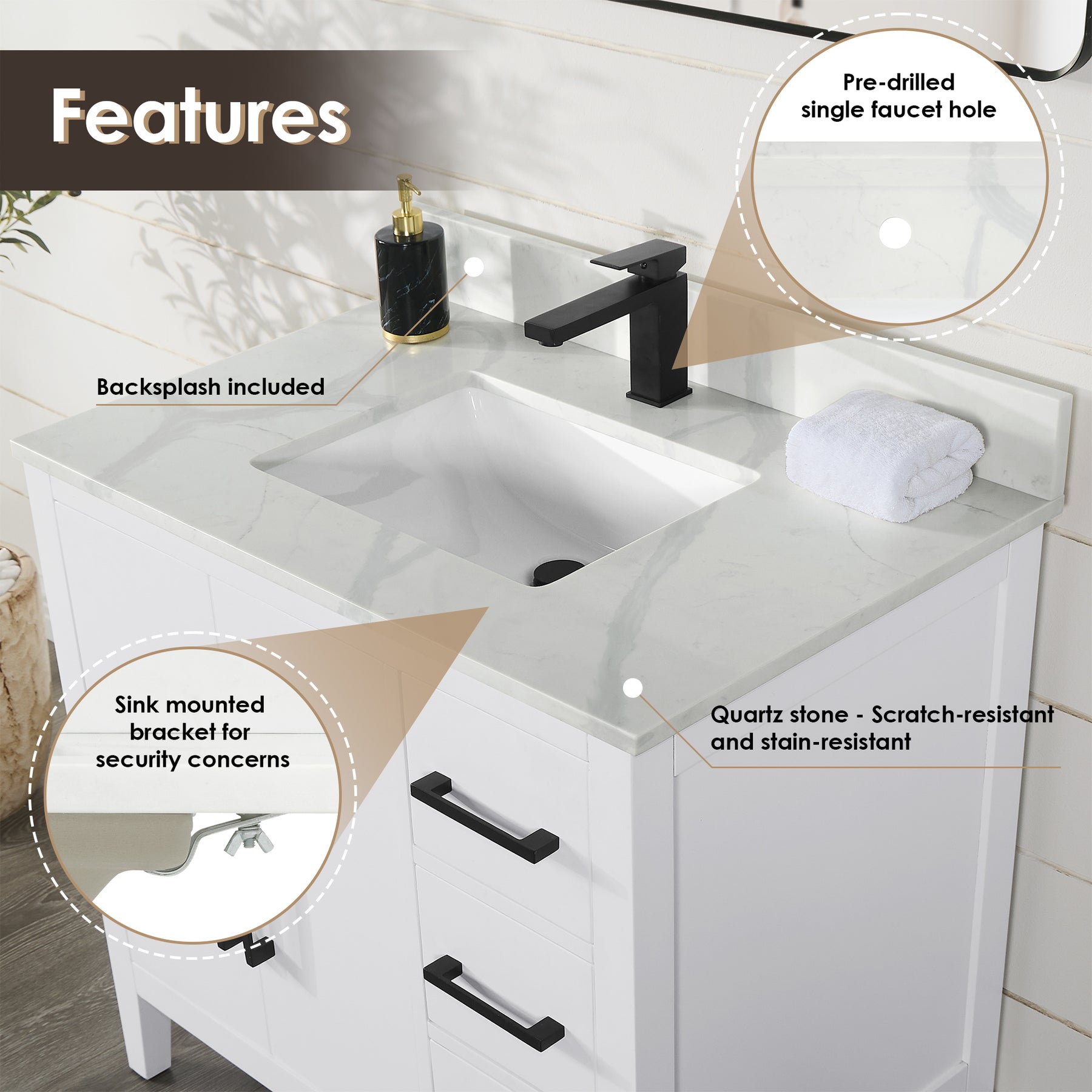 Faucet Type: Countertop comes with pre-drilled single faucet hole for installation convenience.